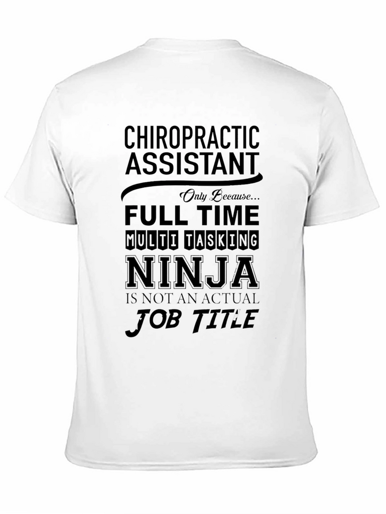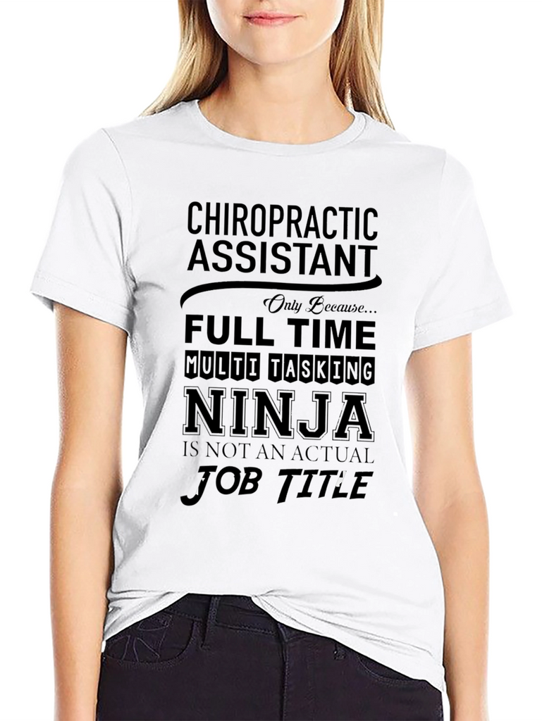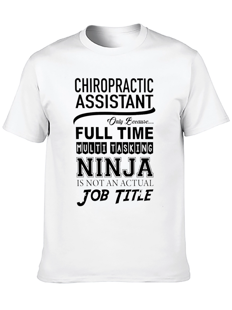 This black t-shirt features a humorous design for chiropractic assistants. The text reads "Chiropractic Assistant" followed by "Only because...Full Time Multi Tasking Ninja is not an actual Job Title." The design is printed in a distressed font, giving it a vintage look. Ideal for wearing at work or casually, this shirt is a fun way to showcase your role with a touch of humor. A great gift for any Chiropractic Assistant who enjoys a laugh!