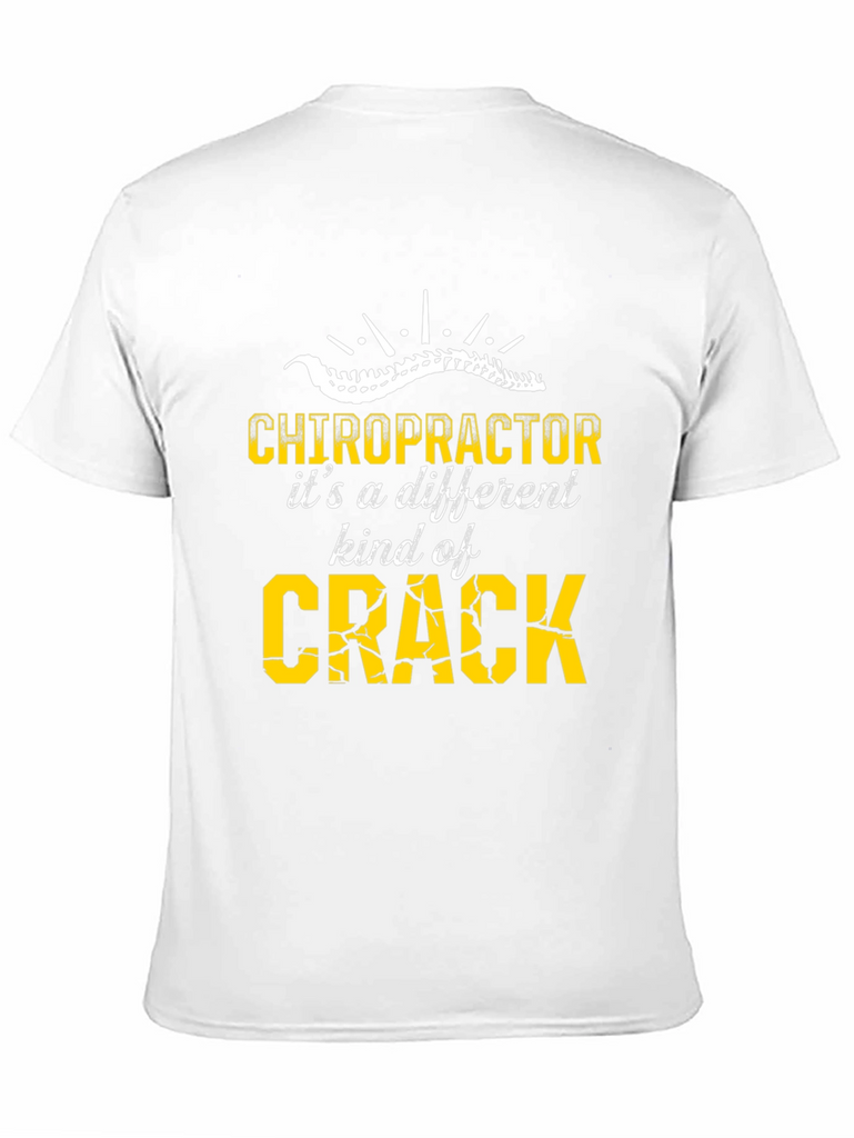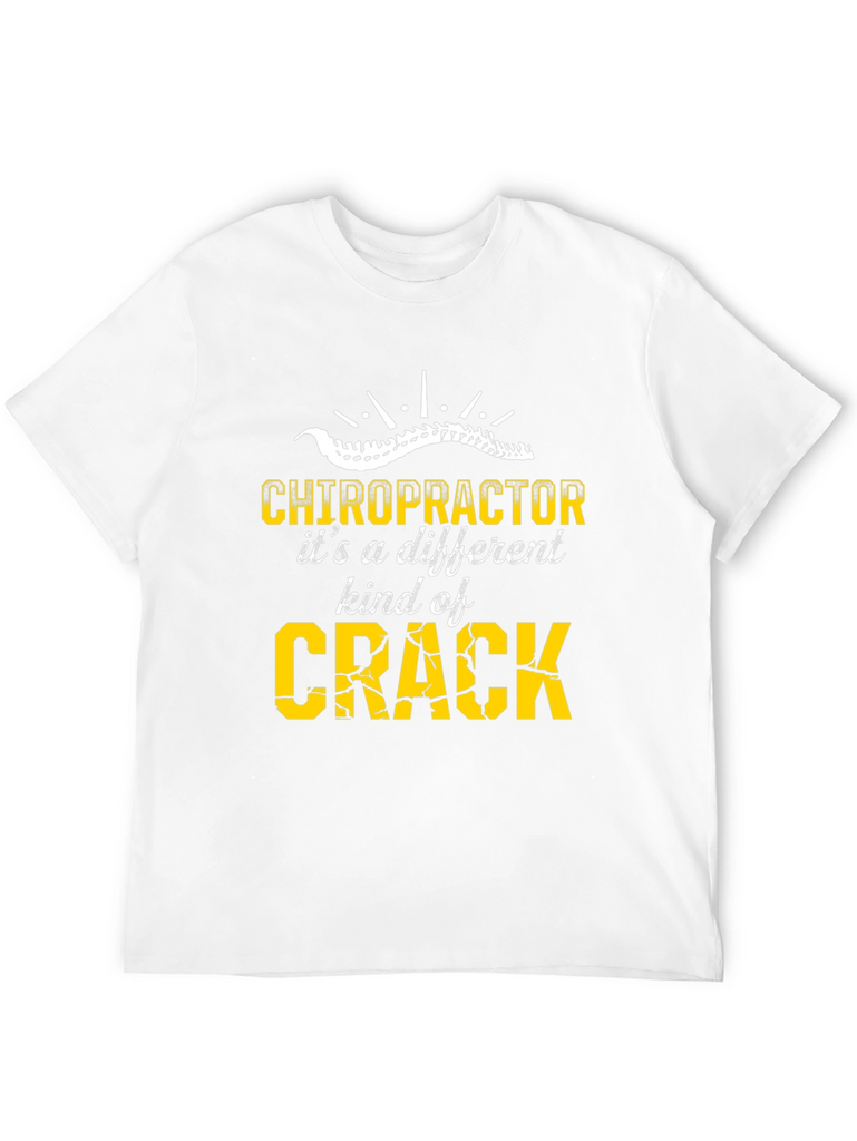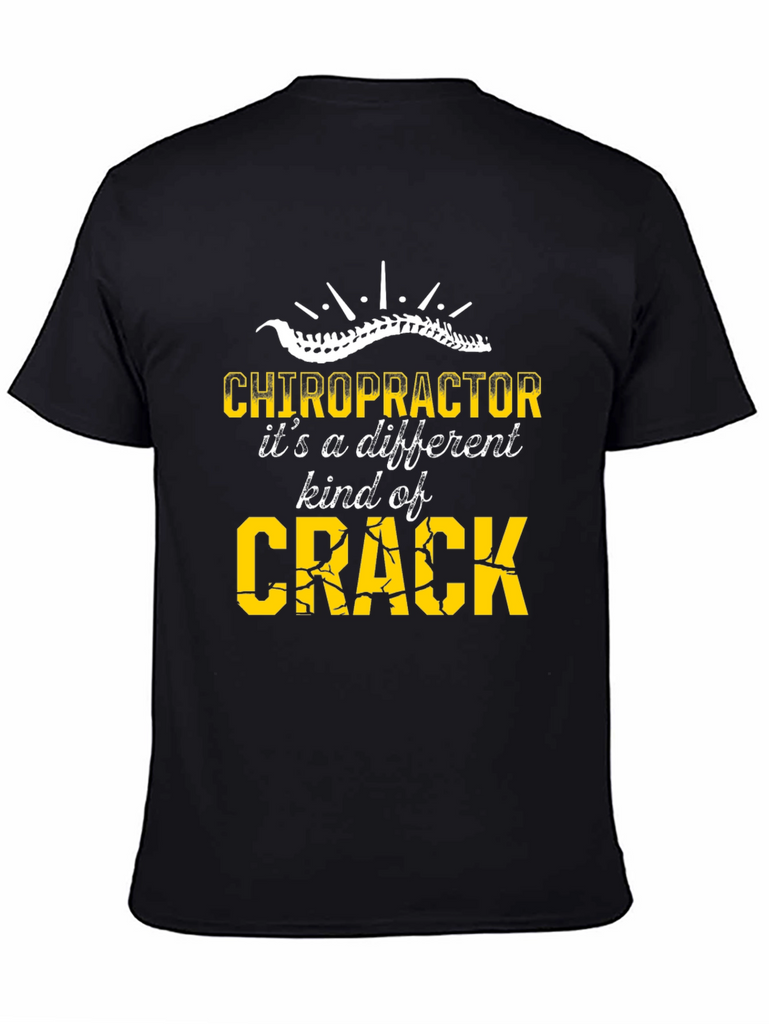 Show off your humorous side with this unique black graphic tee! Featuring the witty phrase "Chiropractor, it's a different kind of CRACK" in bold yellow lettering, it's sure to turn heads. Above the text, a white graphic of a spine adds a playful touch. This tee is perfect for chiropractors or anyone who appreciates a good pun. Made from comfortable, breathable fabric, it's ideal for everyday wear. Whether you're headed to work, running errands, or just relaxing at home, this tee is a fun way to express your personality and spark a conversation. Get yours today and let the world know you've got a great sense of humor!