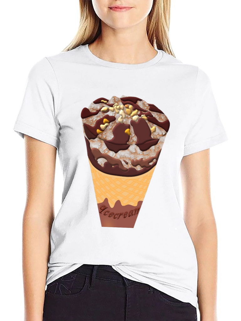 Indulge your sweet tooth with this playful black t-shirt featuring a bold chocolate ice cream cone graphic. The design showcases a rich, decadent ice cream cone with layers of chocolate and nuts. The cone has the word "Icecream" on it. Made from a comfortable fabric, this tee is perfect for casual wear, ice cream lovers, and anyone with a fun sense of style. Pair it with your favorite jeans or shorts for a relaxed look. A great conversation starter and a must-have for your summer wardrobe. Show off your love for treats with this unique and eye-catching t-shirt!