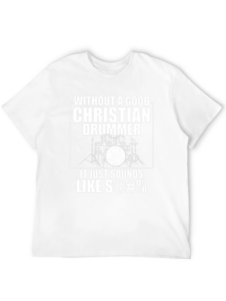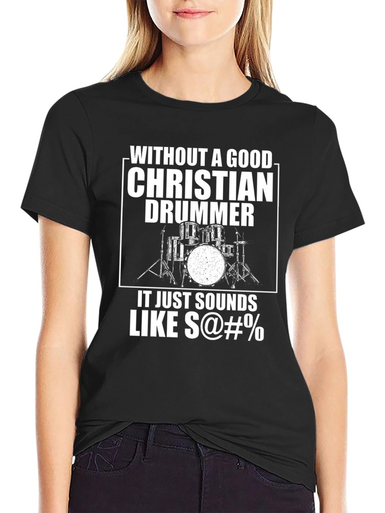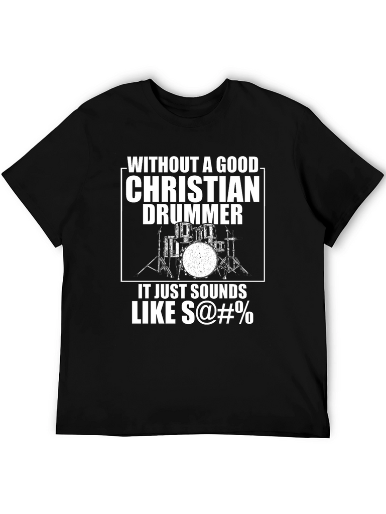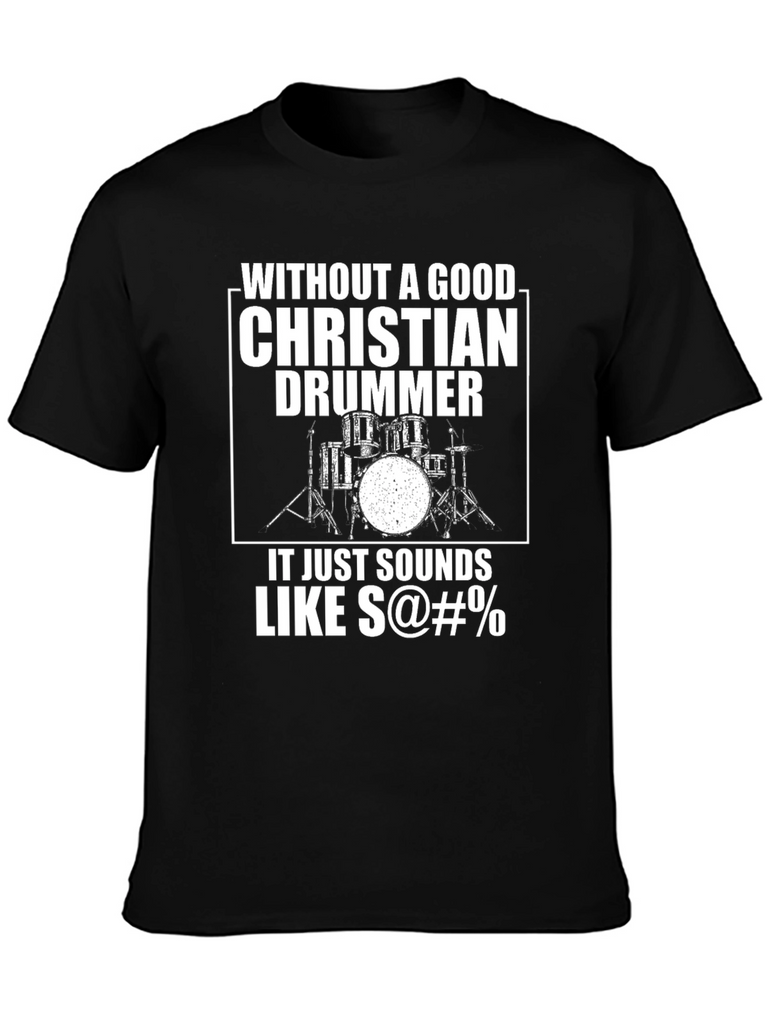 Rock your faith and rhythm with this unique black t-shirt! Featuring a humorous design that reads "WITHOUT A GOOD CHRISTIAN DRUMMER IT JUST SOUNDS LIKE S@#%," this tee is perfect for Christian musicians and drumming enthusiasts with a sense of humor. The design also includes a white image of a drum set. Made from what appears to be a soft and comfortable fabric, this shirt is ideal for casual wear, band practice, or church events. Show off your passion for music and your faith with this conversation-starting tee! Get yours today and let the world know you appreciate a good Christian drummer.