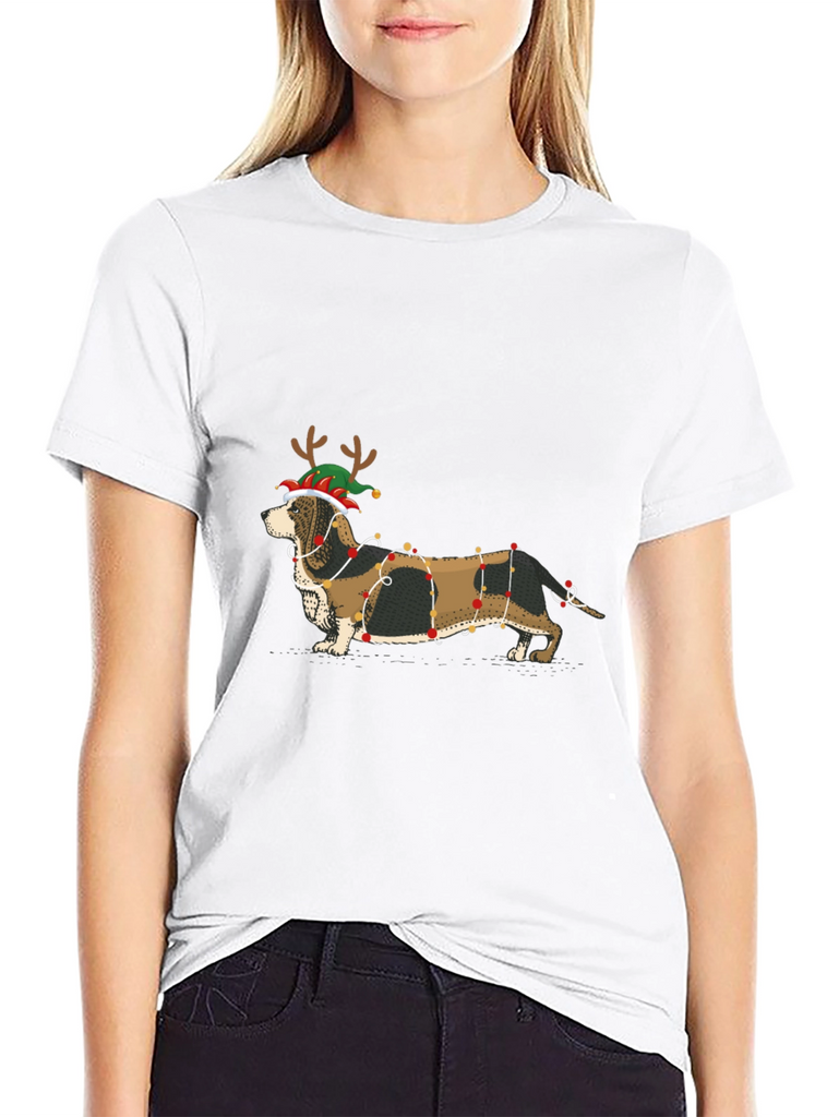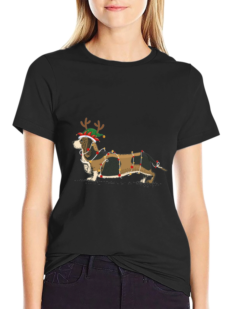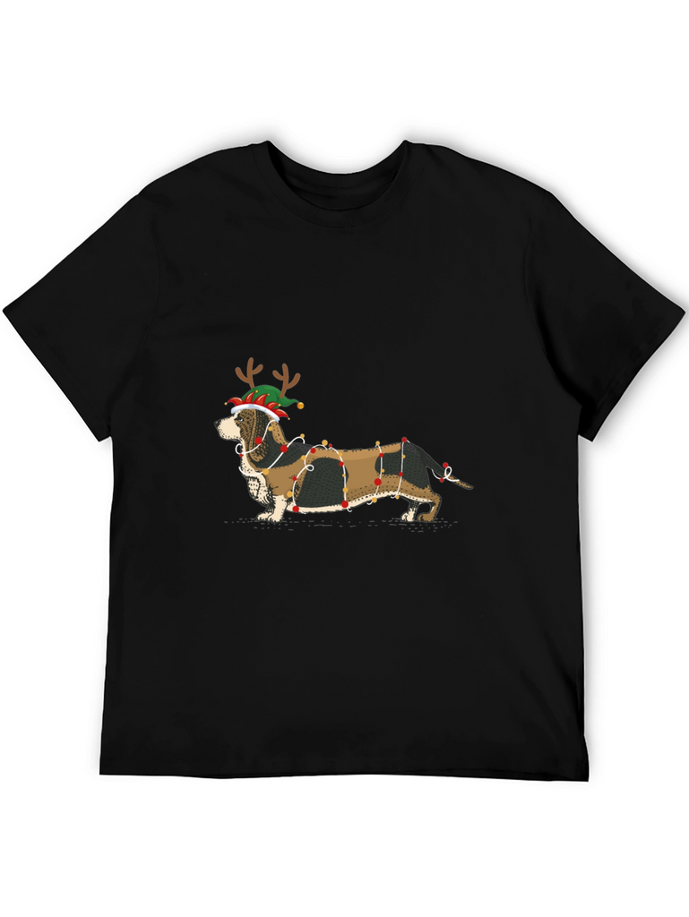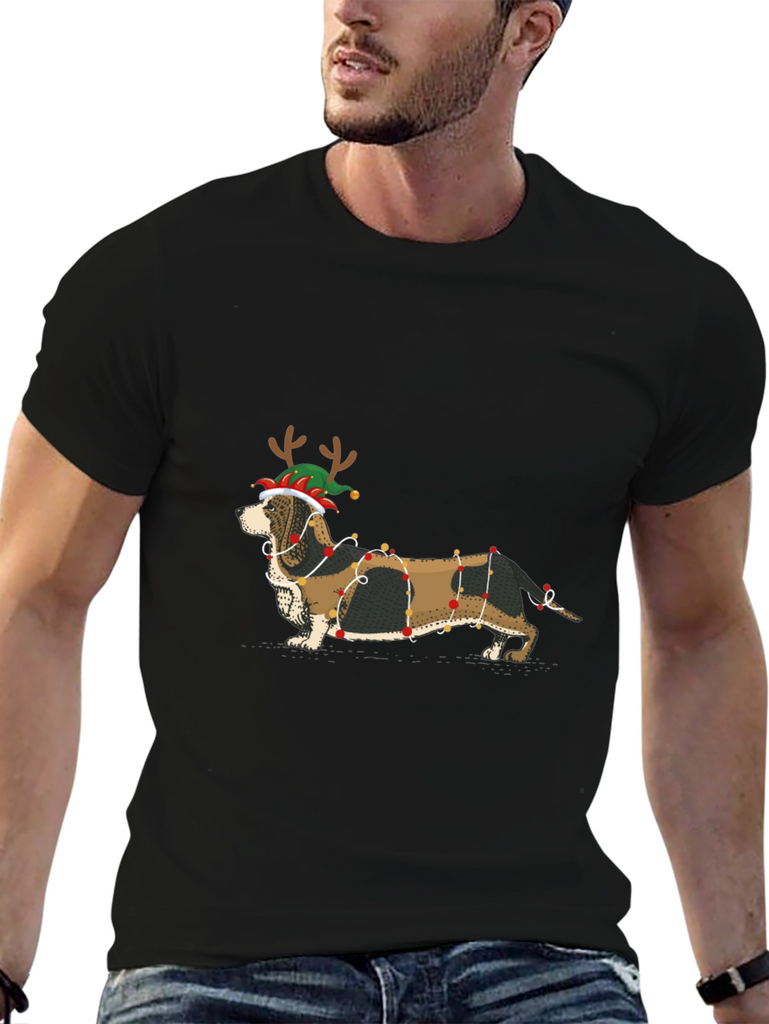 Get festive with this unique T-shirt featuring an adorable dachshund decked out in Christmas lights and a fun elf hat with reindeer antlers. The black short-sleeved shirt provides a stylish backdrop for the eye-catching graphic. Perfect for dog lovers and holiday enthusiasts alike, this tee is great for casual wear during the Christmas season, holiday parties, or simply to spread some cheer. Made from comfortable fabric, it's ideal for everyday wear and a fun conversation starter wherever you go. Add some festive flair to your wardrobe with this charming Christmas dog T-shirt!