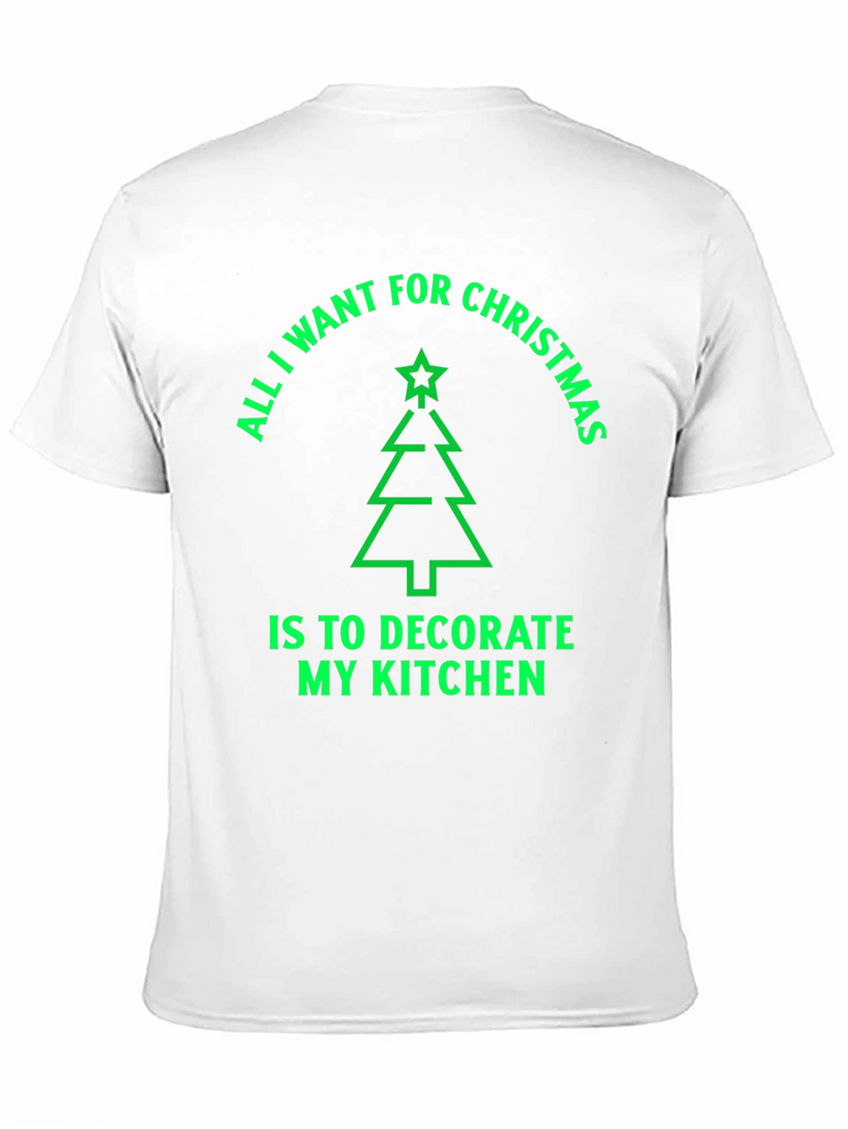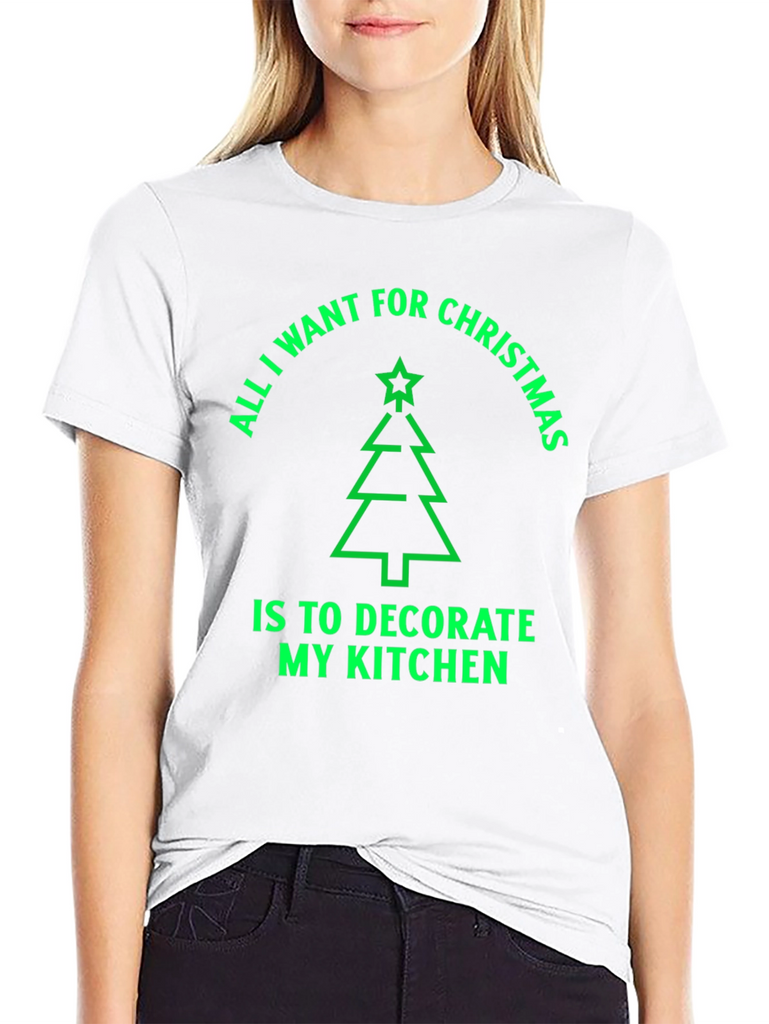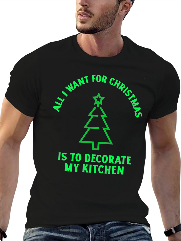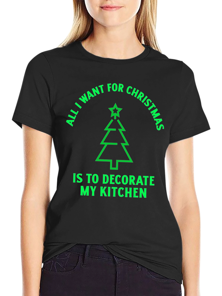Celebrate the holidays with this playful black t-shirt. Featuring a unique Christmas-themed design, the shirt displays a Christmas tree graphic and the humorous statement: "All I want for Christmas is to decorate my kitchen." The text and tree are printed in a vibrant green, creating a striking contrast against the black fabric. Made from what appears to be soft, breathable cotton, it offers a comfortable fit for everyday wear. This t-shirt is perfect for festive gatherings, holiday parties, or as a fun gift for the home decor enthusiast in your life. Wear your love for interior design this Christmas season!