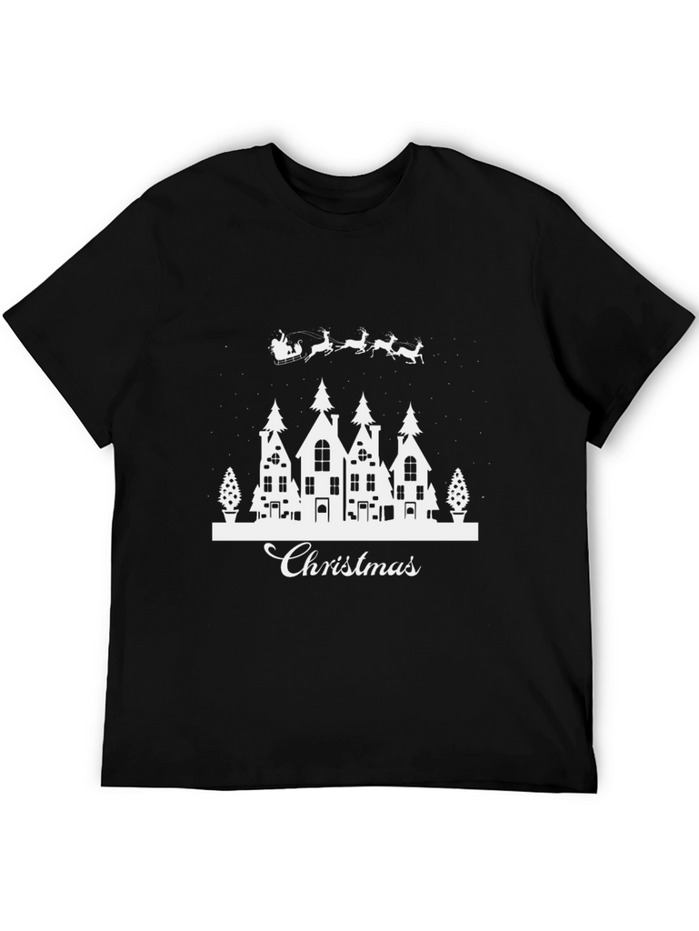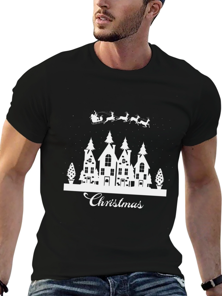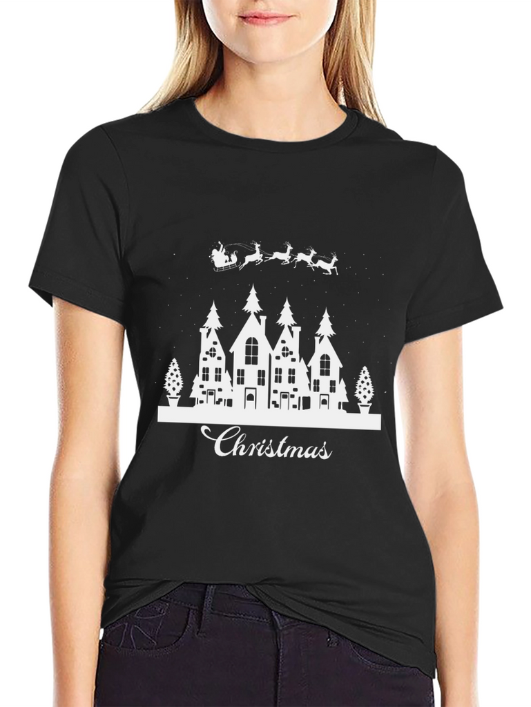 Embrace the holiday spirit with this festive black t-shirt featuring a charming Christmas town design. The graphic showcases a quaint village silhouette with snow-covered houses, Christmas trees, and Santa's sleigh soaring through the sky. Made from a comfortable, breathable fabric, this tee is perfect for spreading cheer during Christmas gatherings, casual outings, or cozy nights by the fire. Show off your love for the holiday season with this unique and eye-catching Christmas town tee. A delightful addition to your wardrobe!