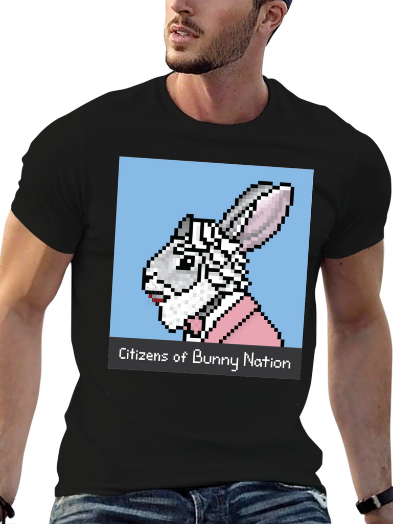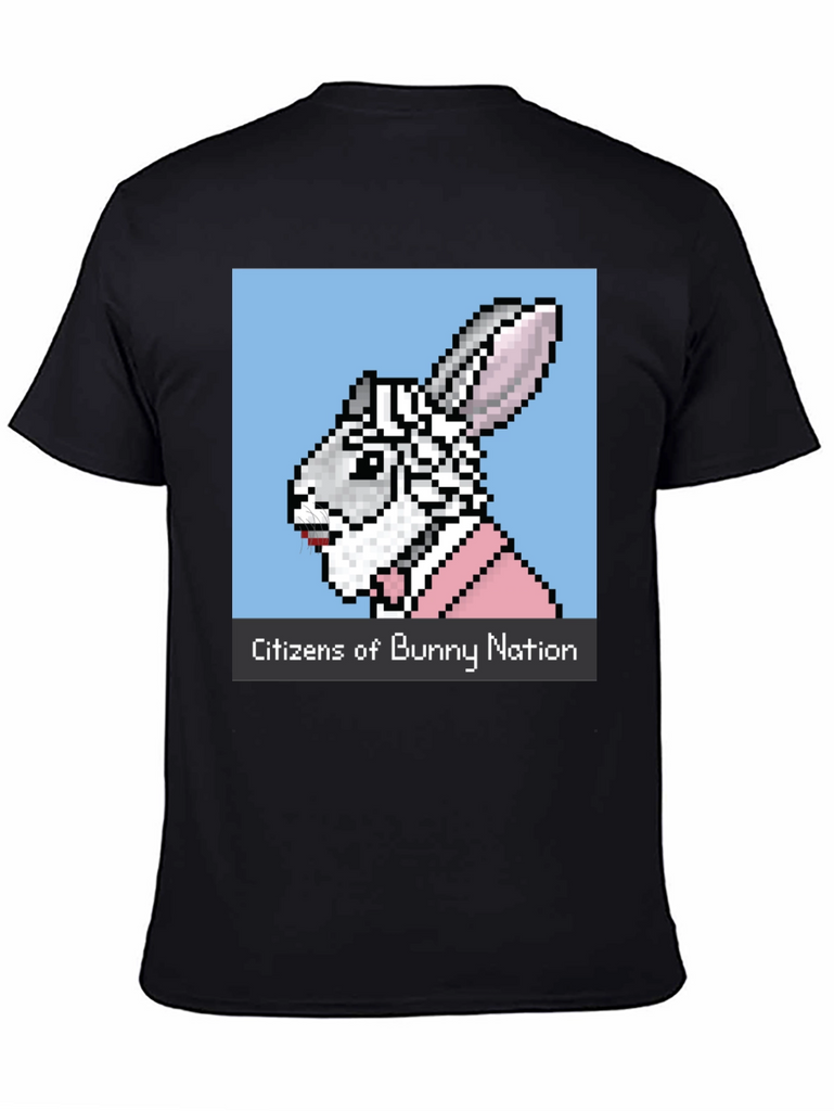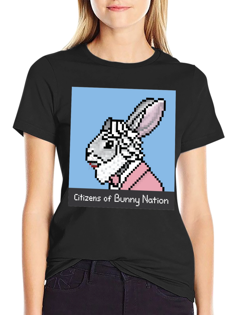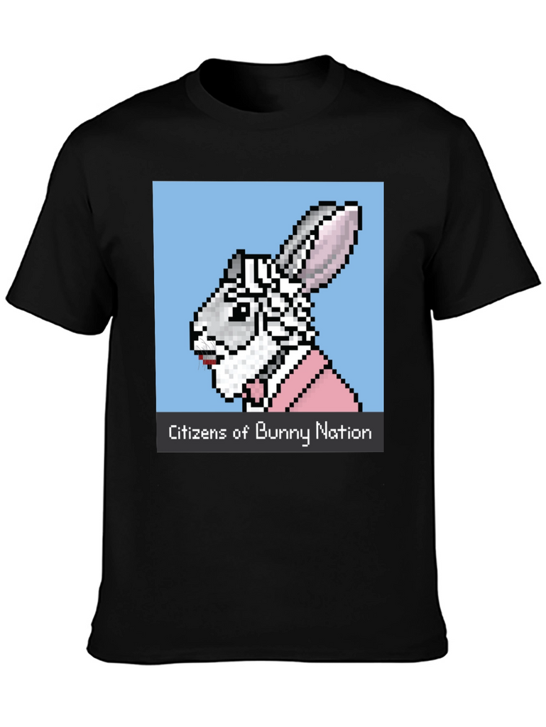 Show off your love for digital art with this unique t-shirt! Featuring a pixelated bunny design set against a light blue backdrop, this black tee is sure to turn heads. The bunny is wearing a pink top adding a splash of color to the design. Below the image, the words "Citizens of Bunny Nation" are printed in a clean, sans-serif font. Perfect for casual outings, gaming events, or just relaxing at home, this t-shirt is a must-have for any NFT enthusiast or bunny lover. Made with comfortable, breathable material.