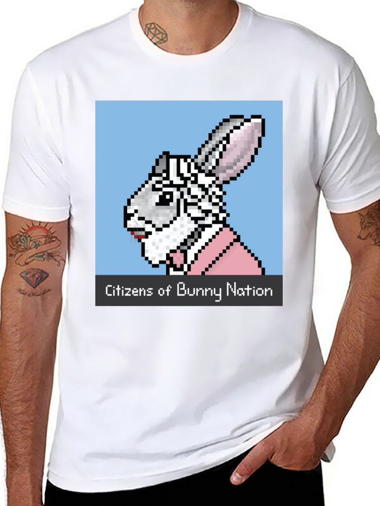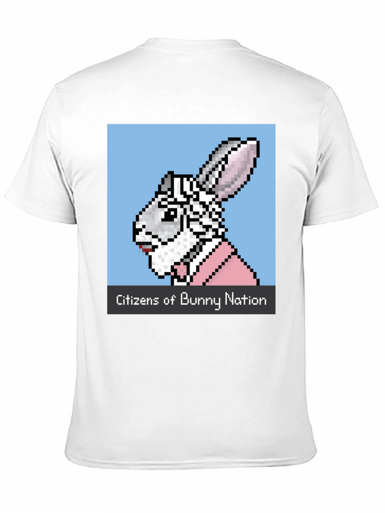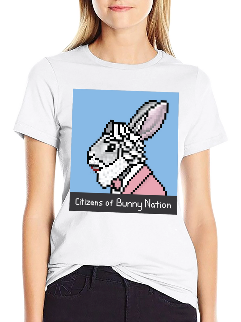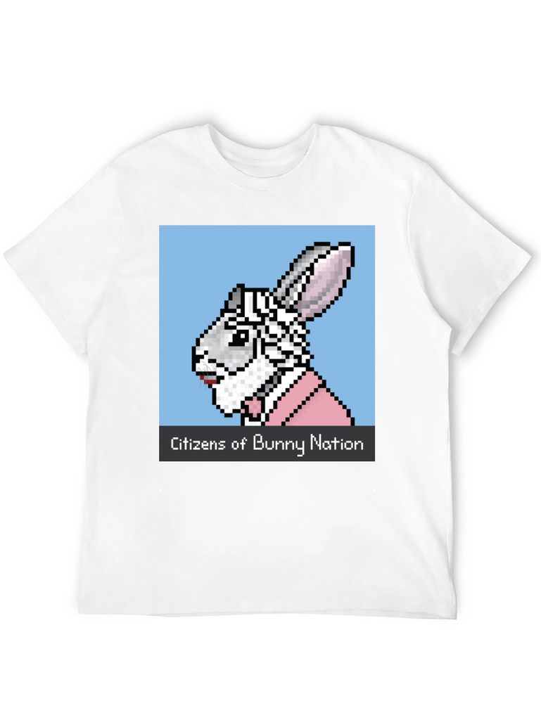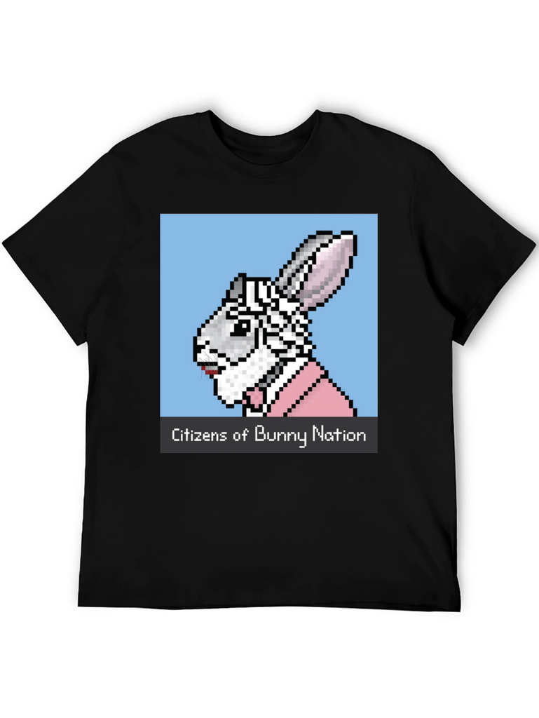 Show off your love for digital art with this unique t-shirt! Featuring a pixelated bunny design set against a light blue backdrop, this black tee is sure to turn heads. The bunny is wearing a pink top adding a splash of color to the design. Below the image, the words "Citizens of Bunny Nation" are printed in a clean, sans-serif font. Perfect for casual outings, gaming events, or just relaxing at home, this t-shirt is a must-have for any NFT enthusiast or bunny lover. Made with comfortable, breathable material.