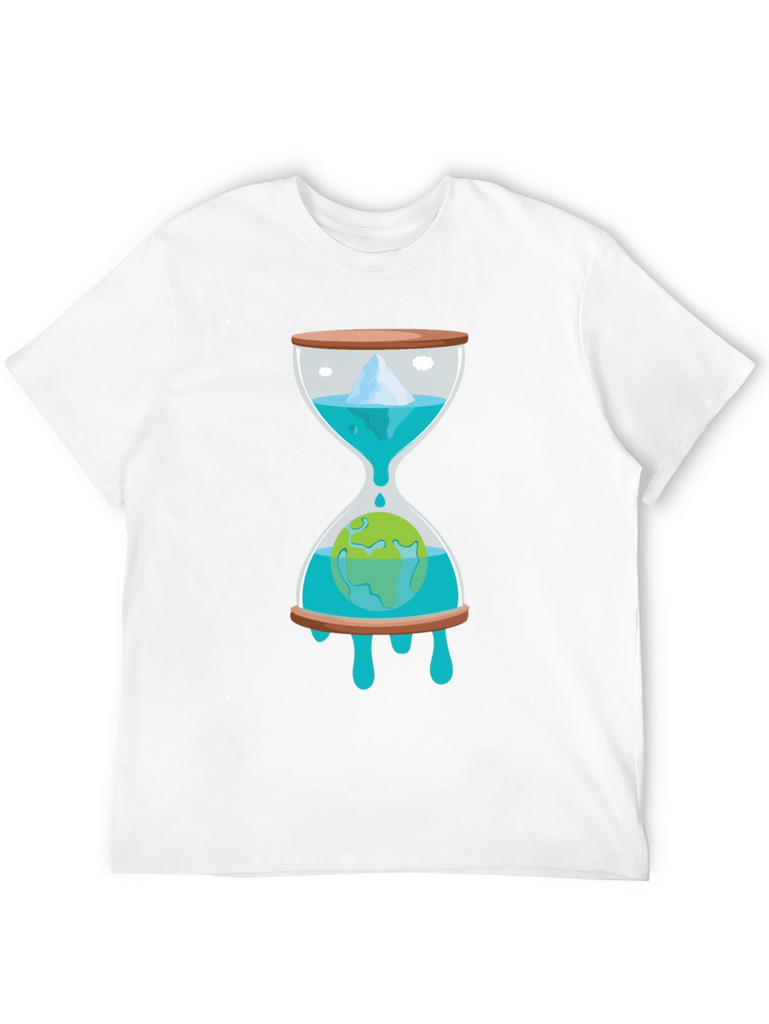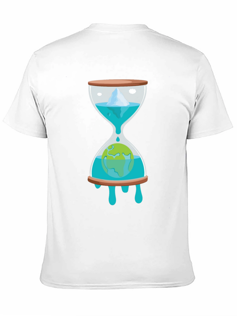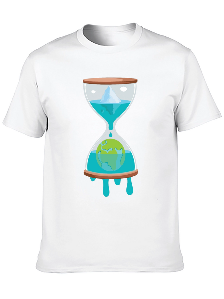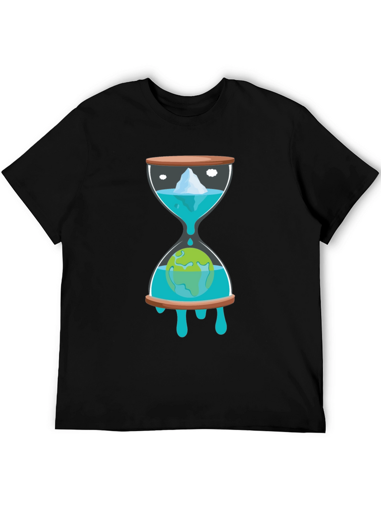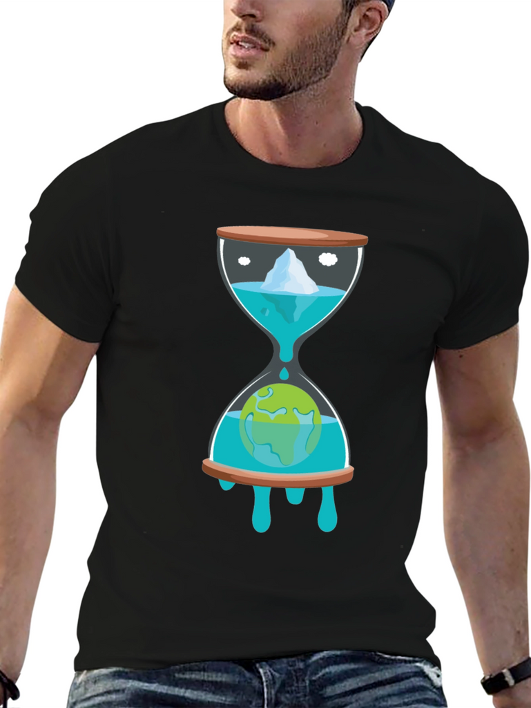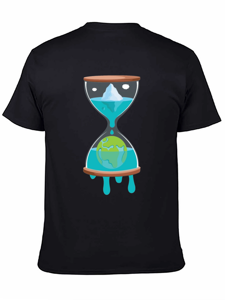 This unique black t-shirt features a compelling graphic symbolizing the urgency of climate change. The design showcases an hourglass with an iceberg melting into water above, slowly dripping onto the Earth below. The visual metaphor effectively conveys the shrinking time we have to address global warming. Made from a soft, comfortable fabric, this shirt is perfect for everyday wear and expressing your concern for the planet. Make a statement and spark conversations with this eye-catching tee. A great addition to any environmentally conscious wardrobe.