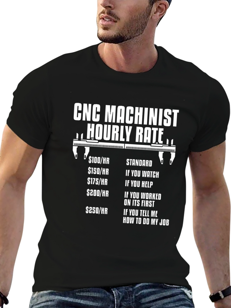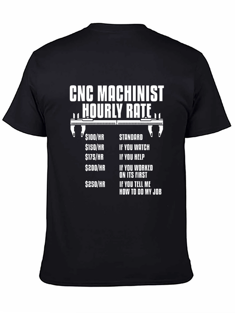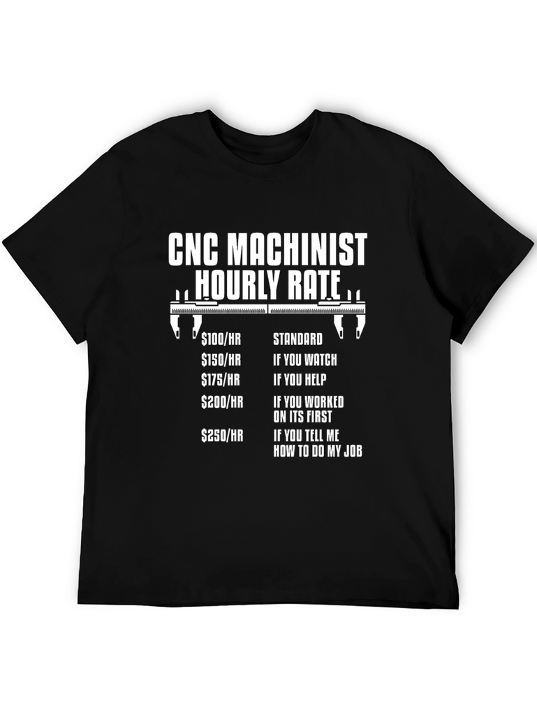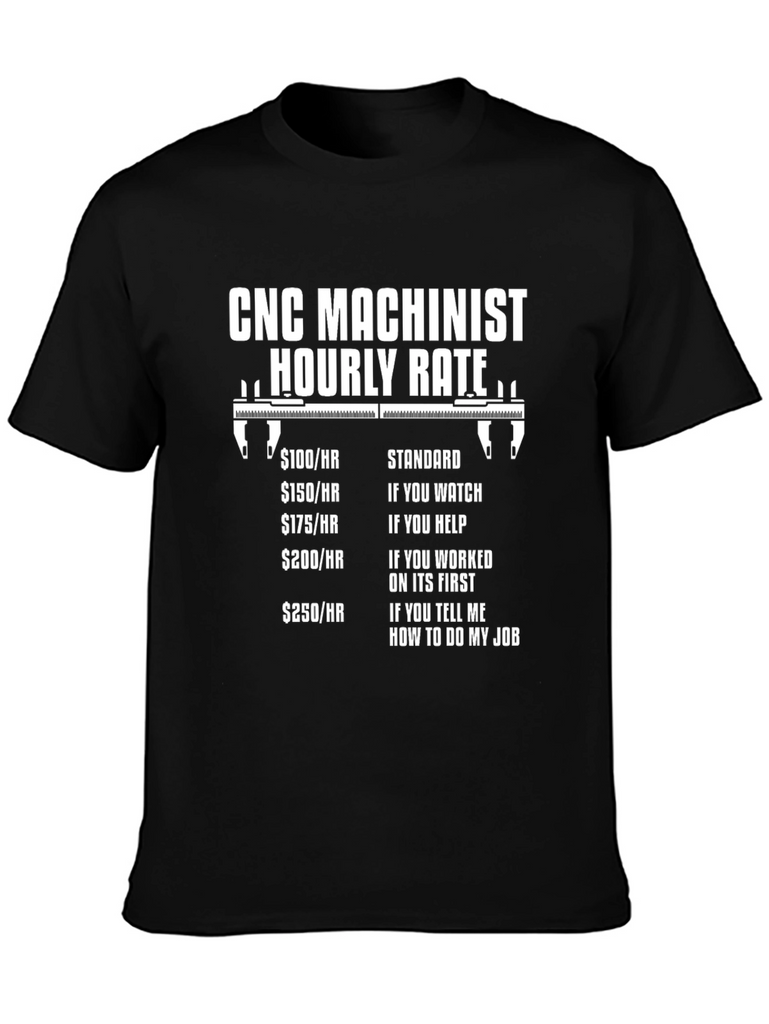 Showcase your skills with this CNC Machinist Hourly Rate T-Shirt. This unique t-shirt features the words CNC Machinist Hourly Rate above a tool graphic and a humorous breakdown of hourly rates depending on the assistance provided. Made from comfortable, breathable fabric, it's perfect for everyday wear at work or casual outings. The bold design and witty message make it a great conversation starter and a fun way to express your expertise in the field. A perfect gift for CNC machinists who appreciate a touch of humor in their wardrobe.