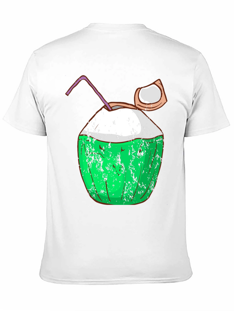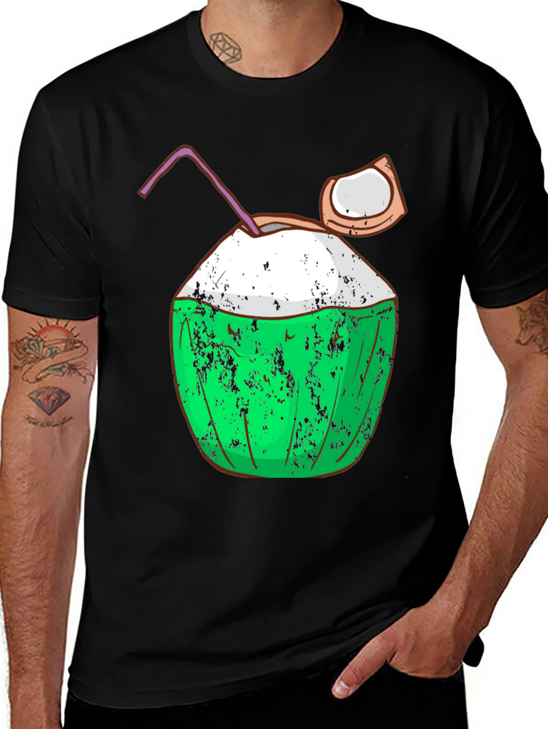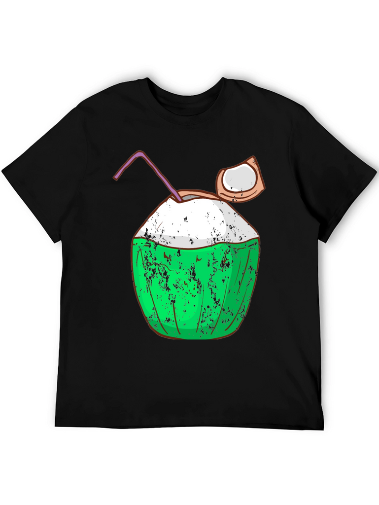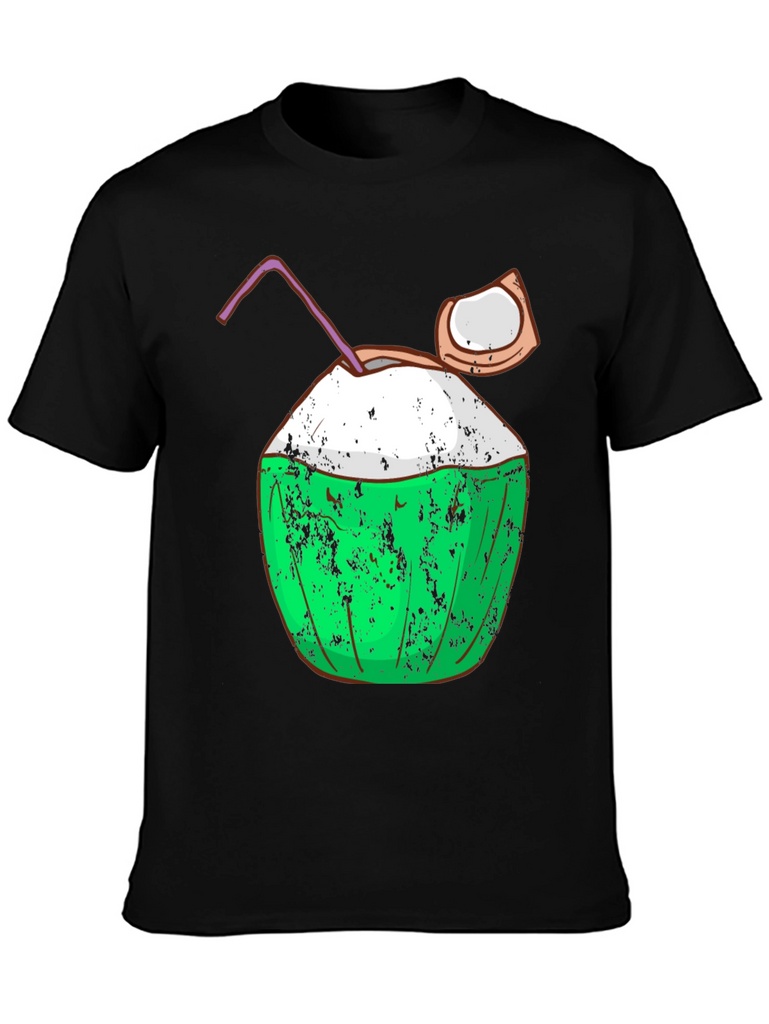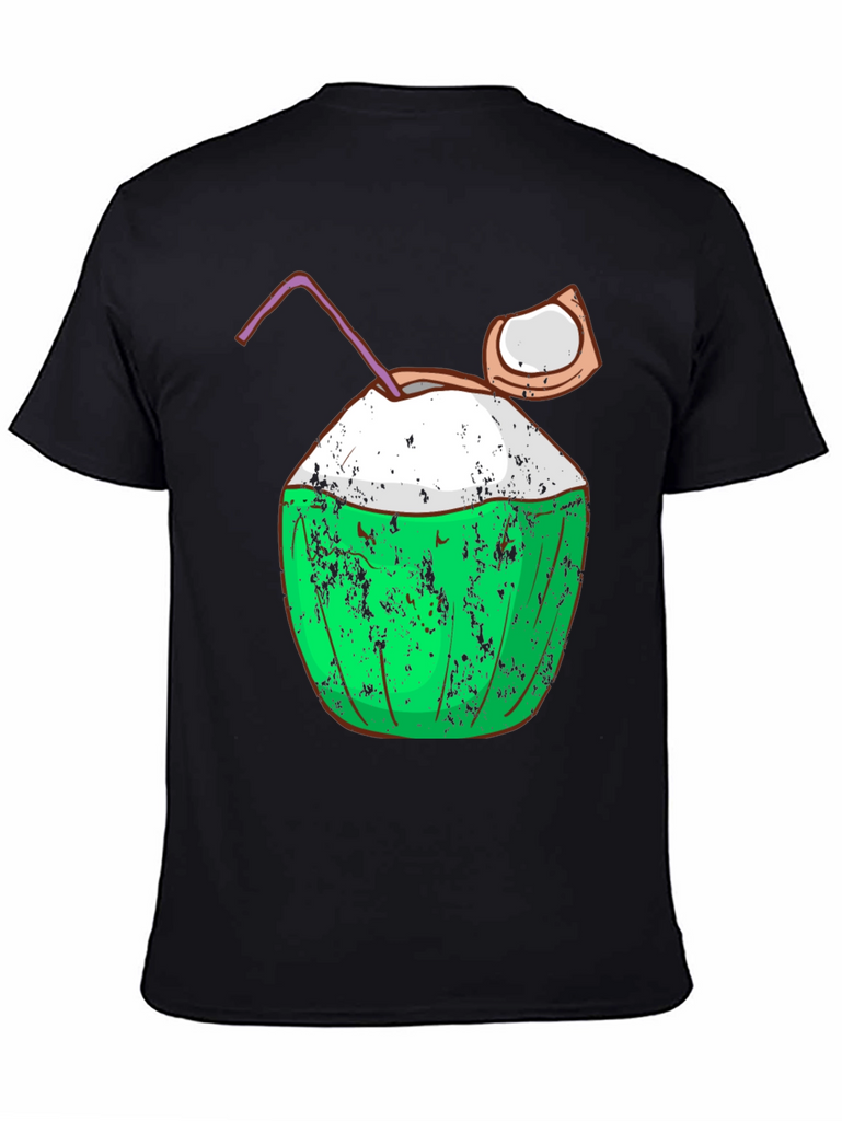 Embrace the island life with this fun and stylish black t-shirt featuring a vibrant coconut graphic. The design includes a green coconut with a textured, slightly distressed effect, a creamy white top, a playful straw, and a piece of coconut on the side, all adding to its quirky charm. Made from what appears to be soft, breathable fabric, this tee offers both comfort and a cool, casual look. Perfect for beach days, summer parties, or simply expressing your love for tropical vibes. Pair it with shorts or jeans for an effortlessly stylish outfit.