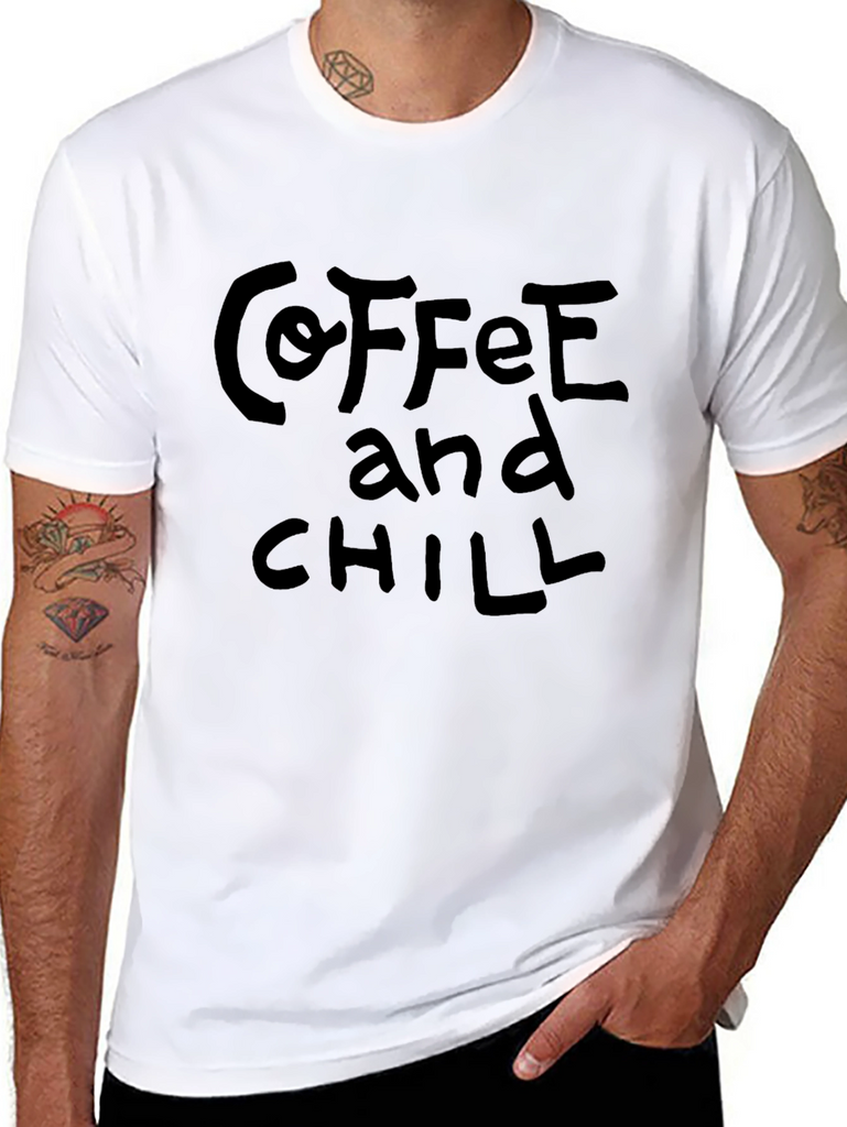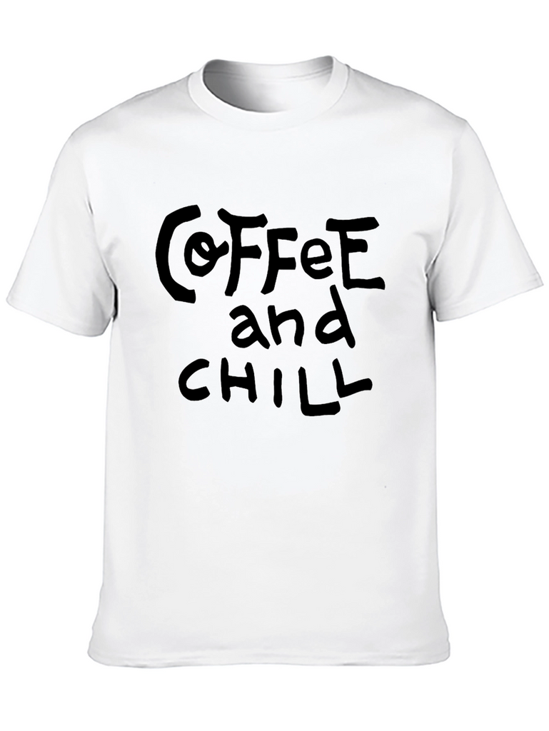 This classic black t-shirt features a playful "Coffee and Chill" graphic print, perfect for relaxed, casual wear. The tee appears to be made of a soft, comfortable cotton blend. The simple design makes it versatile for pairing with jeans, shorts, or joggers. Ideal for coffee lovers, weekend lounging, or casual outings. This T-shirt combines comfort and style seamlessly. The dark color is easy to pair with any color. Grab this comfortable and stylish tee today!