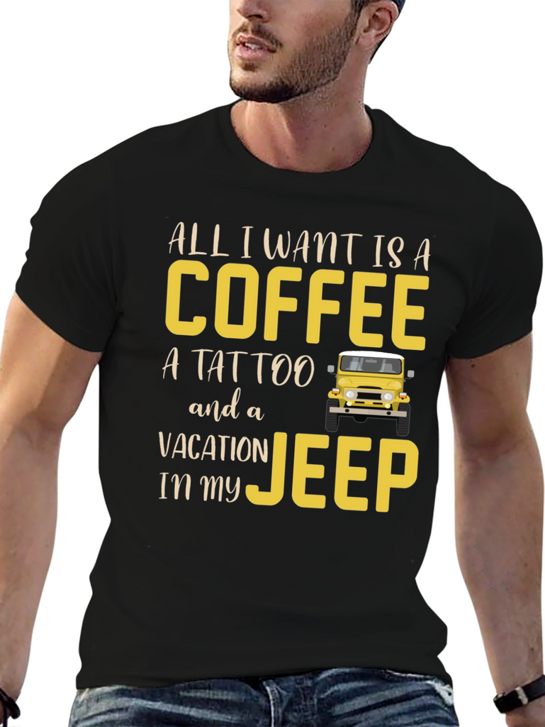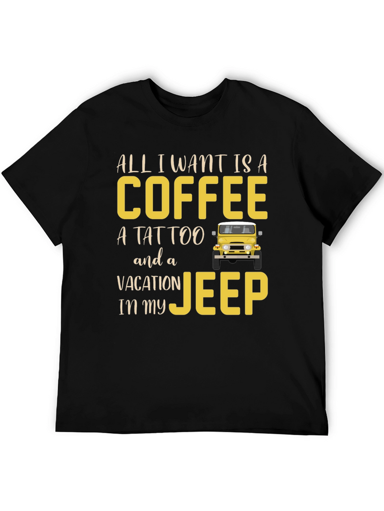 This black t-shirt features a fun and quirky design, perfect for Jeep enthusiasts. The graphic includes the phrase "All I want is a Coffee, a Tattoo and a Vacation in my Jeep," with the words "Coffee" and "Jeep" emphasized in a bold yellow font. A small illustration of a yellow Jeep is nestled between the words. Made from a soft, comfortable fabric, this tee is ideal for casual wear. It's a great conversation starter and a perfect way to show off your love for coffee, tattoos, and Jeep adventures. Wear it on your next road trip or weekend getaway!
