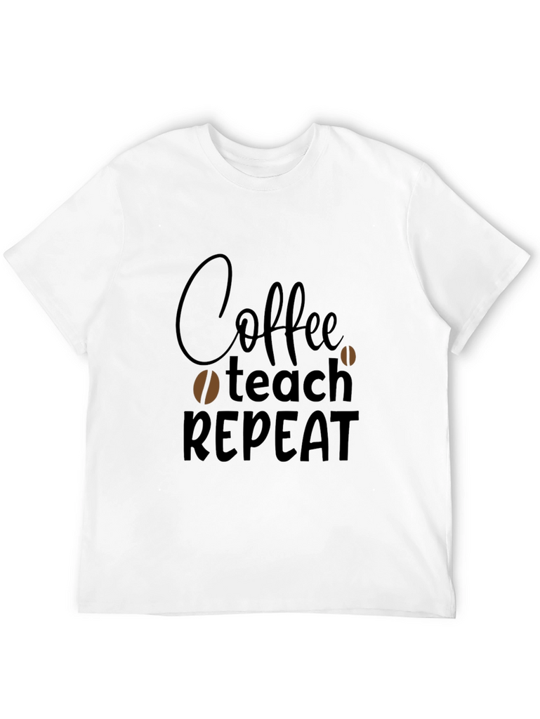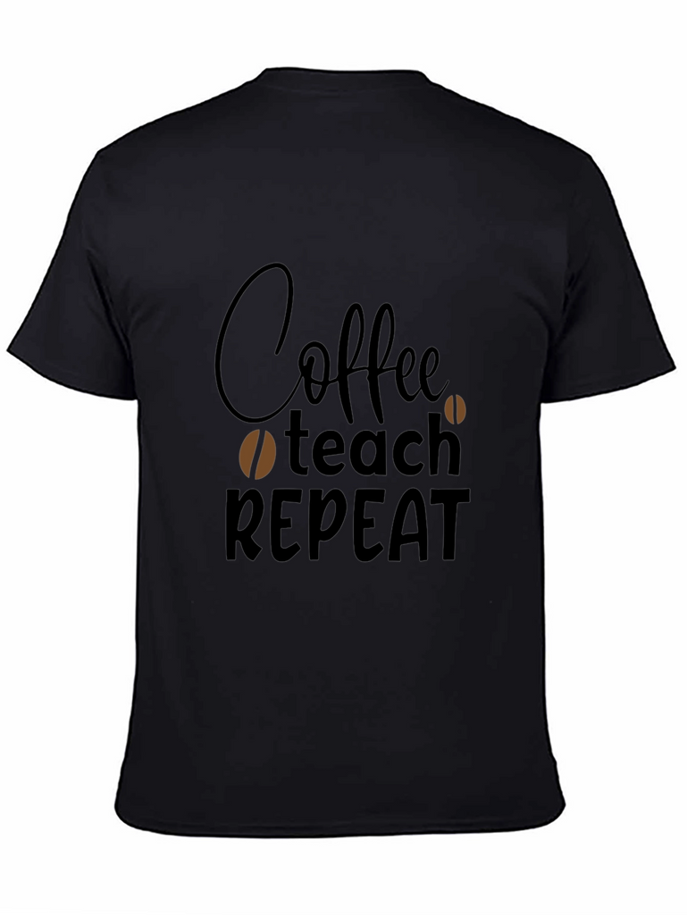 This black t-shirt features a stylish graphic design that speaks to coffee-loving educators. The design incorporates the words "Coffee Teach Repeat," with coffee bean accents. Made from a soft, comfortable fabric, this tee is perfect for everyday wear, whether you're in the classroom, at a coffee shop, or simply relaxing at home. Its classic fit makes it a versatile addition to any wardrobe. Show off your passion for teaching and coffee with this unique and eye-catching t-shirt. It's an ideal gift for teachers or anyone who appreciates a good cup of coffee!