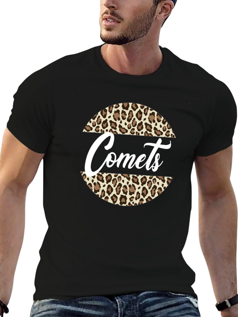 Show off your school spirit with this stylish black t-shirt featuring a trendy leopard print design. The word "Comets" is prominently displayed in a sleek, white script across the center. Perfect for students, alumni, or anyone who wants to support their team in style. Made from a comfortable and durable fabric, this t-shirt is ideal for everyday wear, game days, or casual outings. The bold design ensures you'll stand out from the crowd while representing your favorite team. Get yours today and wear your pride!