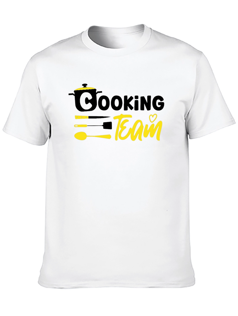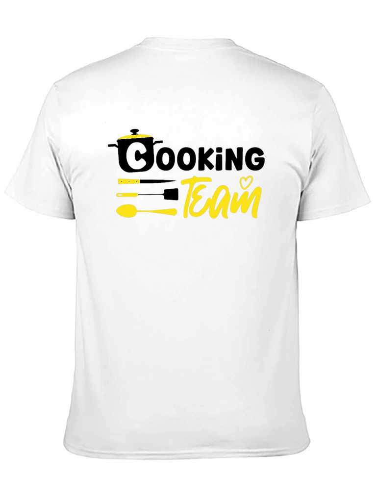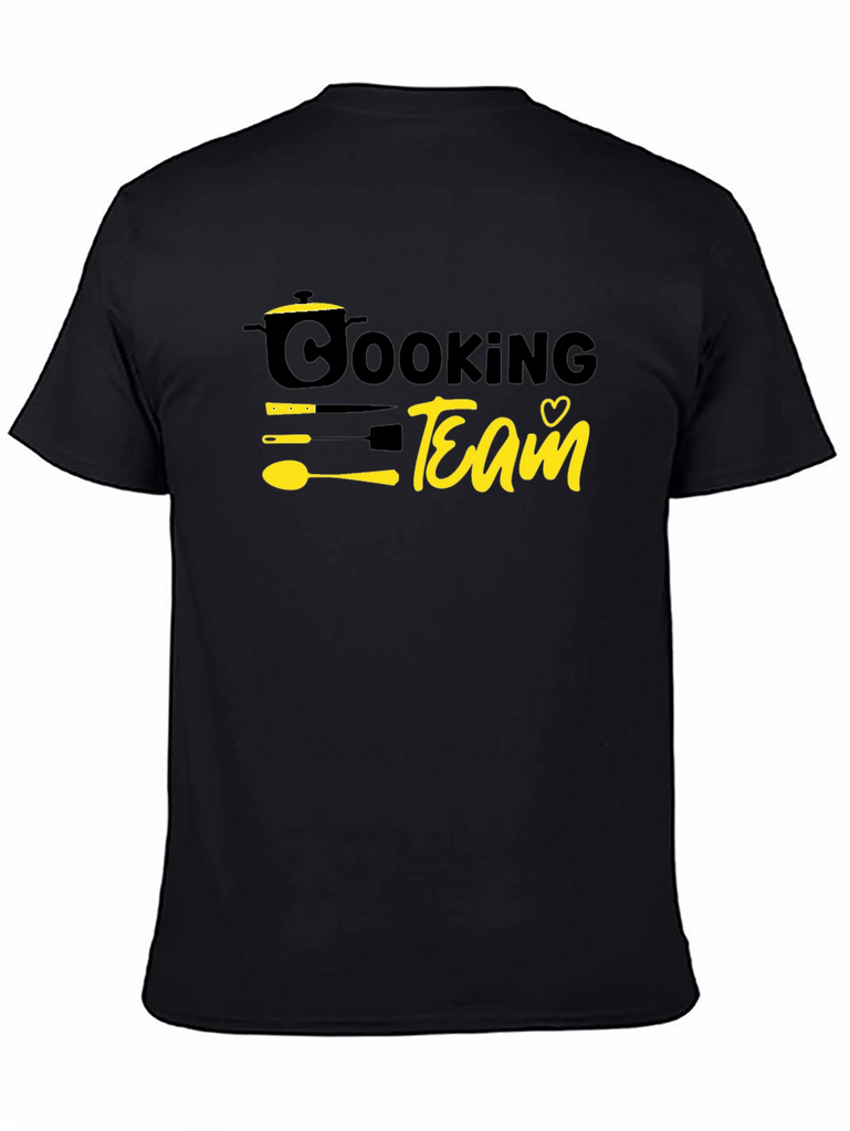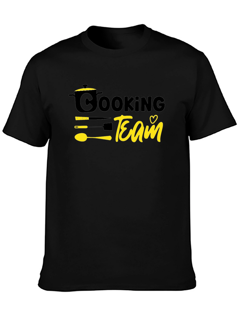 Show your love for cooking with this stylish black t-shirt. The design features a playful graphic with the words "Cooking Team" alongside a pot, utensils, and a heart. Made from comfortable, breathable material, this tee is perfect for wearing while whipping up your favorite recipes in the kitchen or hanging out with fellow foodies. The bold yellow graphics are on a solid black background. This tee is a must-have for anyone passionate about cooking and culinary arts. A fun and unique addition to your casual wardrobe, this tee also makes a great gift for the chef in your life!