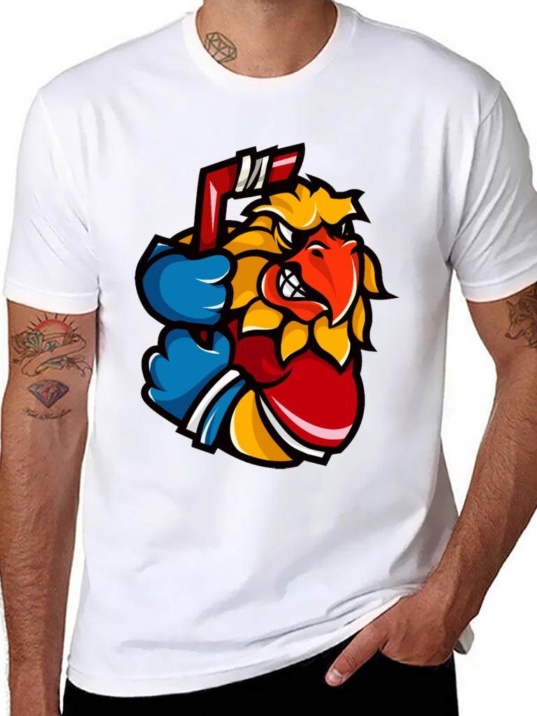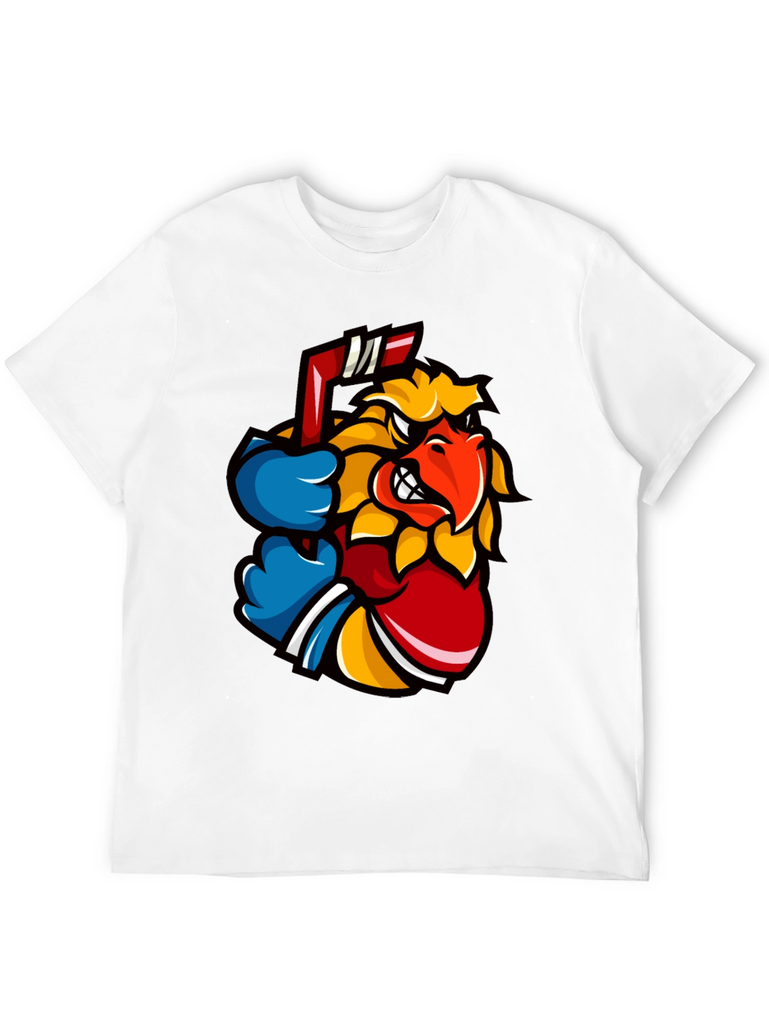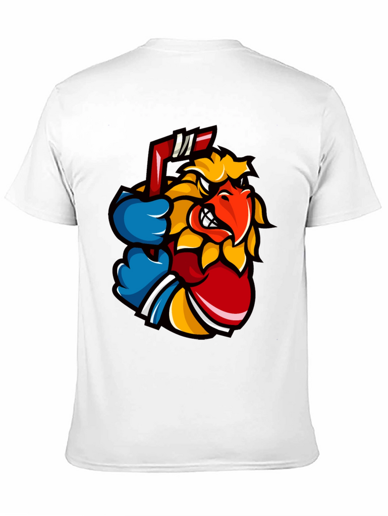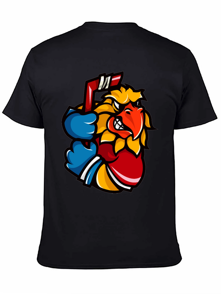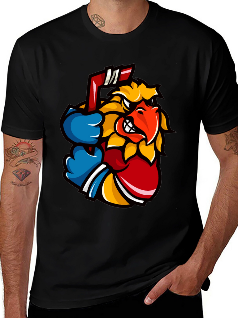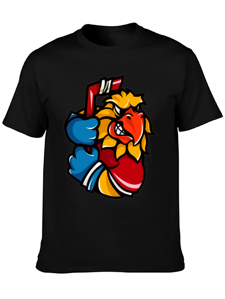 Show off your wild side with this eye-catching black t-shirt. The shirt features a vibrant graphic of an animated bird character, complete with a determined expression and a hockey stick. The design incorporates bold colors like yellow, red, and blue, making it pop against the black background. Made from a soft, comfortable fabric, this tee is perfect for casual wear, sports events, or just expressing your unique style. Pair it with jeans or shorts for an effortlessly cool look. Ideal for hockey fans or anyone who loves stand-out graphics. Get yours today and let your personality shine!