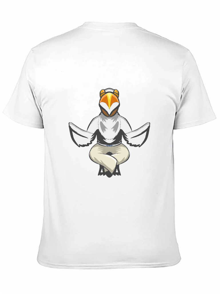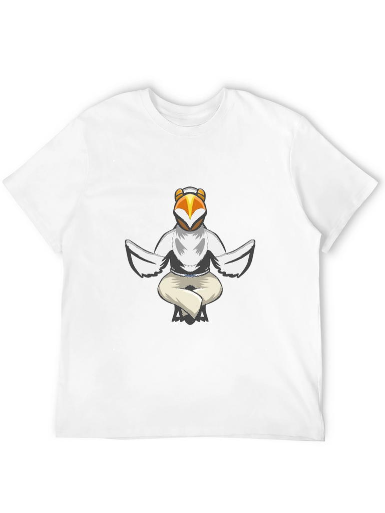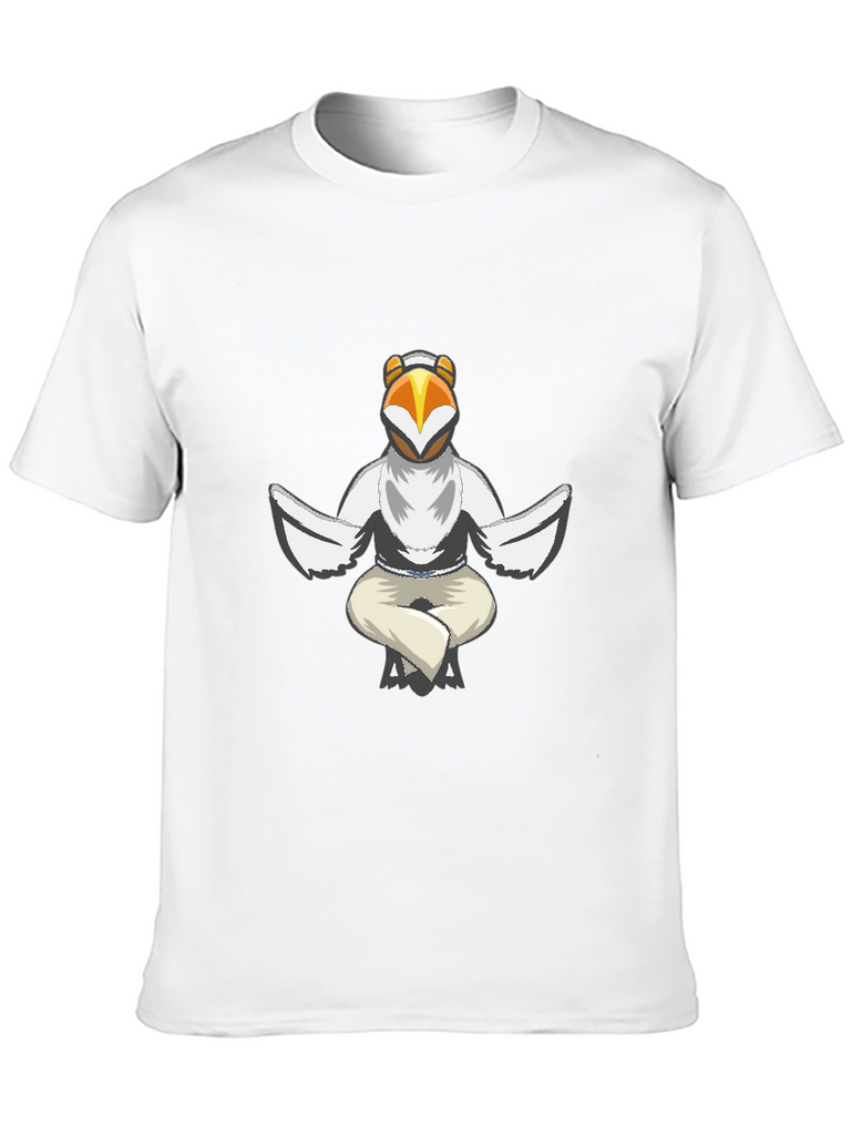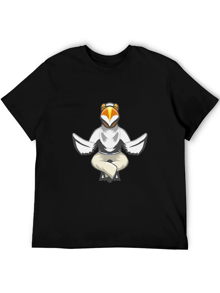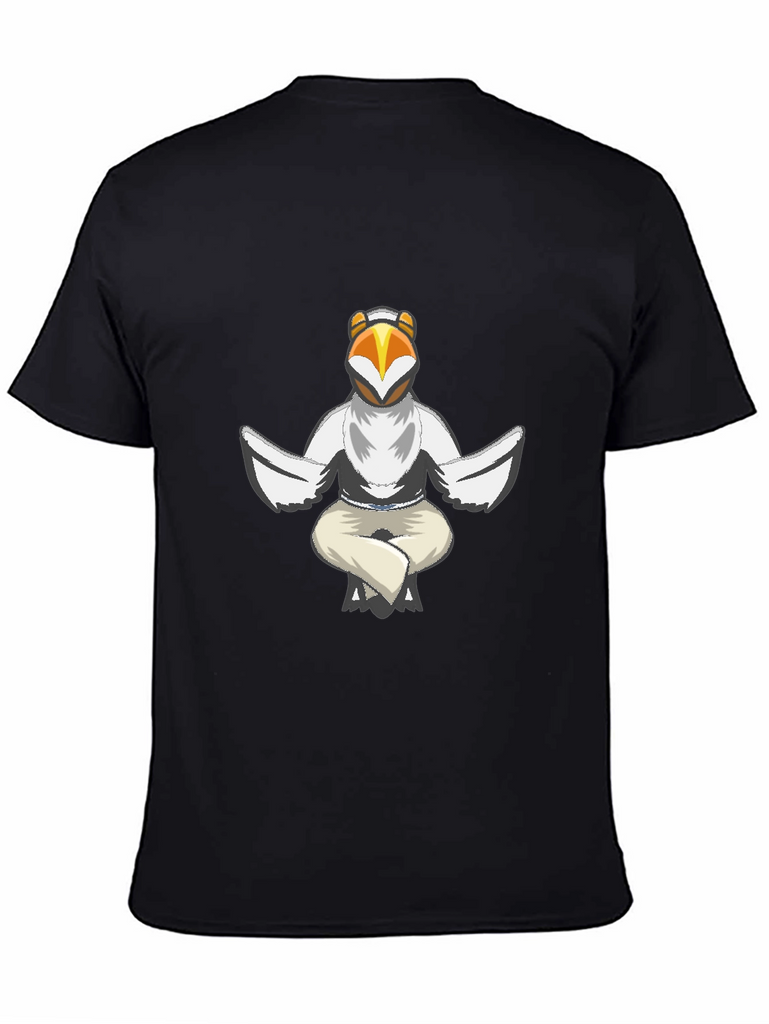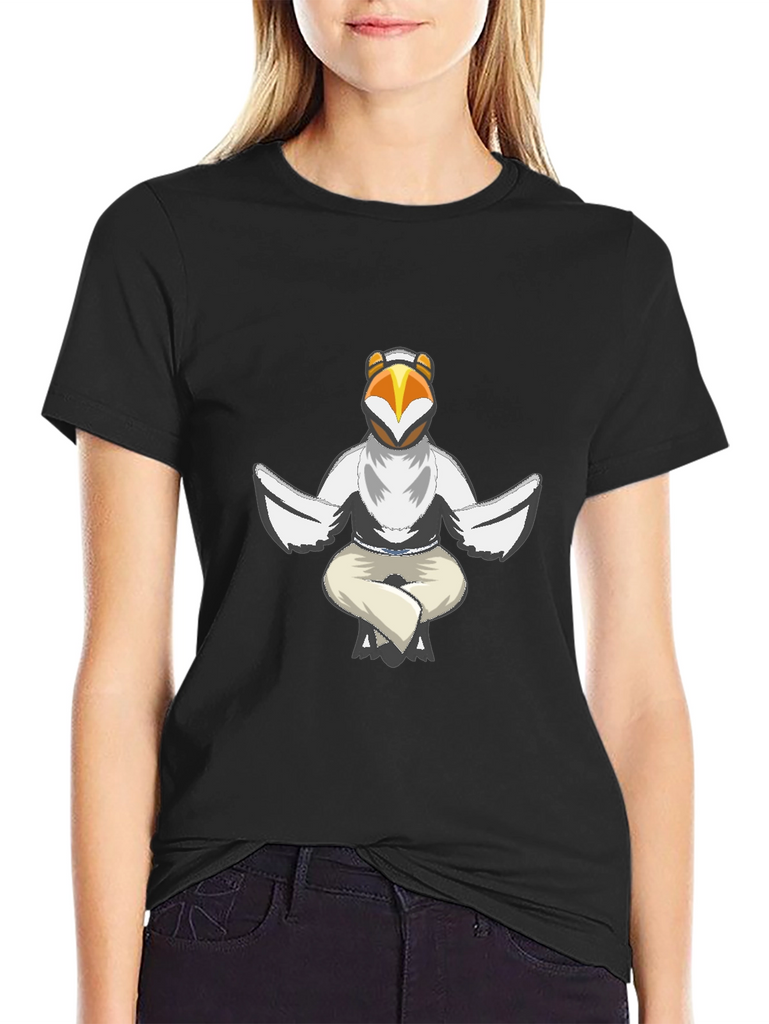 This black t-shirt features a unique graphic print of a cartoon bird meditating. The bird has white and gray feathers with a distinct orange head design, and the pose exudes calmness. The shirt is a classic crew neck style, appearing to be made from a soft, comfortable fabric. Perfect for casual wear, yoga enthusiasts, or anyone who appreciates quirky and original designs. Pair it with jeans, shorts, or your favorite leggings for a relaxed, stylish look. A great way to showcase your unique personality and add a touch of zen to your wardrobe.