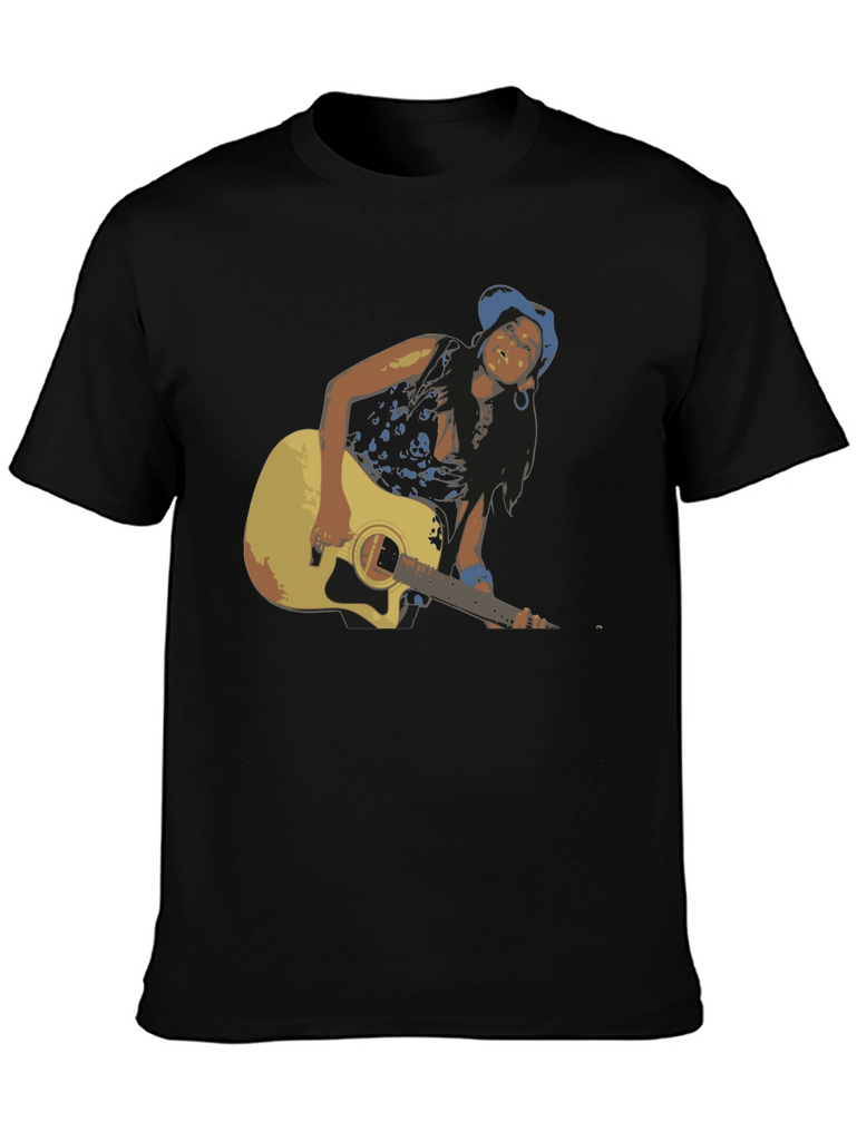 Rock your style with this eye-catching black t-shirt! Featuring a unique graphic of a woman playing guitar, this tee is perfect for music lovers and those with an artistic flair. The design showcases vibrant colors and intricate details, making it a standout piece in your wardrobe. Made from soft, breathable fabric, it offers all-day comfort. Whether you're heading to a concert, hanging out with friends, or just want to express your individuality, this t-shirt is the perfect choice. Pair it with jeans, shorts, or a skirt for a cool, casual look.