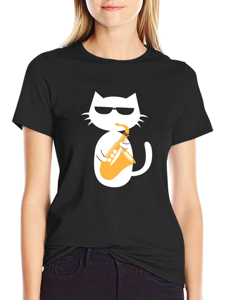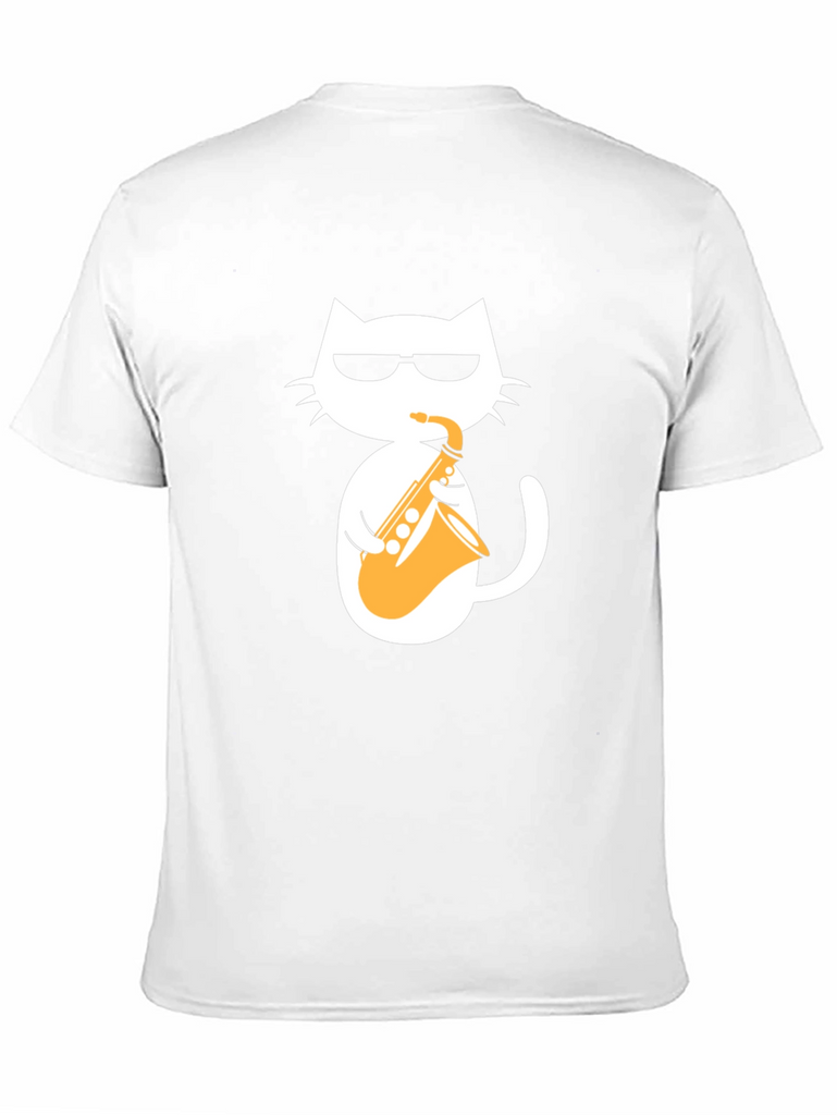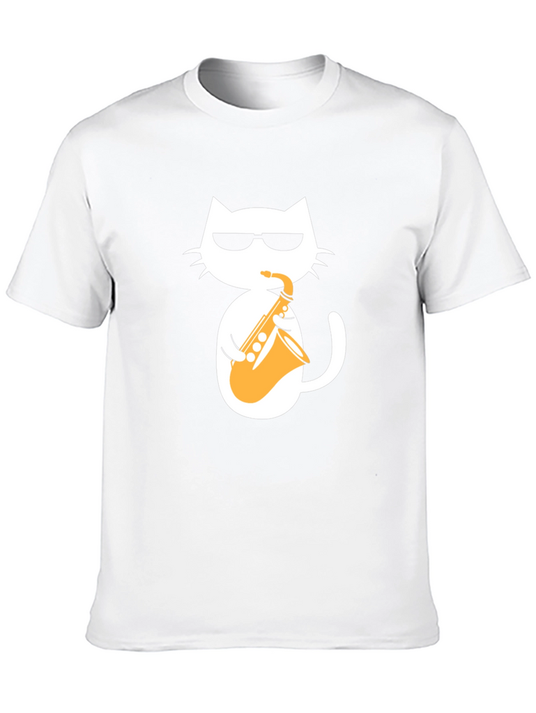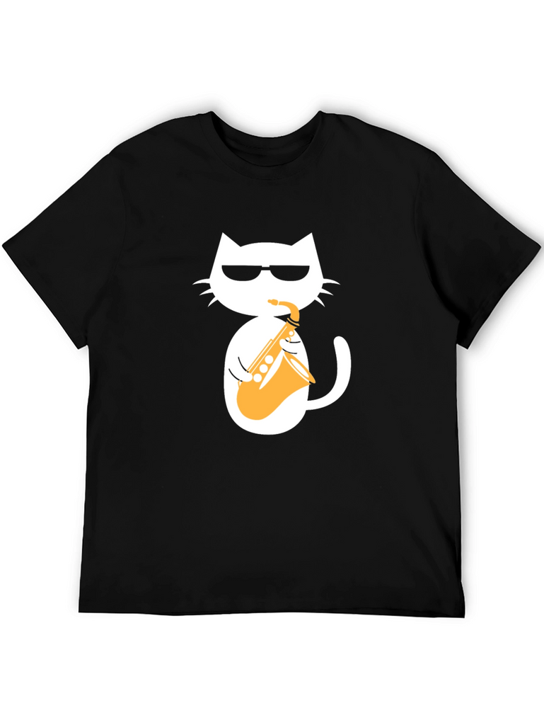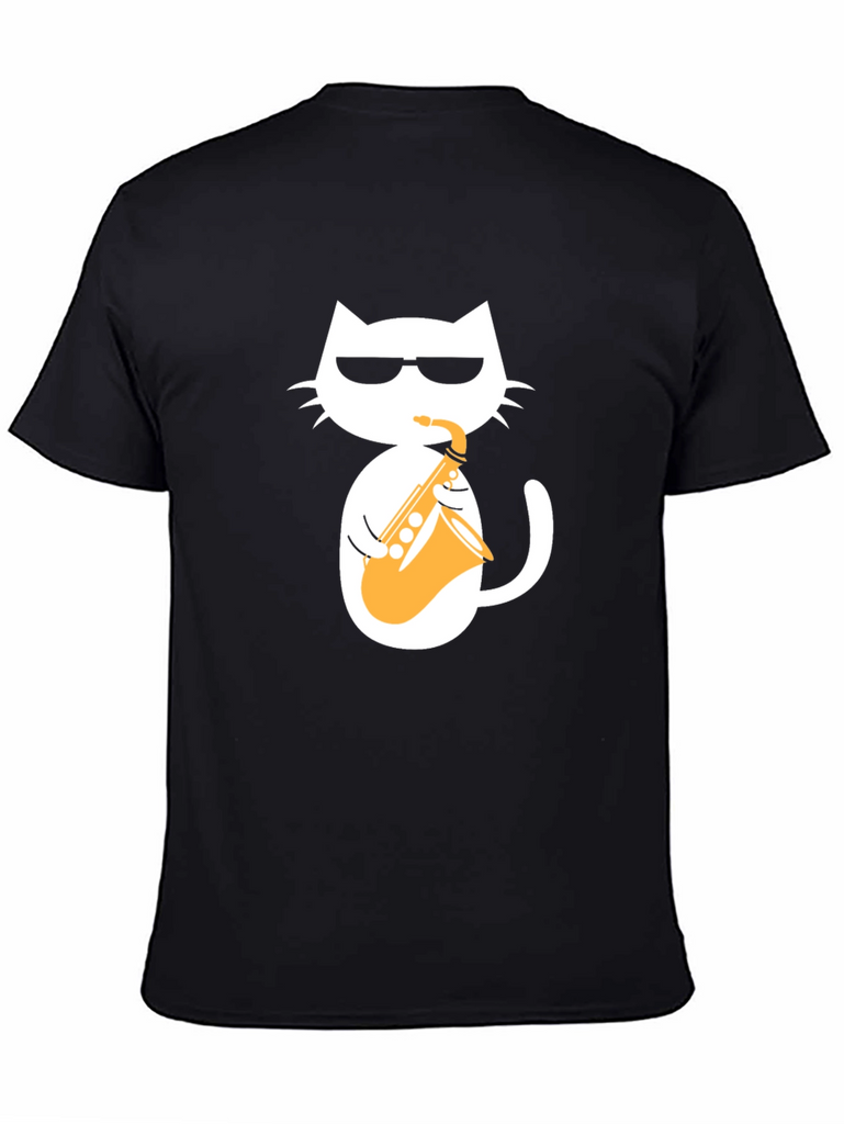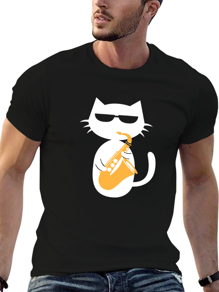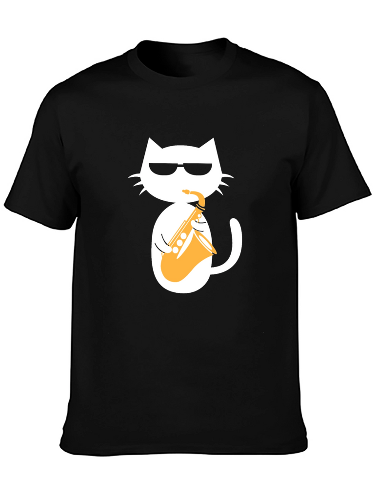Rock a cool and quirky look with this black t-shirt featuring a unique graphic print! The design showcases a white cat wearing sunglasses and playing a bright yellow saxophone. Made from comfortable, breathable fabric, this tee is perfect for everyday wear. Whether you're a cat lover, a music enthusiast, or simply appreciate eye-catching designs, this t-shirt is sure to turn heads. Pair it with jeans, shorts, or joggers for a casual yet stylish outfit. This t-shirt is the perfect addition to your wardrobe. Embrace your individuality and show off your playful side with this standout piece!