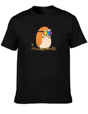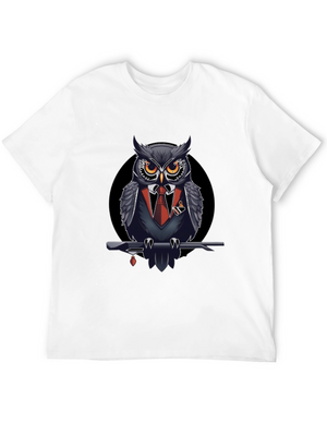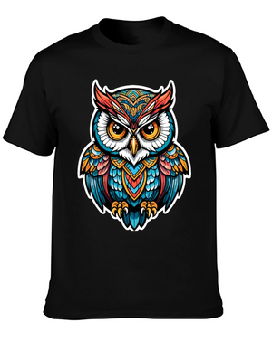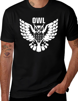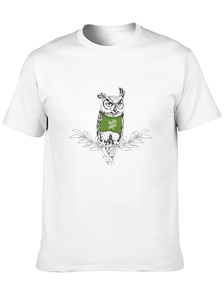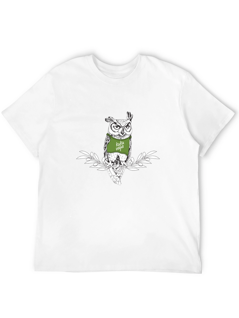 Showcase your unique style with this eye-catching black t-shirt. The standout feature is a detailed graphic print of an owl wearing a green bib with the words "Kuku Vaja." The illustration is framed by delicate white foliage, creating a visually appealing contrast against the dark background. Crafted from a soft, comfortable fabric, this tee is perfect for everyday wear. Pair it with jeans for a casual look or dress it up with a jacket for a night out. Express your individuality with this stylish and conversation-starting owl graphic tee.