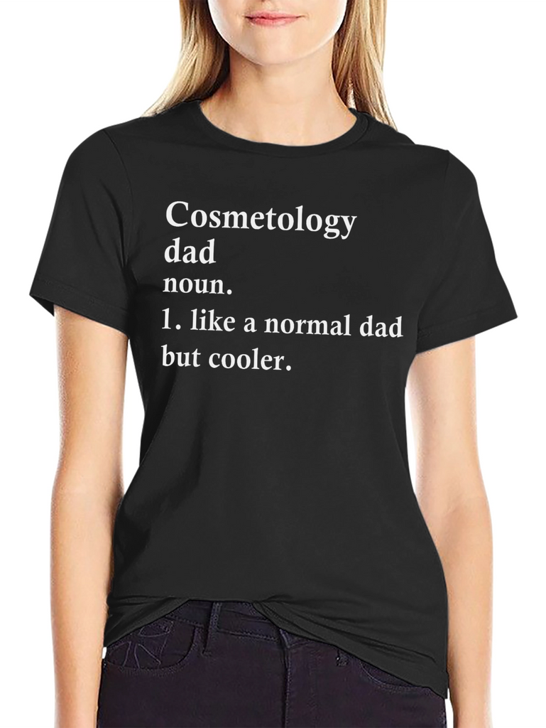 This classic black t-shirt makes a humorous statement for any cosmetology dad! The design features the words "Cosmetology dad noun." followed by "1. like a normal dad but cooler." in a clean, white font. Made from a soft-looking fabric, this tee promises comfort and durability. It's ideal for casual wear, salon events, or as a fun gift for the stylish dad in your life. Show off your unique profession and personality with this eye-catching t-shirt.