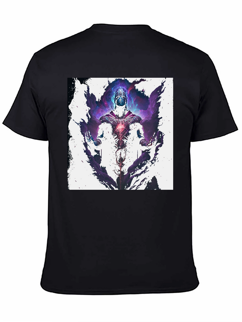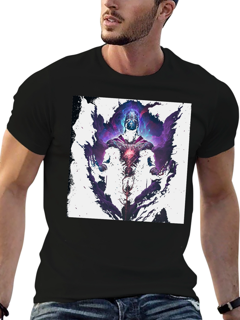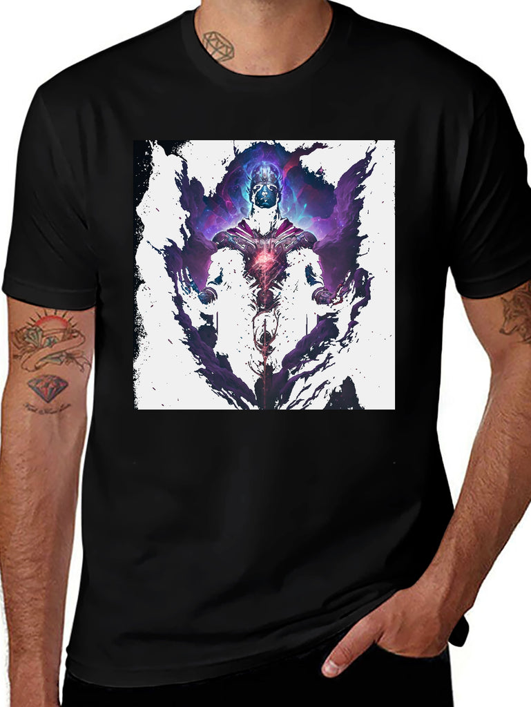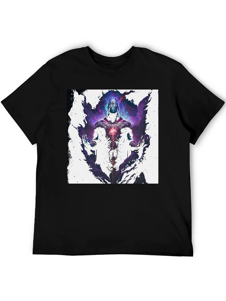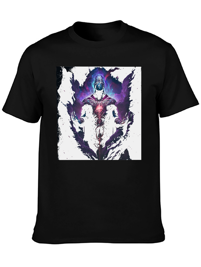 Unleash your inner mystic with this unique black t-shirt, featuring a captivating graphic of a cosmic entity. The vibrant print showcases a humanoid figure surrounded by swirling nebulous energy in shades of purple and red. Made from a comfortable cotton blend, this tee offers both style and comfort. The crisp, high-quality print is sure to turn heads. Ideal for casual wear, concerts, or expressing your unique style, this t-shirt is a must-have addition to your wardrobe. Pair it with jeans or shorts for a cool, effortless look.