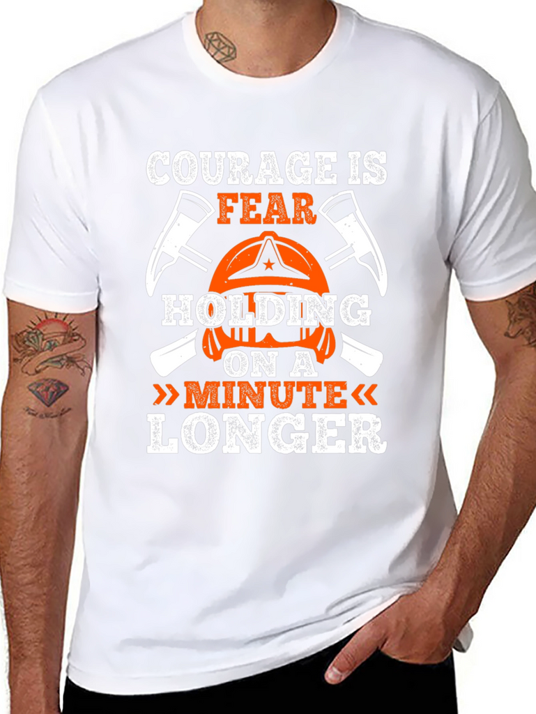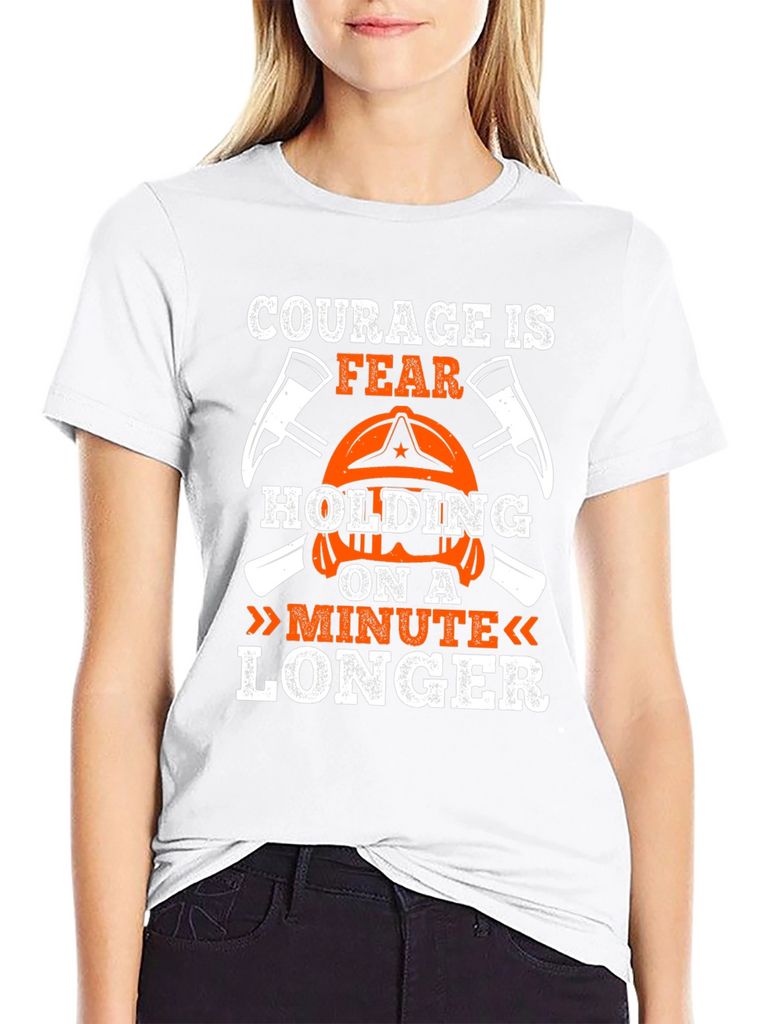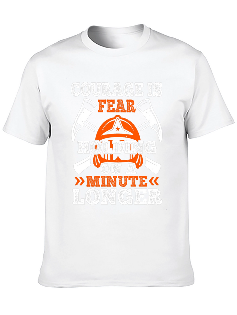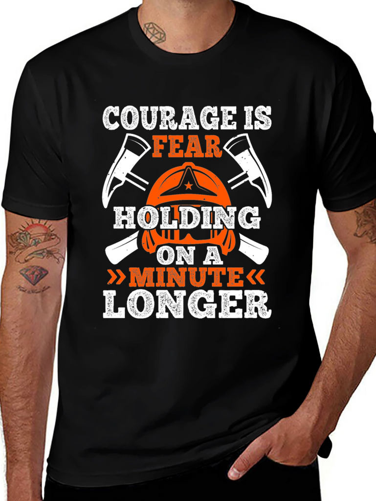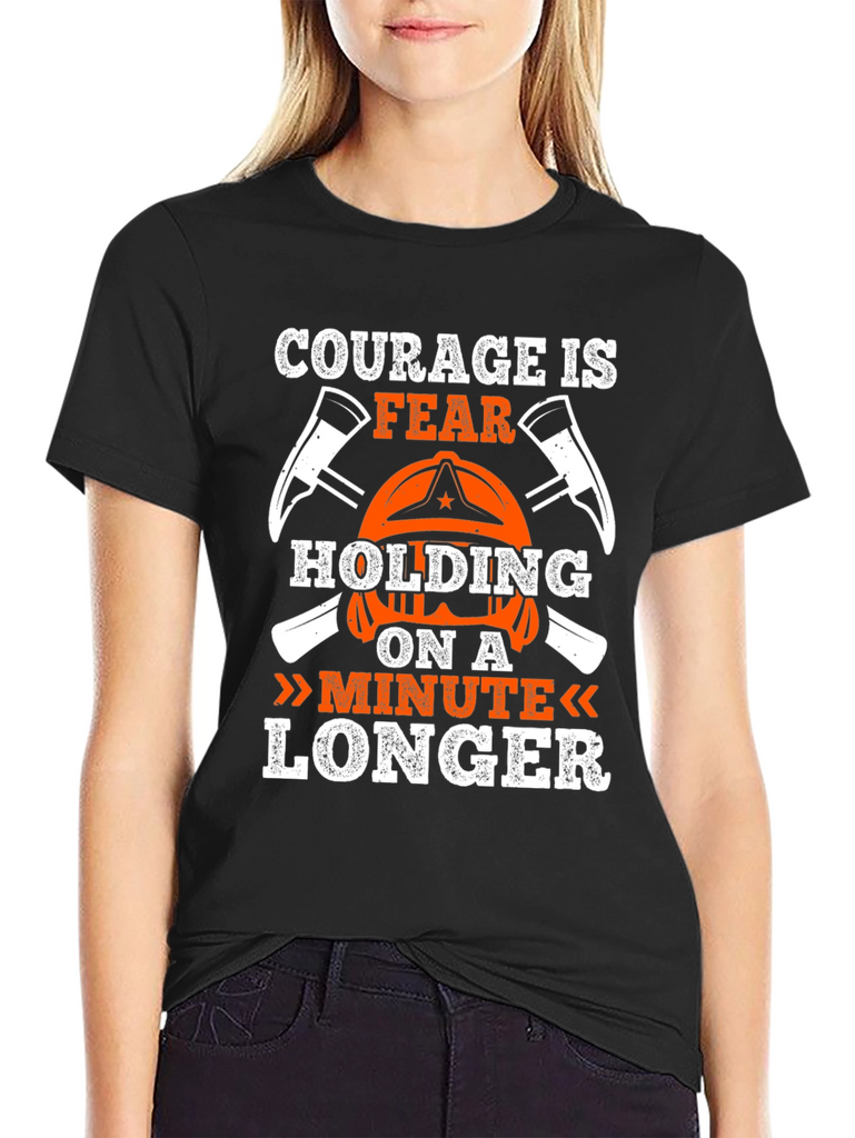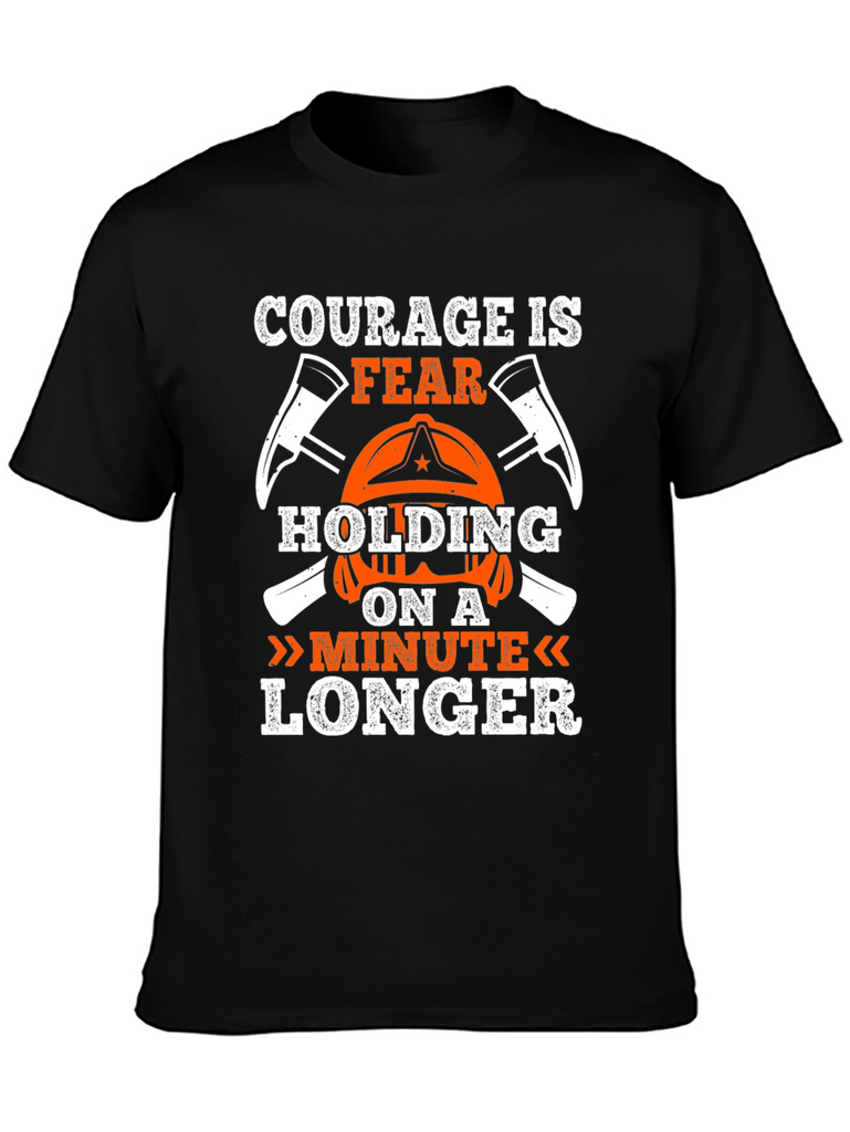 Show your support for firefighters with this bold graphic tee! The black t-shirt features a striking design with the quote "Courage is fear holding on a minute longer," alongside a firefighter helmet and crossed axes. Made from comfortable fabric, this tee is perfect for everyday wear or as a gift for the brave firefighters in your life. Ideal for casual outings, work events, or simply showcasing your appreciation for their selfless service. Wear it with pride and let everyone know you stand with our heroes!