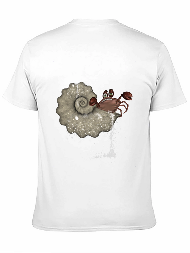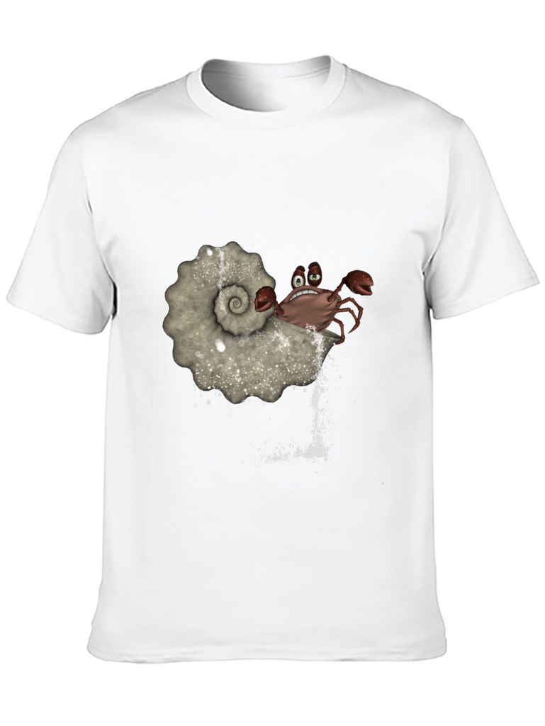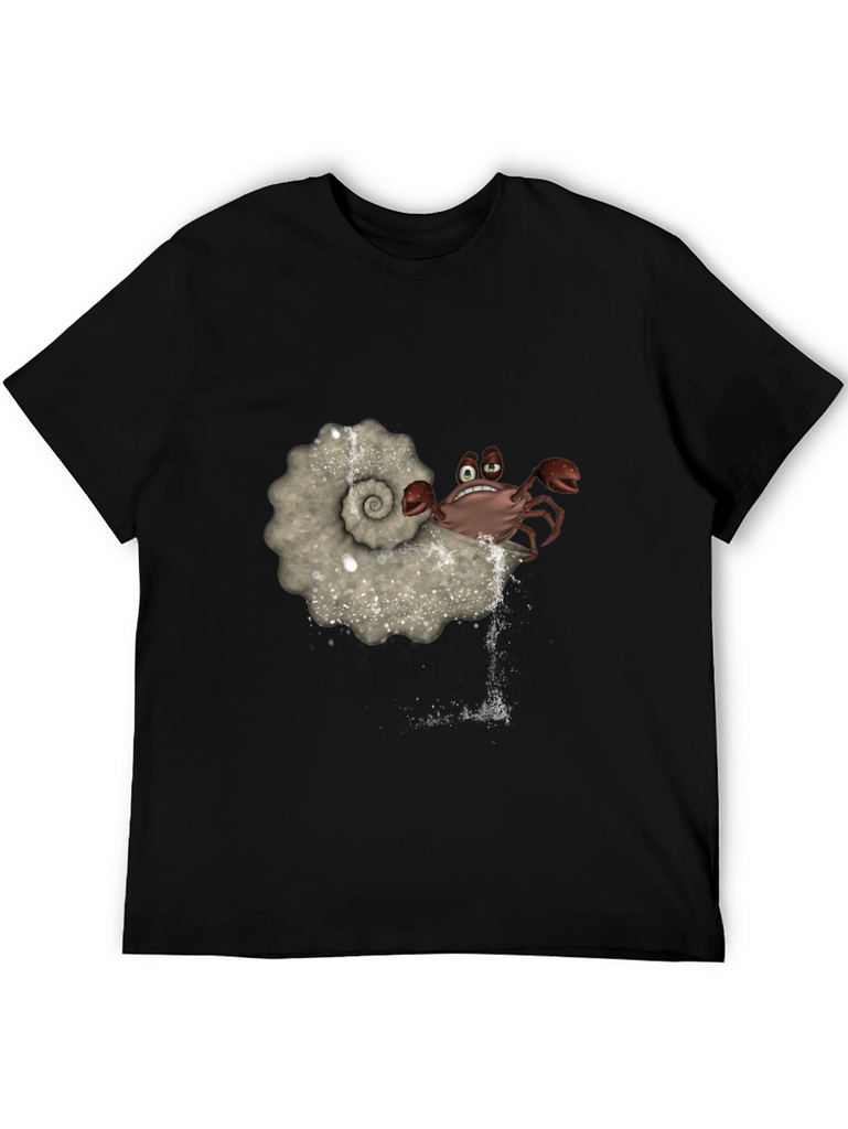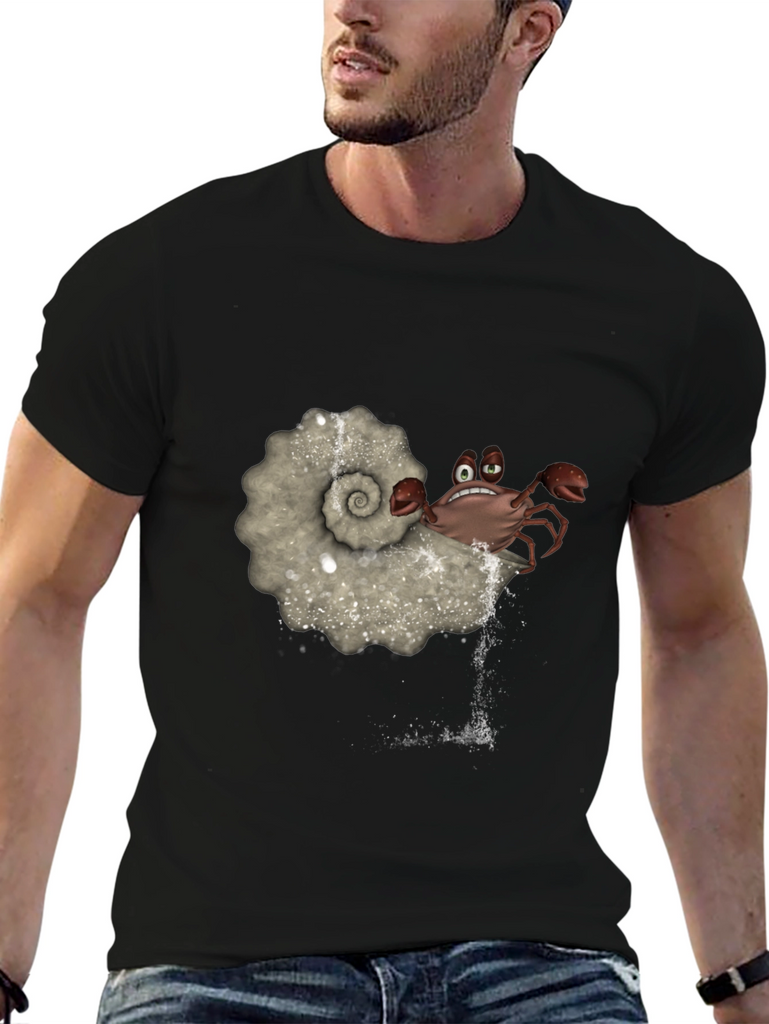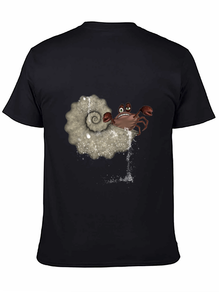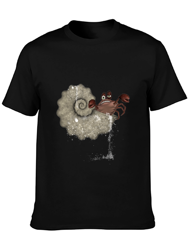 This black t-shirt features a unique graphic print of a crab peering out from a swirling, textured shell. The design has a whimsical and eye-catching quality. Made from a comfortable-looking fabric, this tee is perfect for casual wear. It's a great conversation starter and a fun addition to any wardrobe. Pair it with jeans or shorts for a relaxed, stylish look. Show off your unique sense of style with this crab-themed tee!