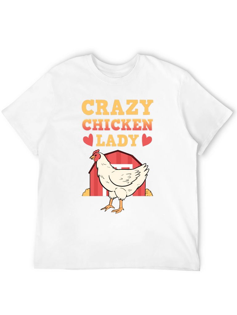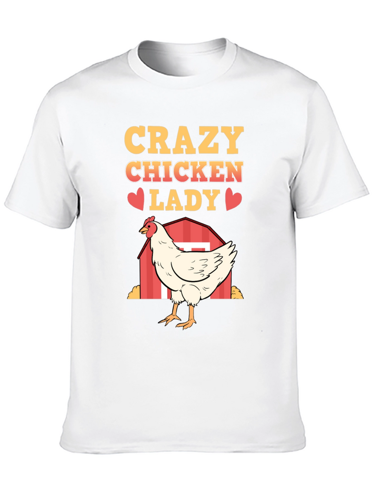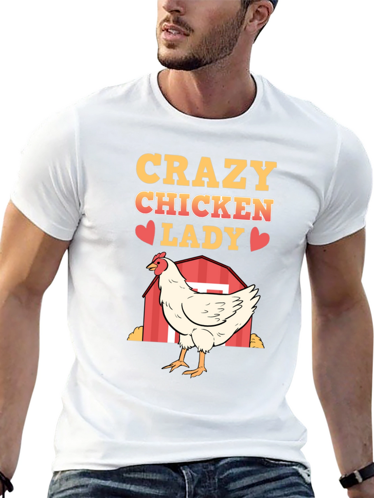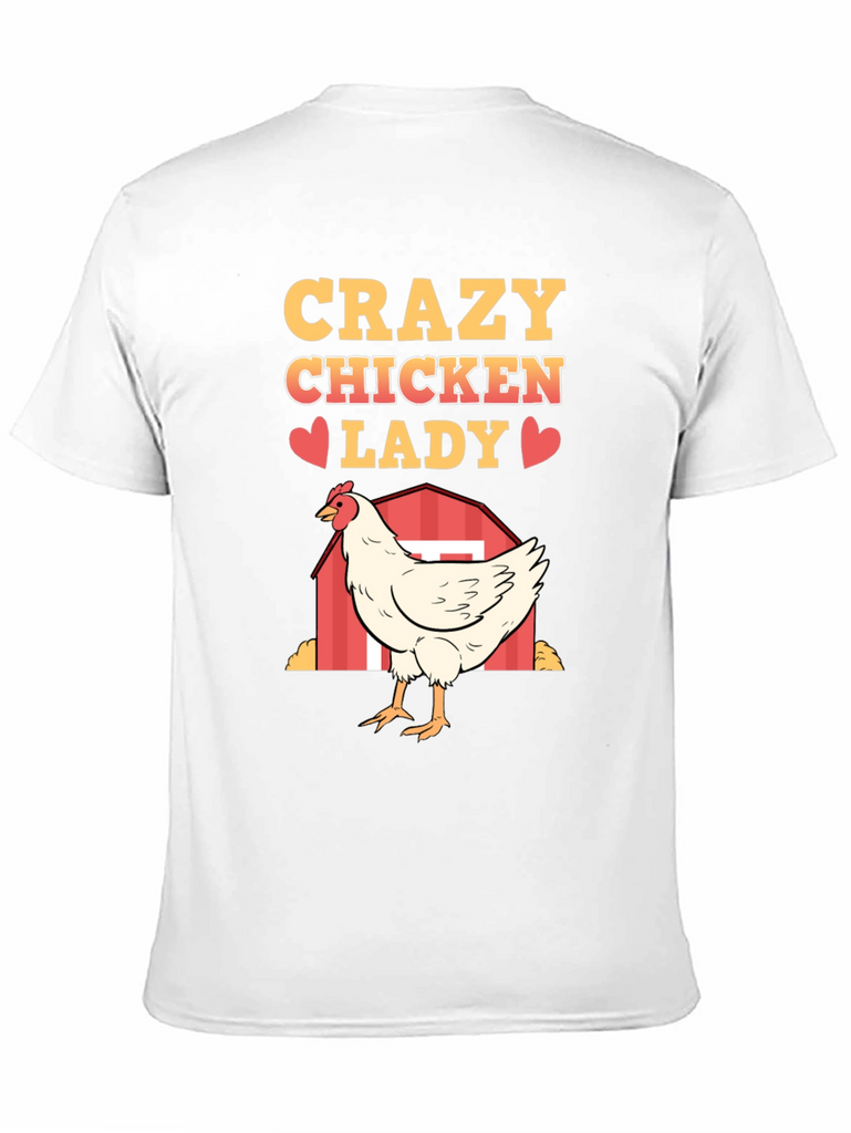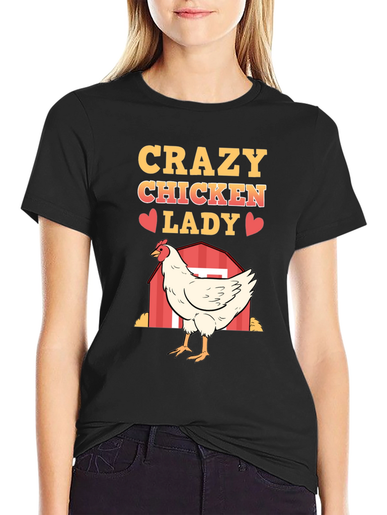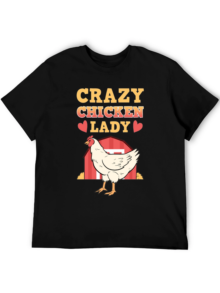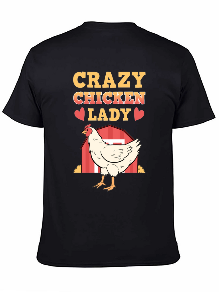 Show off your love for chickens with this fun and quirky "Crazy Chicken Lady" T-shirt. Made from a soft, breathable fabric, this black tee features a vibrant, eye-catching design. The design includes the words "Crazy Chicken Lady" in a bold, golden font, punctuated with cute red heart graphics. A detailed illustration of a white chicken standing in front of a red barn adds a touch of farm charm. Perfect for casual wear, chicken enthusiasts, or as a humorous gift, this T-shirt is sure to be a conversation starter and a comfortable addition to any wardrobe. Get yours today and embrace your inner chicken lady!