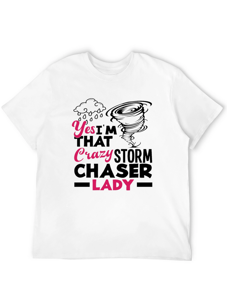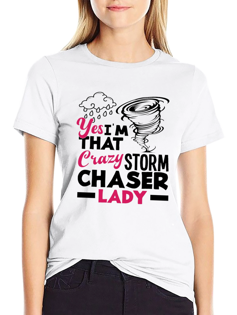 Show off your love for wild weather with this unique graphic t-shirt. The black tee features the text "Yes I'm That Crazy Storm Chaser Lady", rendered in a mix of bold and stylish fonts. A whimsical storm cloud and a swirling tornado graphic add to the design's playful vibe. Made from a comfortable-looking fabric, this t-shirt is perfect for casual wear, storm chasing adventures, or as a fun gift for the meteorologist in your life. Grab yours today and embrace your inner storm chaser!