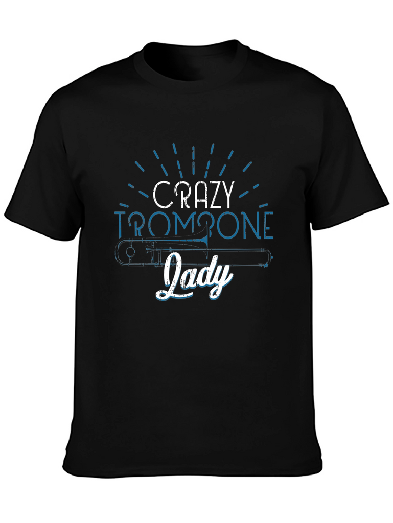 Show off your passion for music with this unique "Crazy Trombone Lady" T-shirt. This tee features a creative design incorporating a trombone graphic with playful typography. Made from what appears to be a soft, comfortable cotton blend, this black t-shirt is perfect for casual wear, music events, band practice, or as a gift for the trombone enthusiast in your life. Express your love for music with style and make a statement with this eye-catching shirt. It's a must-have for any proud trombone lady!