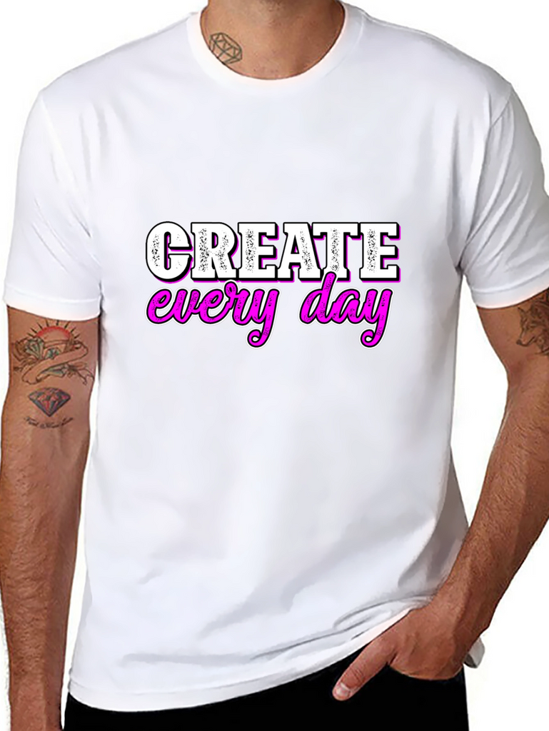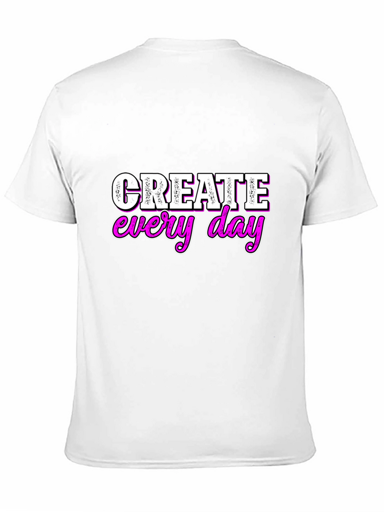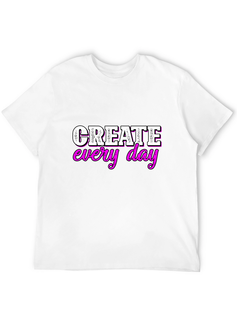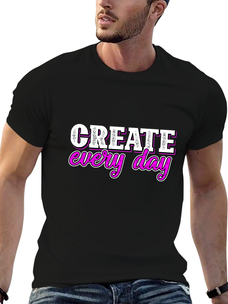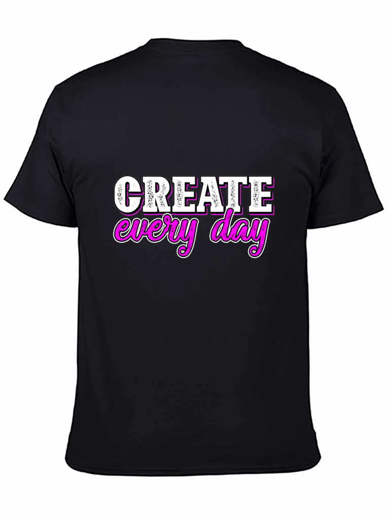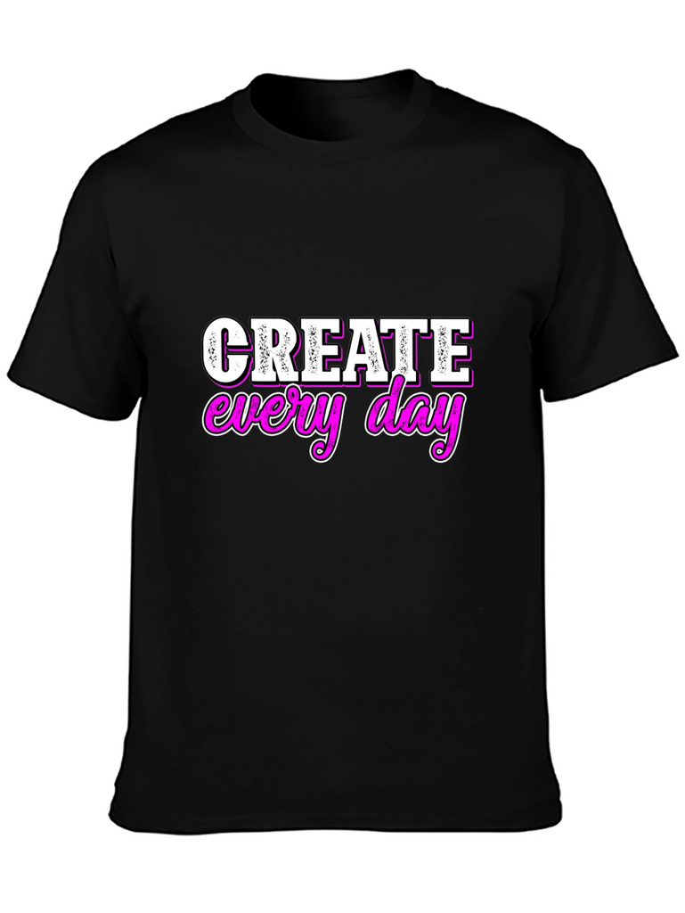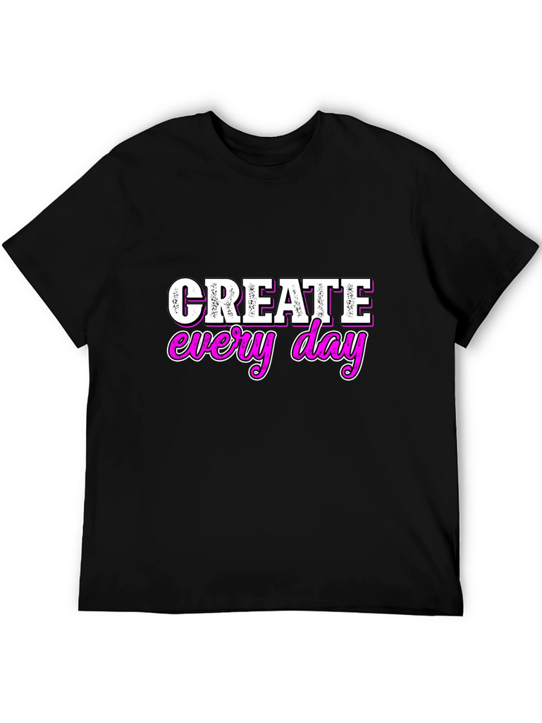 Express your creative spirit with this stylish black t-shirt. The tee features the motivational phrase "CREATE every day" in a bold, eye-catching design. The word "CREATE" is in white, while "every day" is in a vibrant pink outlined in black, adding a pop of color. Made from a soft and comfortable fabric, this tee is perfect for everyday wear. Ideal for artists, designers, writers, and anyone who loves to create, this shirt is a reminder to embrace your passions and make every day count. Show off your creative side and inspire others with this unique and inspiring tee.