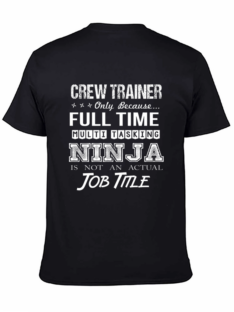 This black t-shirt features a humorous and relatable design for dedicated crew trainers. The white text proclaims "CREW TRAINER *** Only Because... FULL TIME MULTI TASKING NINJA IS NOT AN ACTUAL JOB TITLE". It's made from a comfortable-looking material. This T-shirt is ideal for wearing at work, casual outings, or as a fun gift for the crew trainer in your life. Show off your sense of humor and dedication with this unique and stylish tee!