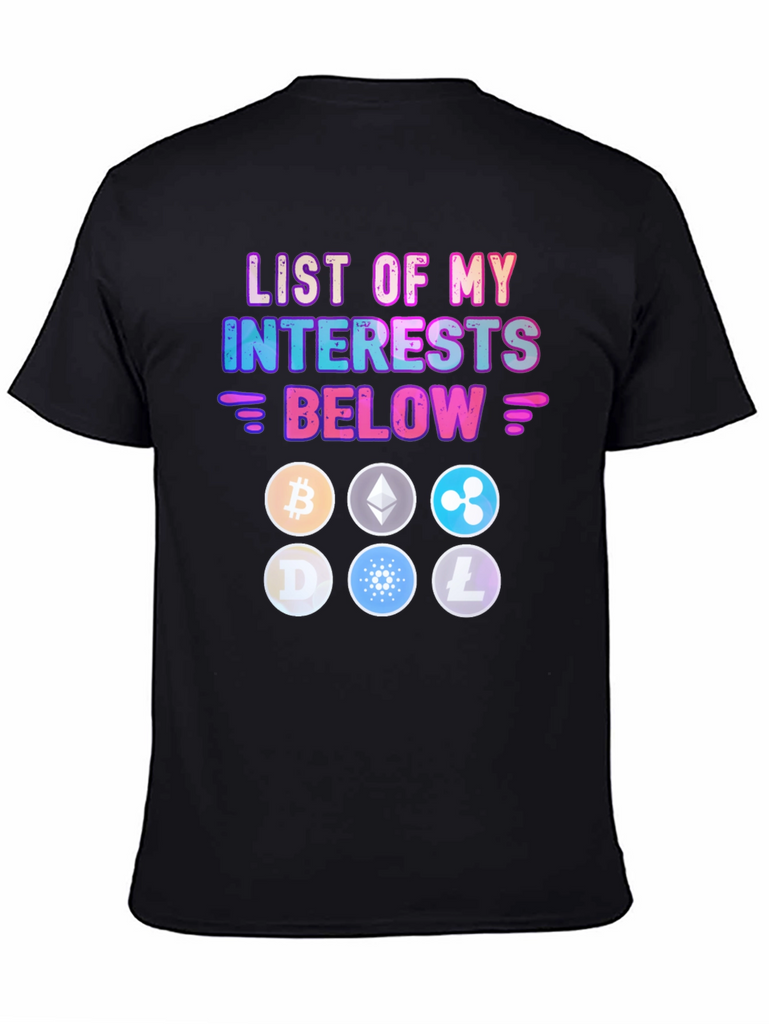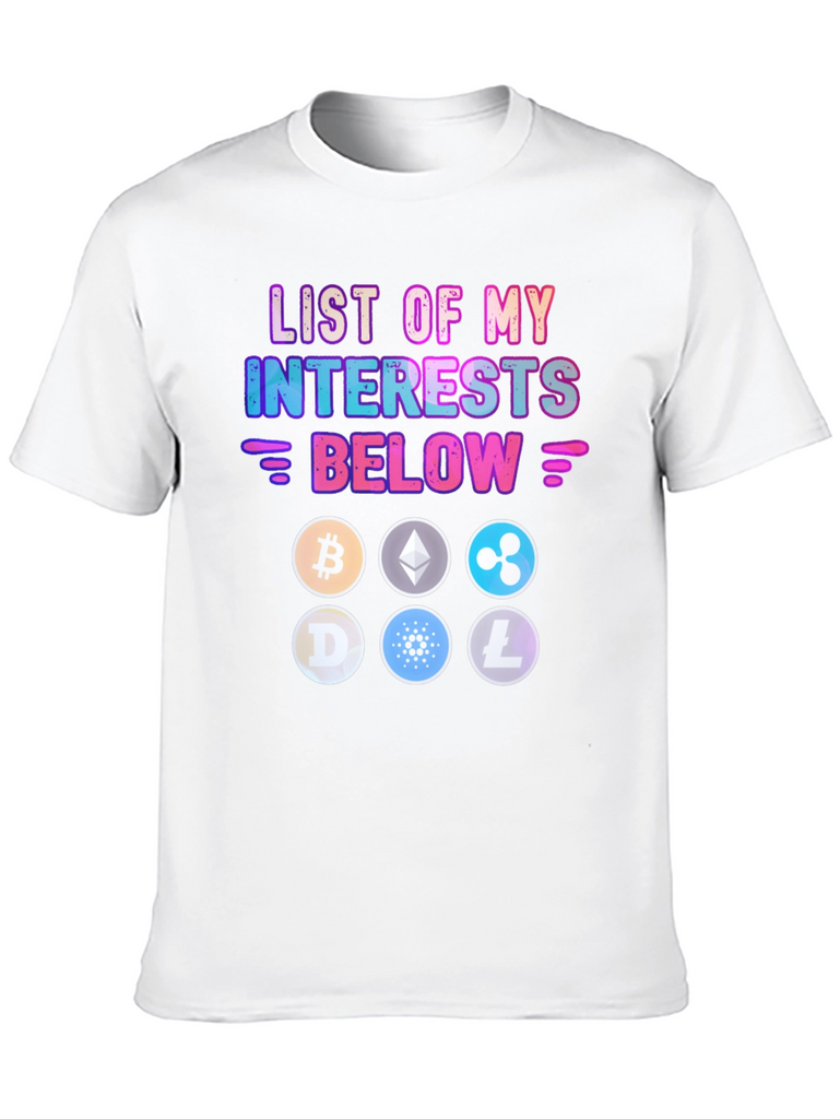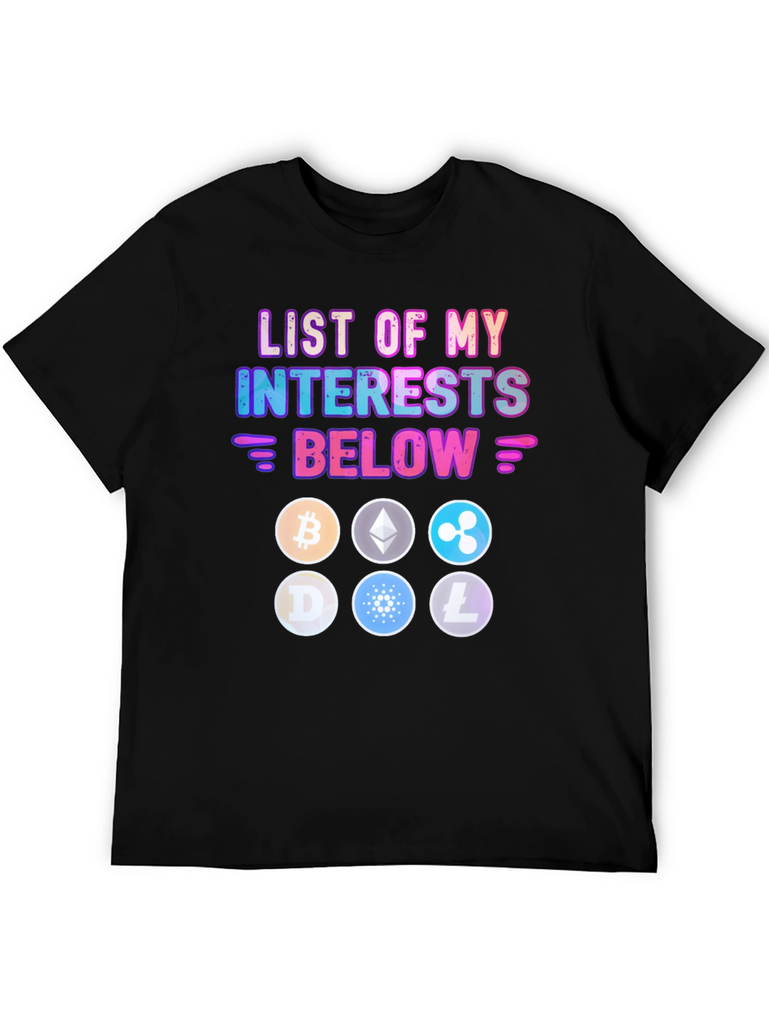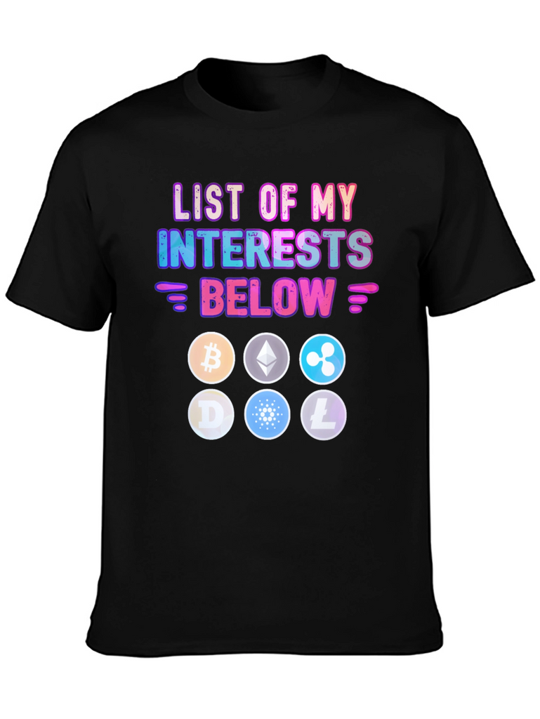 Show off your cryptocurrency passion with this unique t-shirt! This black tee features a bold statement: "List of My Interests Below," followed by vibrant, colorful icons representing popular cryptocurrencies like Bitcoin, Ethereum, Ripple, Dogecoin, Cardano, and Litecoin. Made from a comfortable material, this shirt is perfect for casual wear, crypto meetups, or as a conversation starter. Express your love for the digital economy in style with this eye-catching tee. A must-have for any crypto enthusiast!