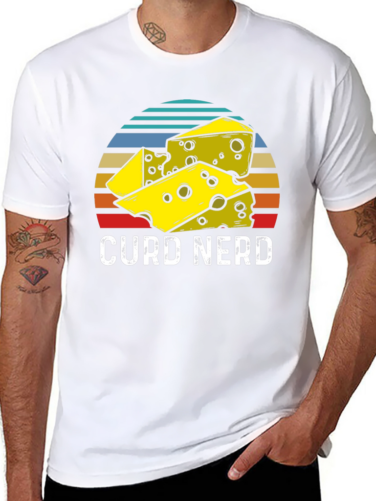 Show off your love for cheese with this unique "Curd Nerd" t-shirt! This black tee features a playful graphic of cheese chunks set against a retro-style, multi-colored striped circle. The bold white "CURD NERD" text makes a statement, perfect for casual wear, cheese tastings, or showing off your foodie side. Made from comfortable, breathable fabric, this t-shirt is ideal for everyday wear. This shirt is a great conversation starter, makes an excellent gift for cheese aficionados, or anyone with a passion for dairy delights! Get yours today and let the world know you're a proud "Curd Nerd."