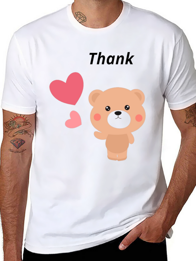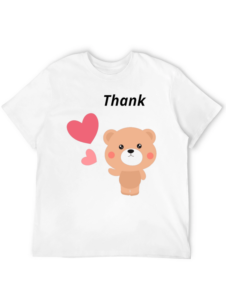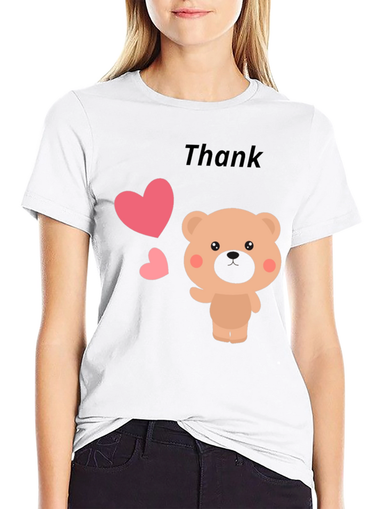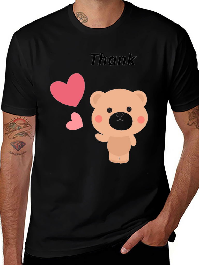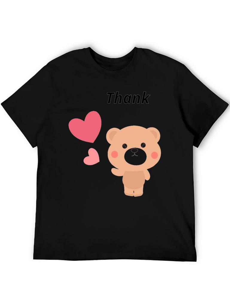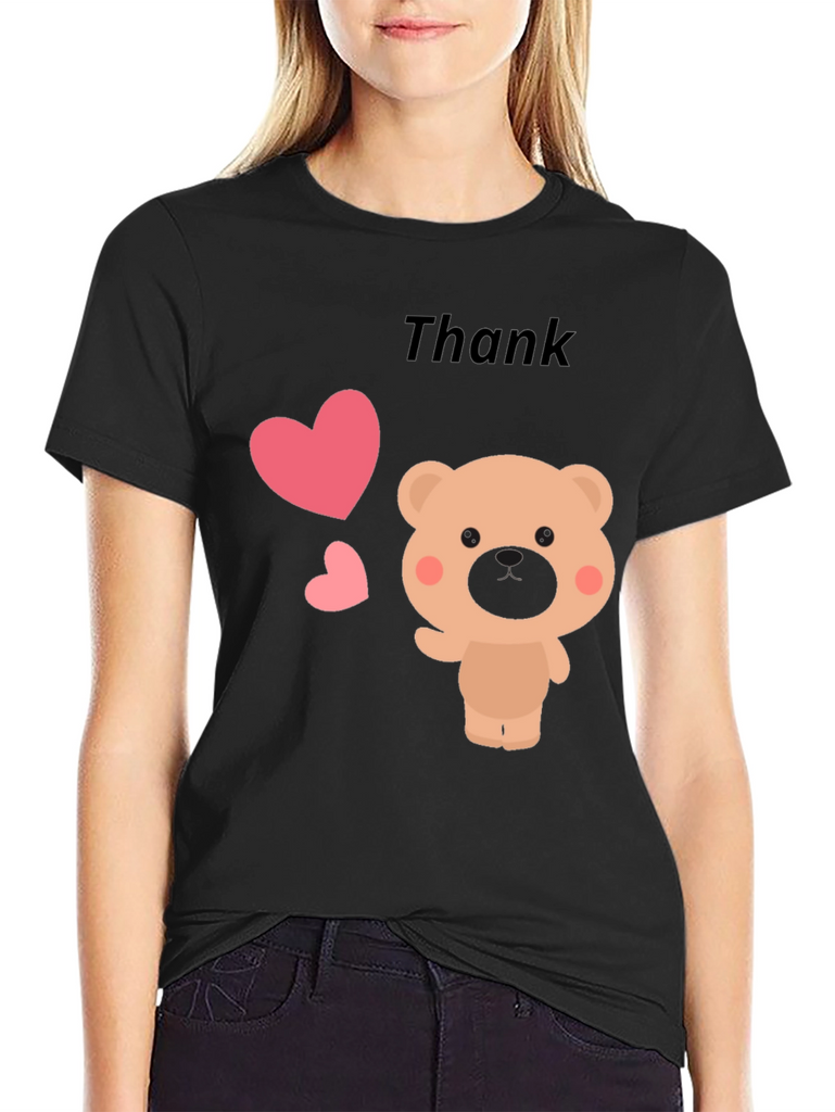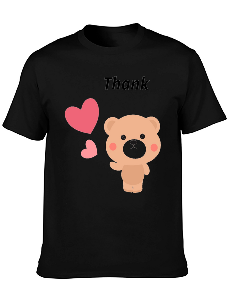 Show your appreciation with this adorable black T-shirt featuring a cute cartoon bear, hearts, and the word "Thank". Made from a comfortable, breathable fabric, this shirt is perfect for casual wear. The charming design adds a touch of whimsy to any outfit. Ideal for expressing gratitude, gifting to loved ones, or simply adding a playful piece to your wardrobe. The shirt is perfect for everyday wear and is sure to be a conversation starter! A great choice for anyone who loves to spread positivity and kindness. The shirt’s design is playful and unique.