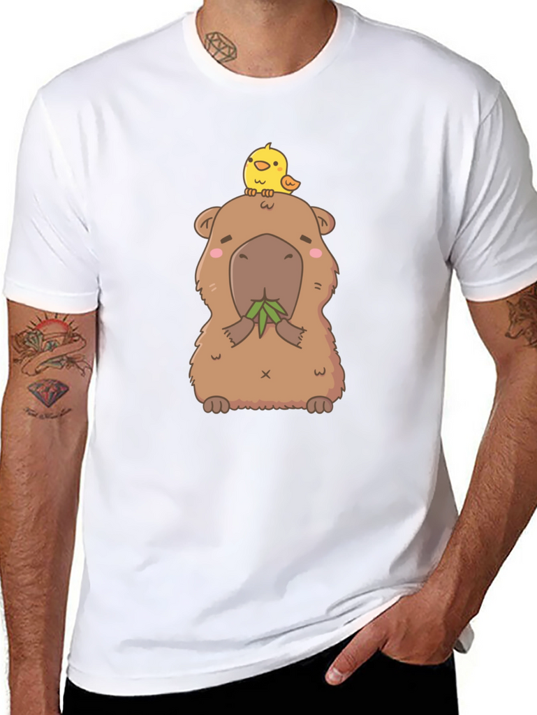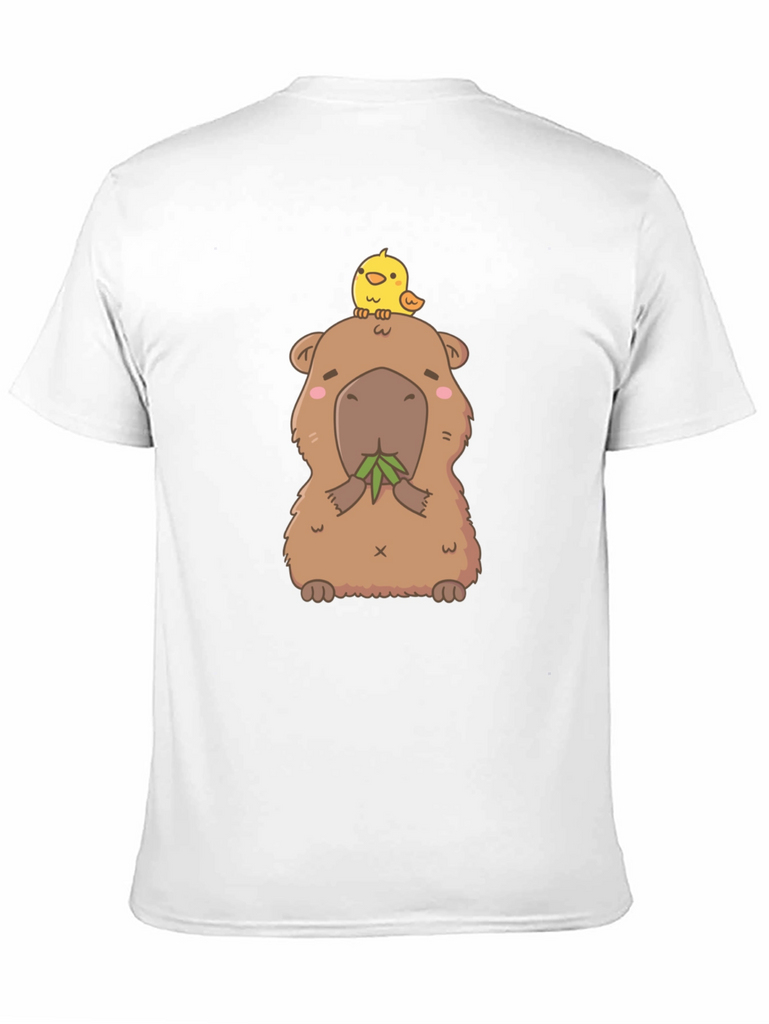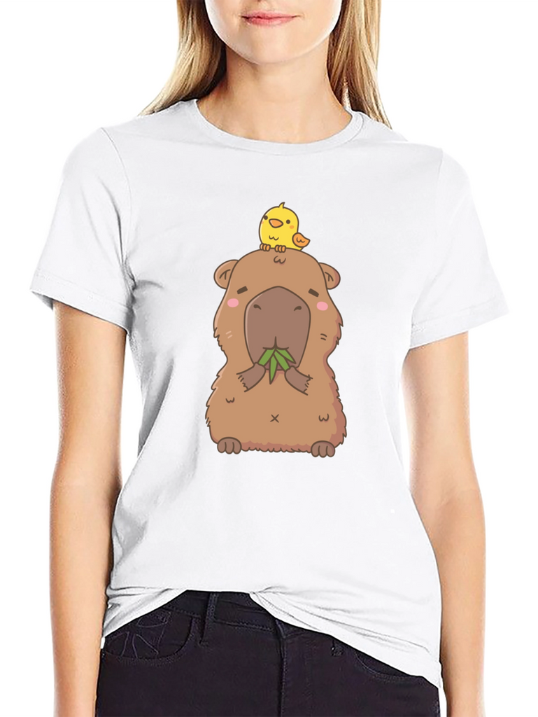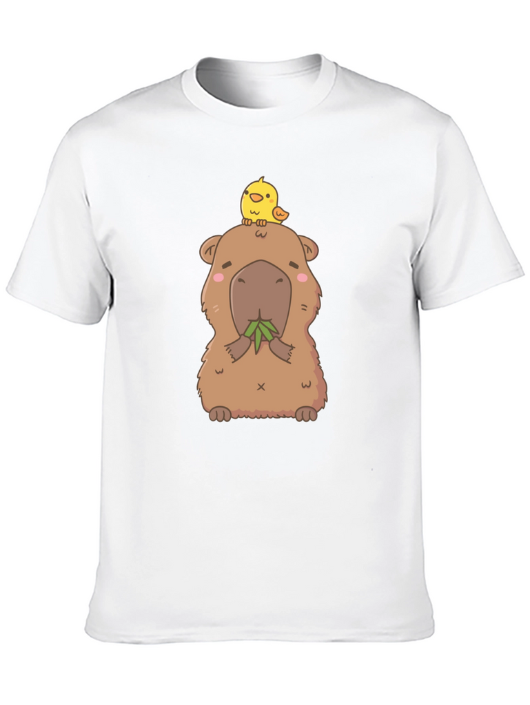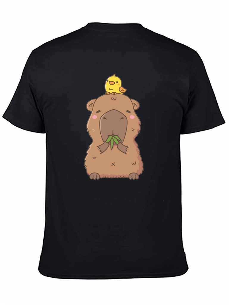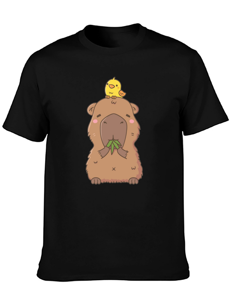 Show off your love for adorable animals with this charming t-shirt! Made from soft, breathable cotton, this black tee features a delightful graphic of a capybara with a tiny chick perched on its head. The capybara is depicted eating leaves, adding a touch of whimsy to the design. With its comfortable fit and unique print, this t-shirt is perfect for everyday wear, casual outings, or as a fun conversation starter. It's a great gift for animal lovers or anyone who appreciates cute and quirky fashion. Get yours today and spread the joy!