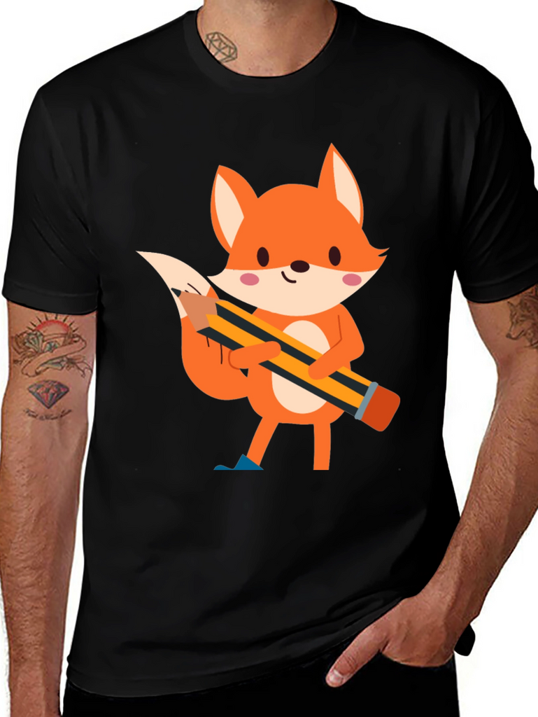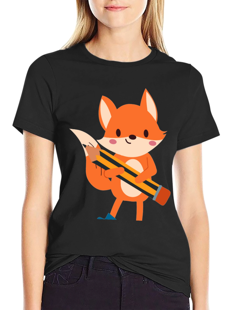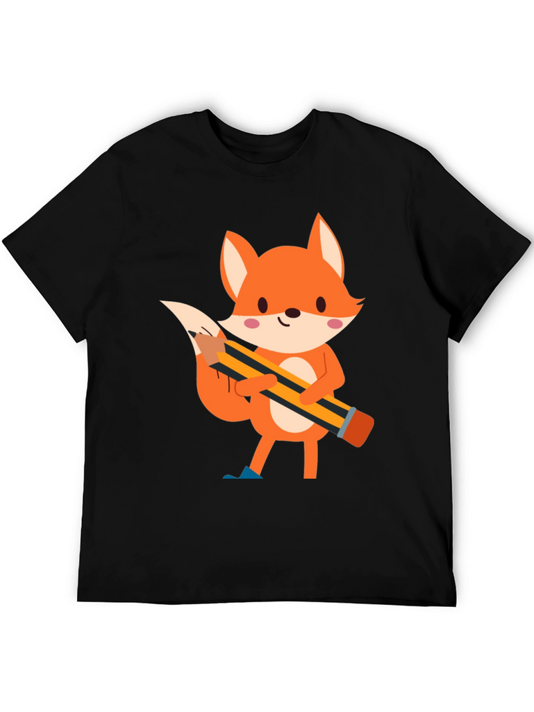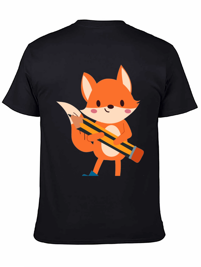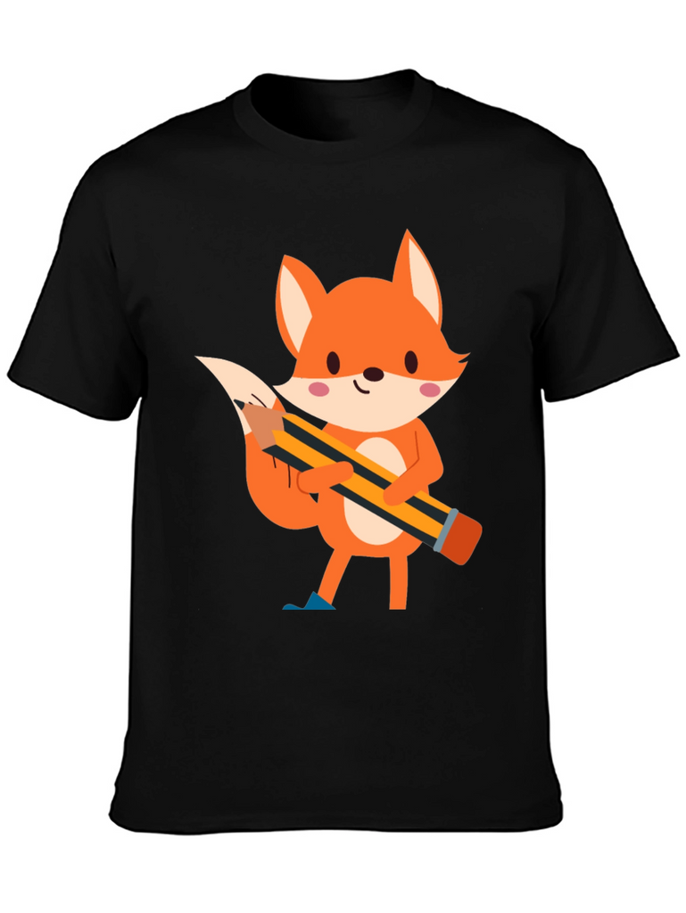 This black t-shirt features a charming cartoon illustration of a fox holding a pencil. The fox is depicted in vibrant orange tones with white accents and pink cheeks, creating a playful and endearing design. The pencil, with its yellow and black stripes, adds a touch of whimsy to the shirt. Made from comfortable fabric, this tee is perfect for casual wear and expressing your unique style. Ideal for those who love animals, cartoons, or simply want to add a fun element to their wardrobe. Suitable for everyday activities, school, or relaxed outings.