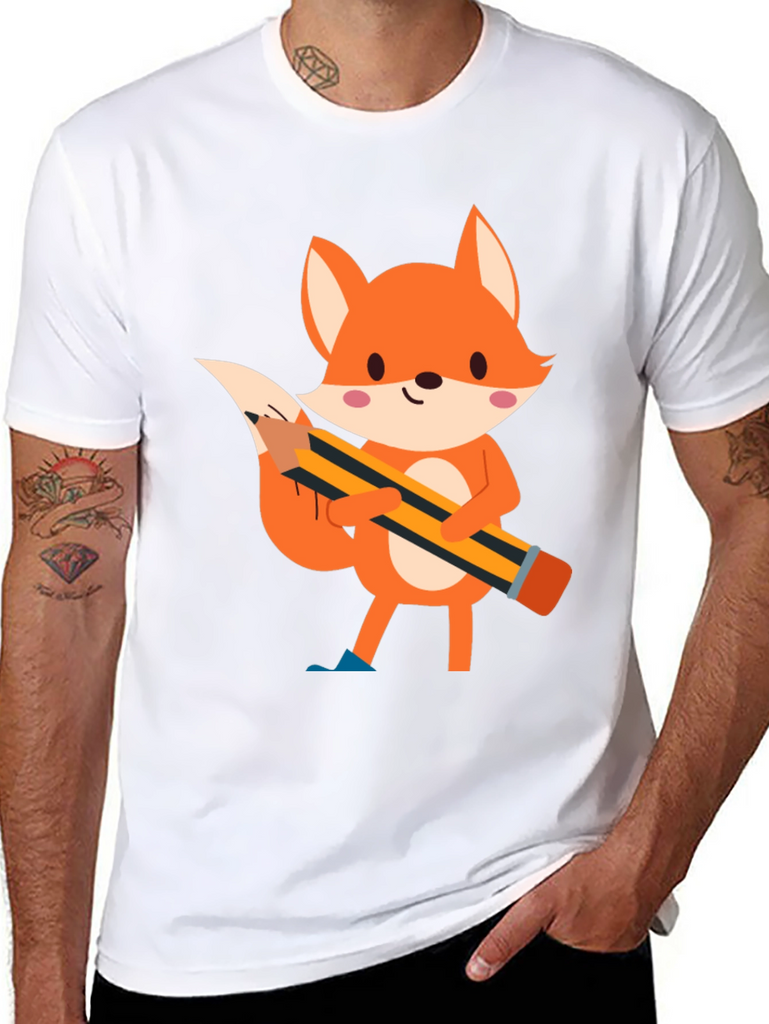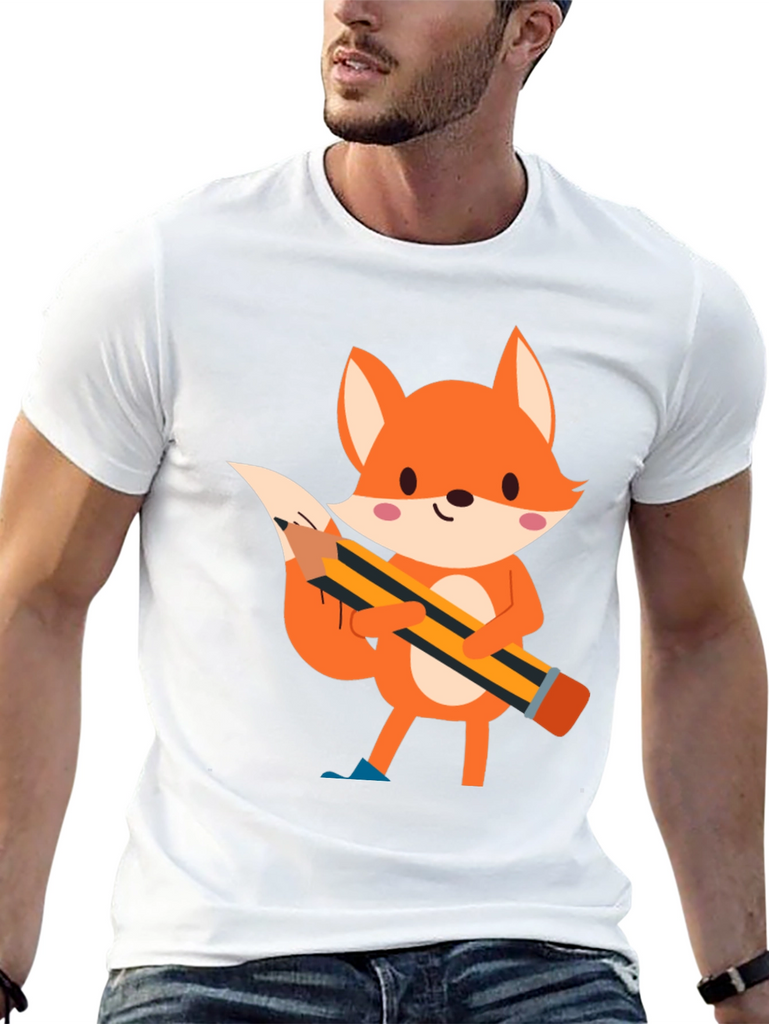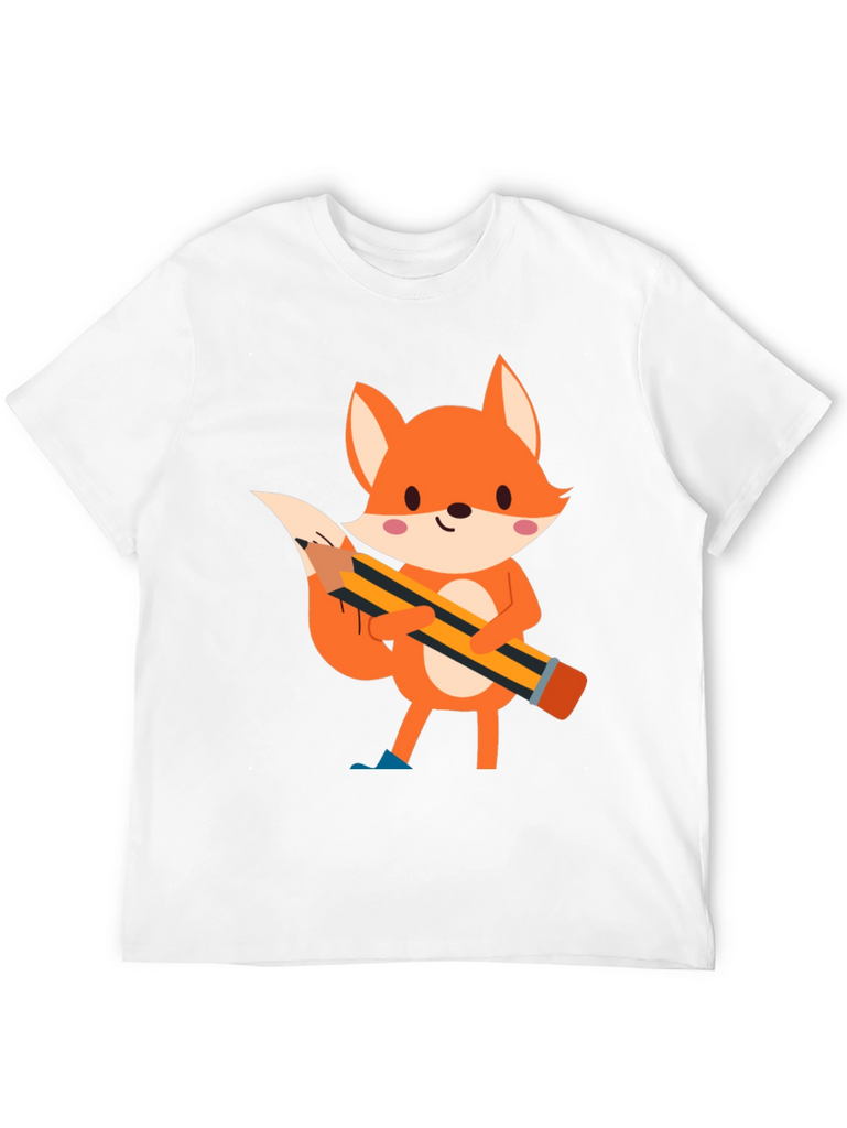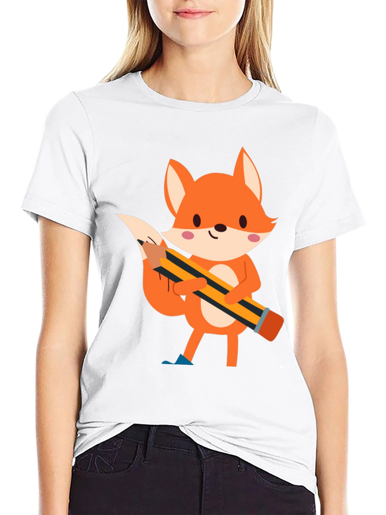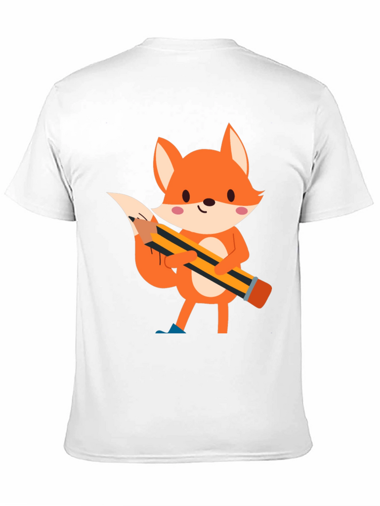 This black t-shirt features a charming cartoon illustration of a fox holding a pencil. The fox is depicted in vibrant orange tones with white accents and pink cheeks, creating a playful and endearing design. The pencil, with its yellow and black stripes, adds a touch of whimsy to the shirt. Made from comfortable fabric, this tee is perfect for casual wear and expressing your unique style. Ideal for those who love animals, cartoons, or simply want to add a fun element to their wardrobe. Suitable for everyday activities, school, or relaxed outings.