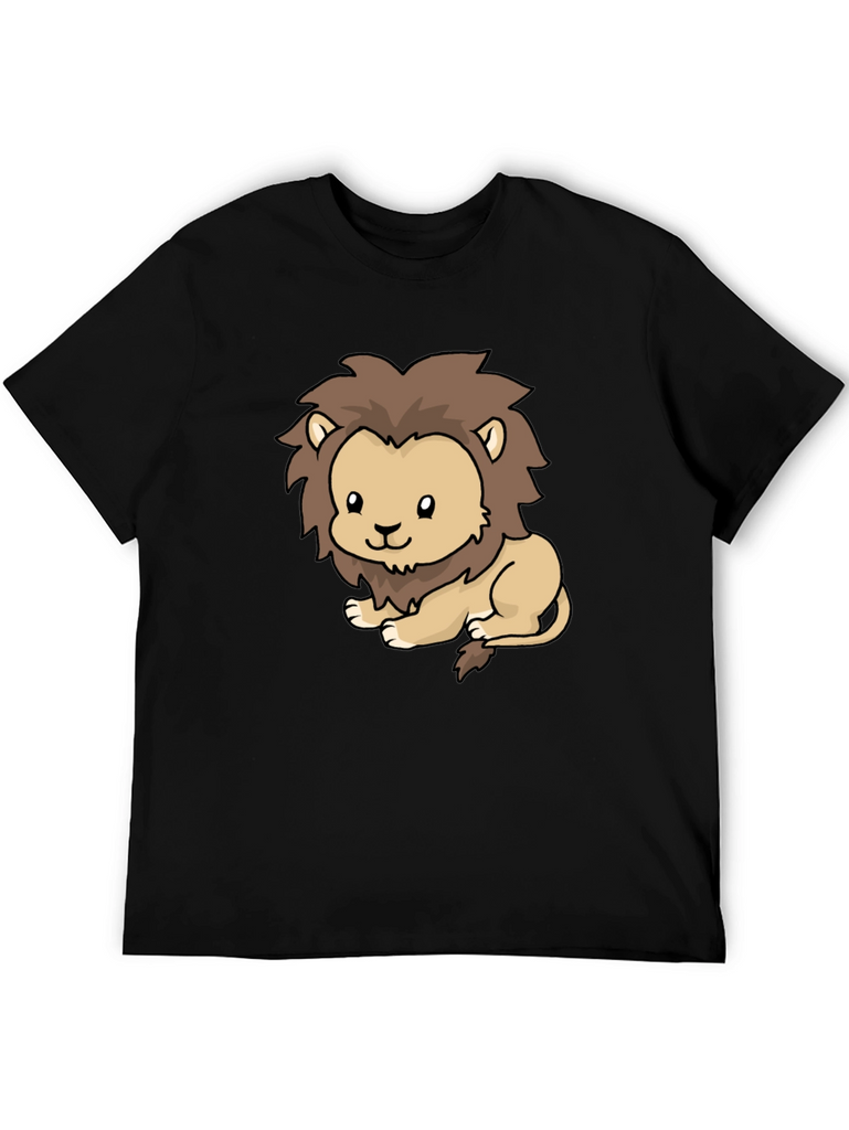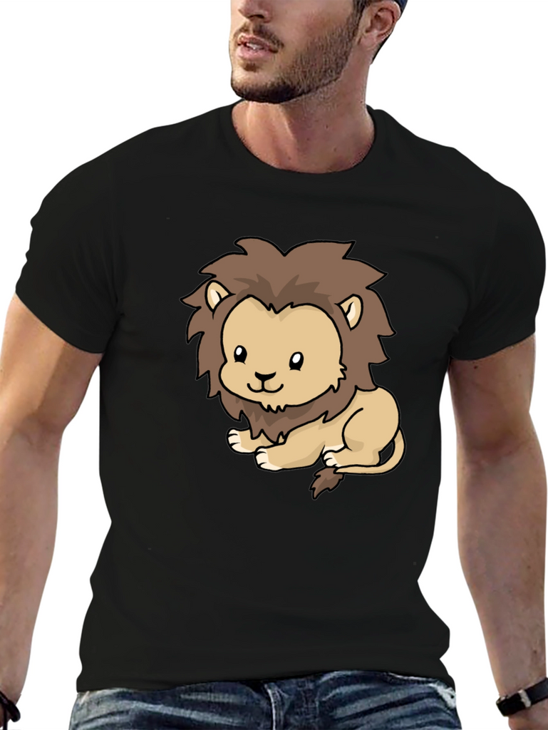 This black t-shirt features a charming cartoon lion graphic. The design showcases a cute lion with a fluffy mane, rendered in soft, inviting colors. Made from a comfortable-looking fabric, this tee is perfect for casual wear. It's an excellent choice for animal lovers or anyone who appreciates playful designs. Wear it for everyday activities, outings with friends, or simply relaxing at home. The classic cut and versatile color make it easy to pair with jeans, shorts, or skirts, creating a fun and stylish look.