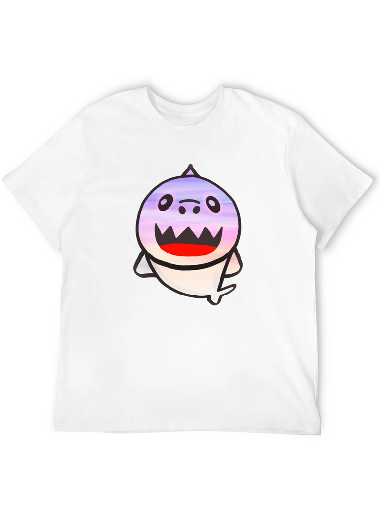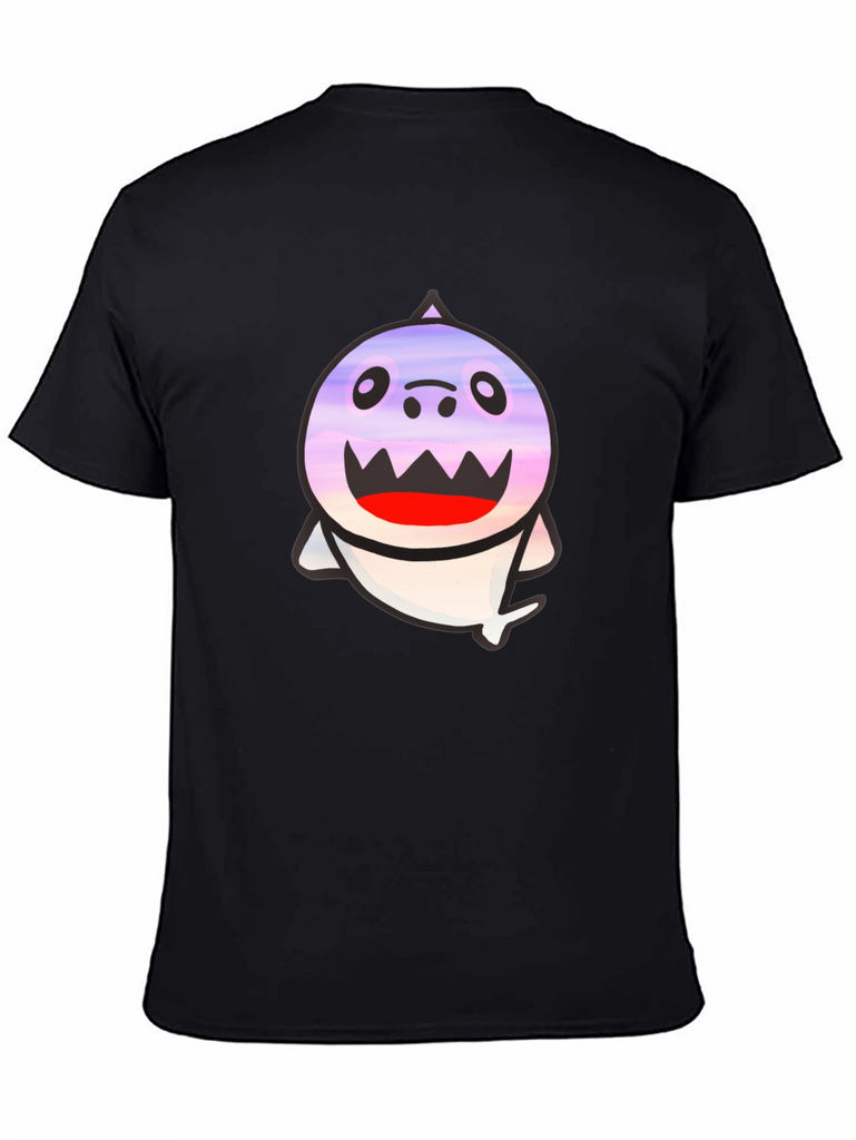 This black t-shirt features a playful cartoon shark graphic. The shark design has a gradient texture and a cheerful expression, adding a touch of whimsy to your wardrobe. Made from a soft and comfortable fabric, this tee is perfect for casual wear, whether you're hanging out with friends, running errands, or relaxing at home. The classic fit and short sleeves make it a versatile piece that can be paired with jeans, shorts, or joggers for a stylish and effortless look. Show off your fun personality with this unique and eye-catching t-shirt.