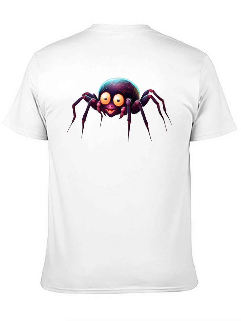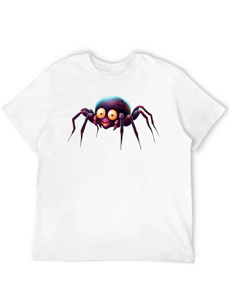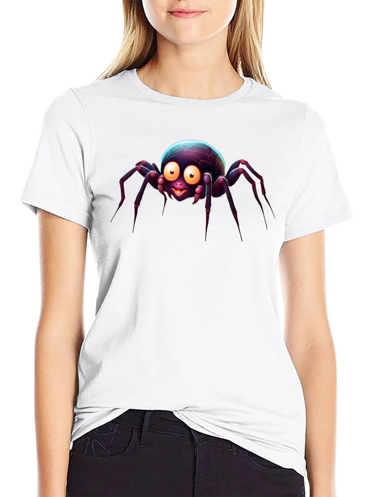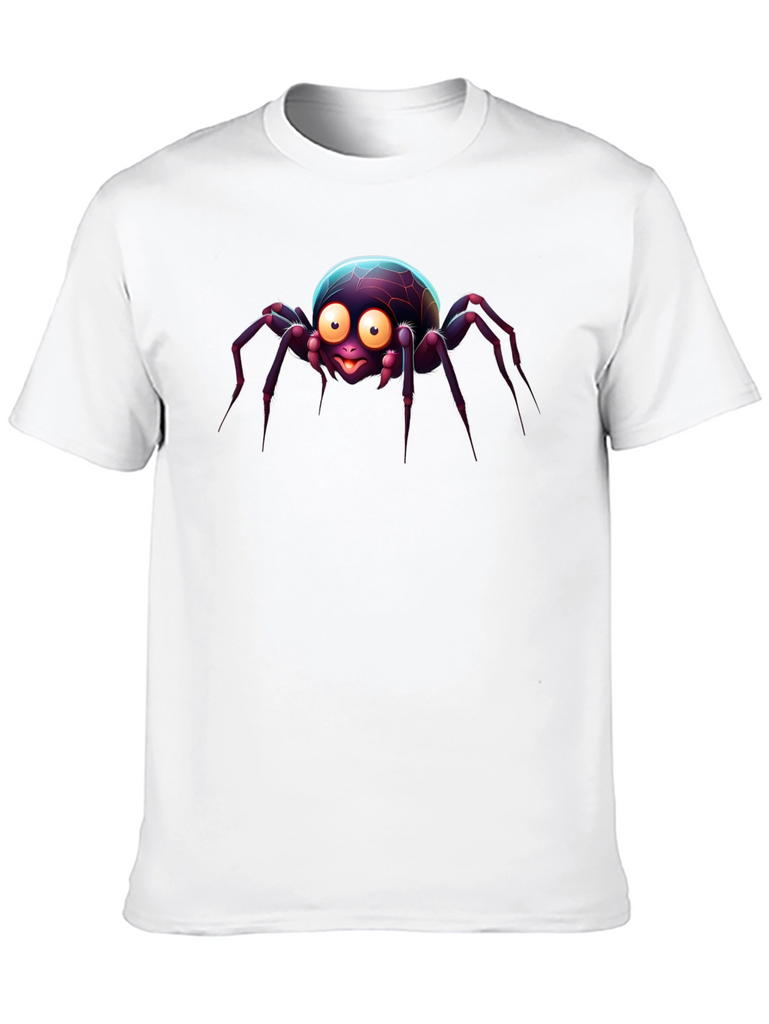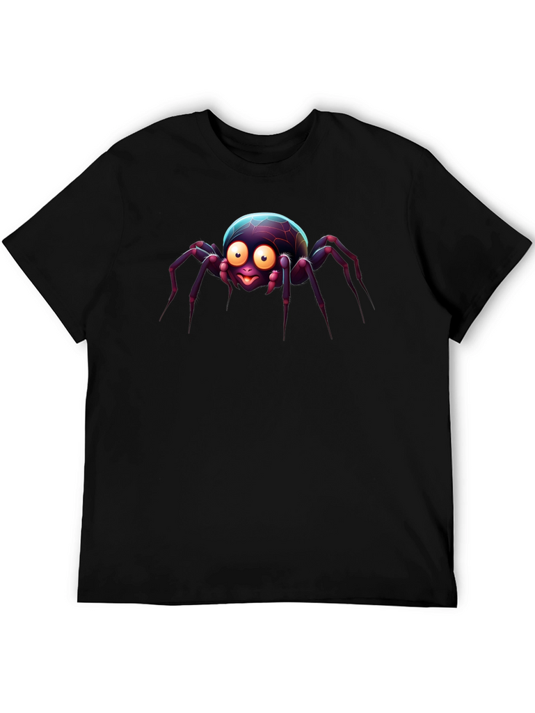 This black t-shirt features a whimsical cartoon spider design. The spider has a purple and blue body, googly eyes, and a playful expression, adding a touch of fun to your wardrobe. Made from comfortable cotton material, this tee is perfect for casual wear. The design is printed with high-quality inks for a vibrant, lasting graphic. Pair this tee with jeans, shorts, or leggings for a standout look. A perfect blend of comfort and playful style, this t-shirt will add a smile to your day. Available in multiple sizes.