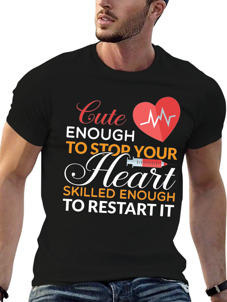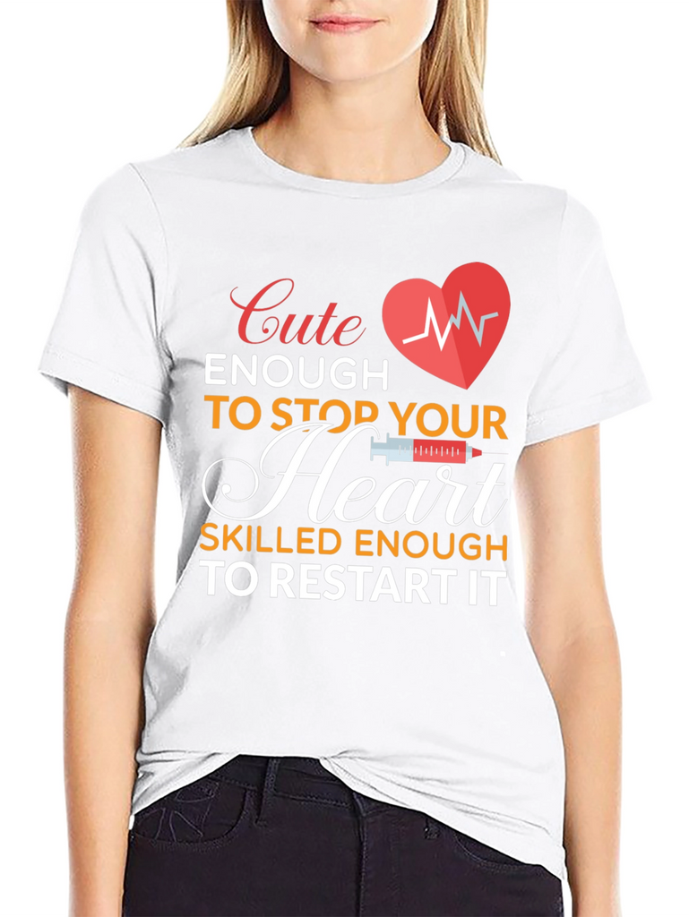 Show off your nursing skills with this bold and humorous t-shirt. This black tee features a witty slogan, "Cute Enough to Stop Your Heart, Skilled Enough to Restart It." It incorporates a red heart graphic with a heartbeat line and a syringe image, giving it a unique and professional touch. The design is sure to catch attention and spark conversation. Perfect for nurses, nursing students, or anyone in the medical field with a great sense of humor. It's a comfortable and stylish way to show off your nursing pride and skills.