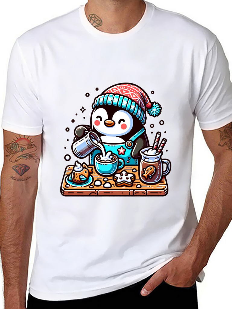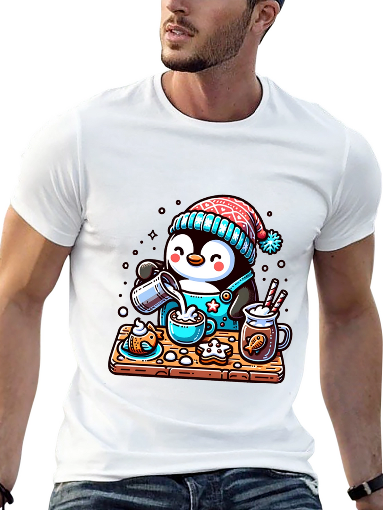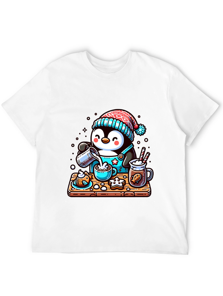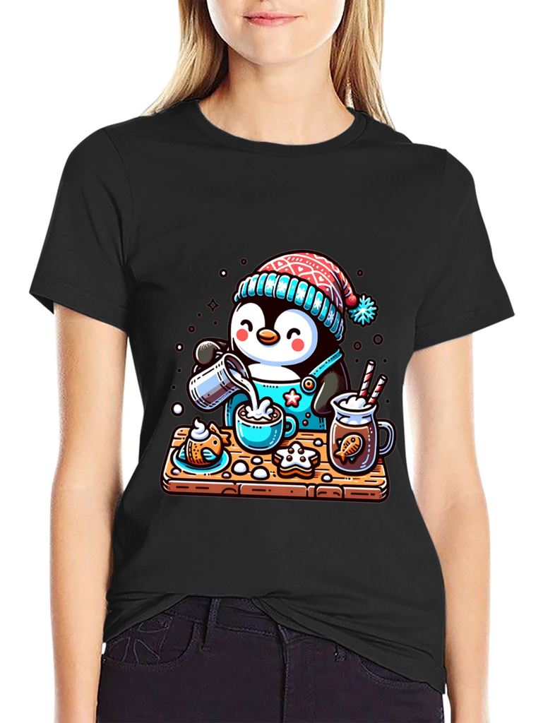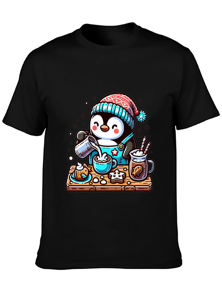 This black t-shirt features a charming graphic of an adorable penguin wearing a knitted hat and overalls. The penguin is depicted pouring milk into a cup, surrounded by cookies and other treats on a wooden surface. This whimsical design is perfect for anyone who loves cute animals, baking, or just wants to add a touch of fun to their wardrobe. Made from soft, comfortable material, this t-shirt is ideal for casual wear, whether you're lounging at home or out and about. It’s a great conversation starter and makes a delightful gift for friends and family who appreciate unique and playful designs.
