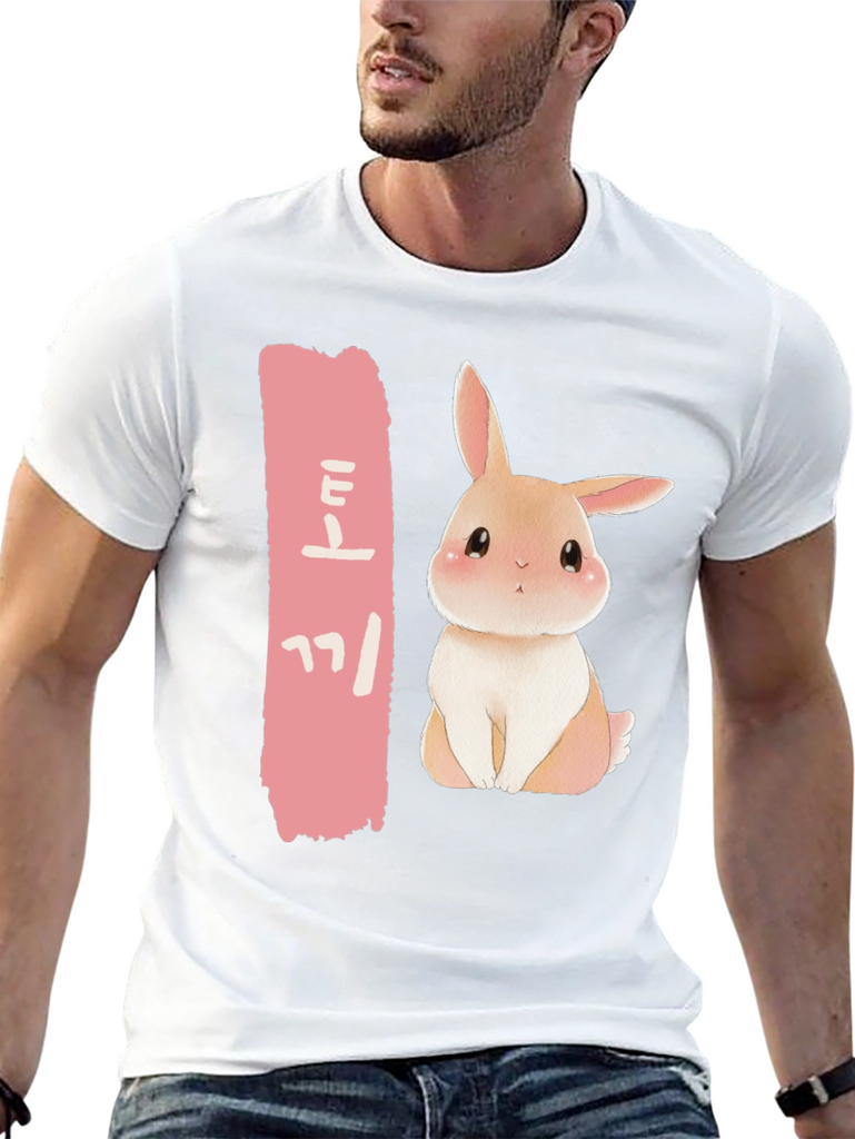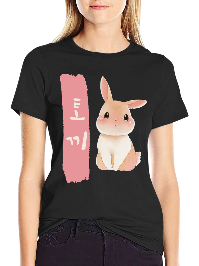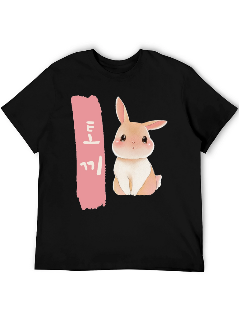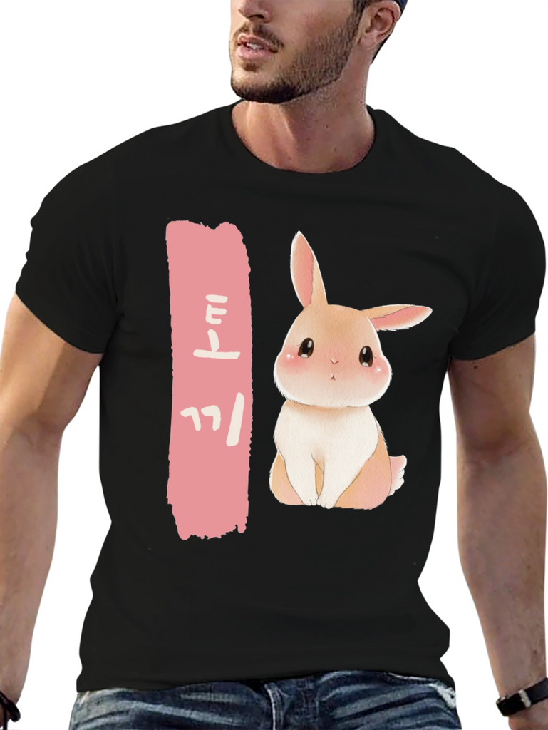 This stylish black t-shirt features an adorable cartoon rabbit graphic, perfect for adding a touch of whimsy to your wardrobe. The design includes Korean text alongside the rabbit, adding a unique cultural flair. Made from a soft, comfortable fabric, this tee is ideal for everyday wear. Show off your love for cute animals and trendy designs with this eye-catching piece. Great for casual outings, lounging at home, or as a fun gift for rabbit lovers! The graphic is vibrant and sure to grab attention. Get yours today!