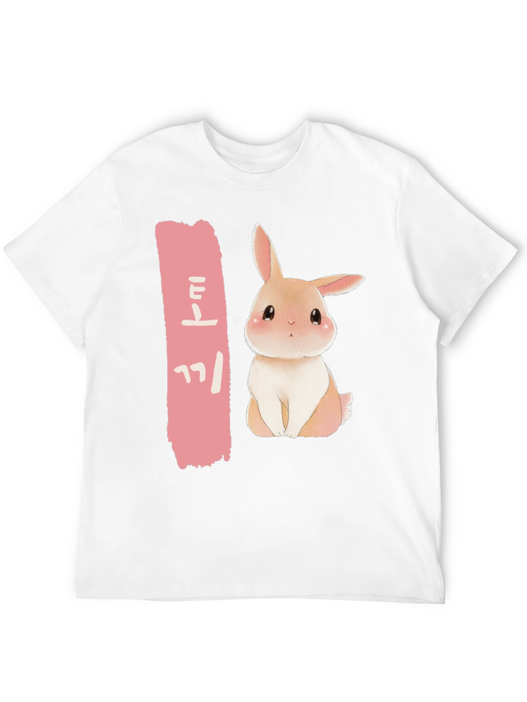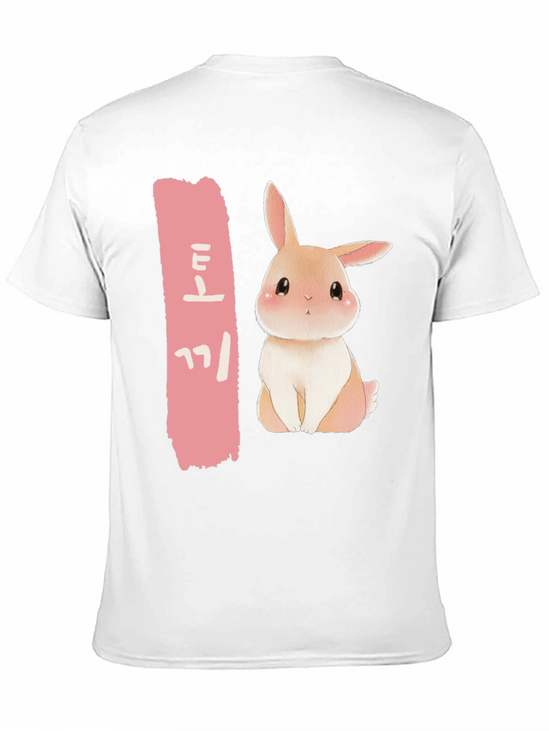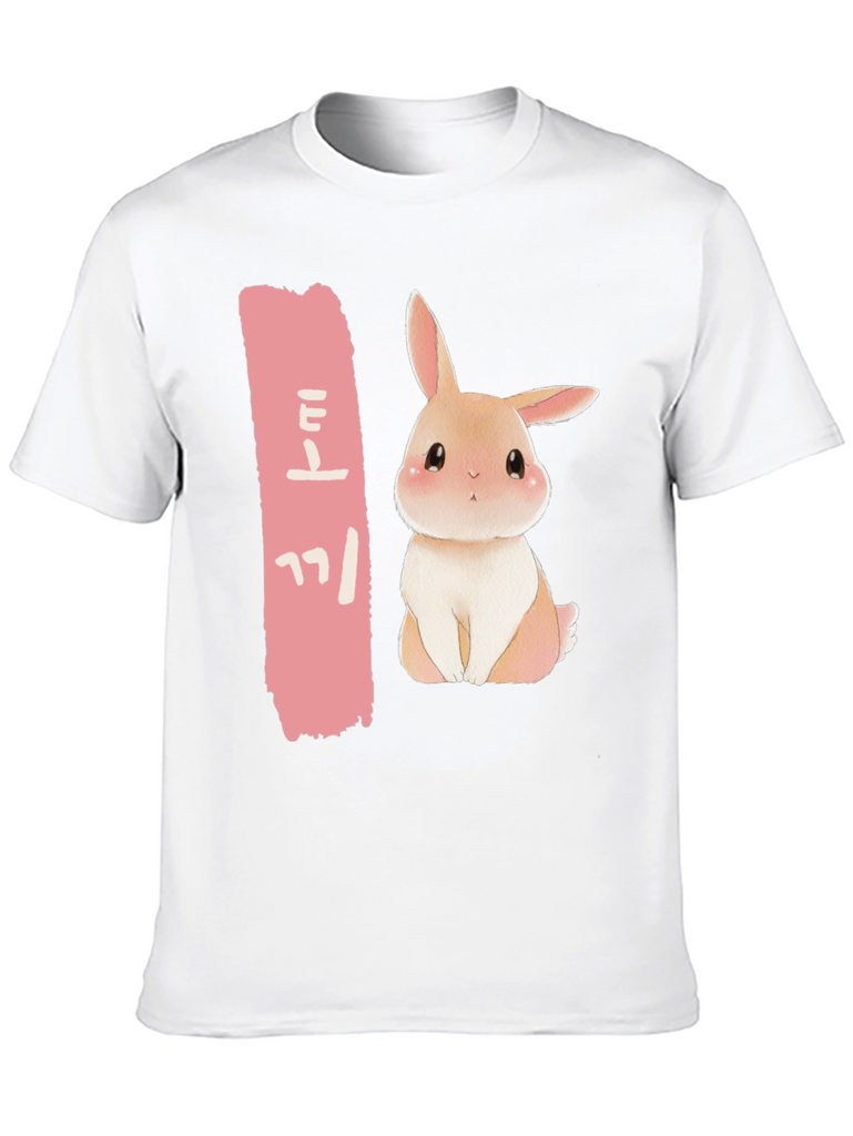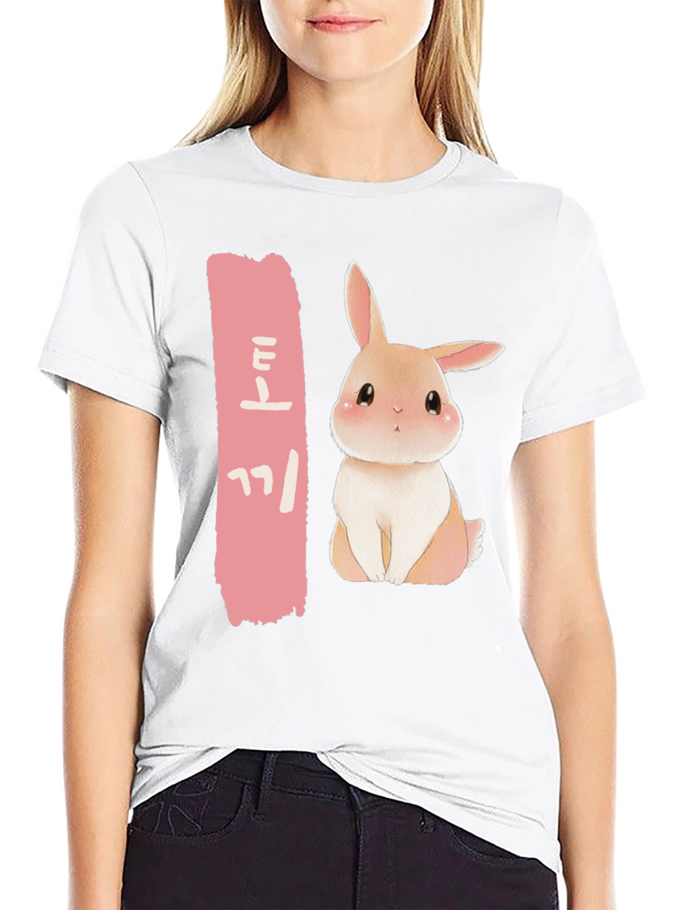 This stylish black t-shirt features an adorable cartoon rabbit graphic, perfect for adding a touch of whimsy to your wardrobe. The design includes Korean text alongside the rabbit, adding a unique cultural flair. Made from a soft, comfortable fabric, this tee is ideal for everyday wear. Show off your love for cute animals and trendy designs with this eye-catching piece. Great for casual outings, lounging at home, or as a fun gift for rabbit lovers! The graphic is vibrant and sure to grab attention. Get yours today!