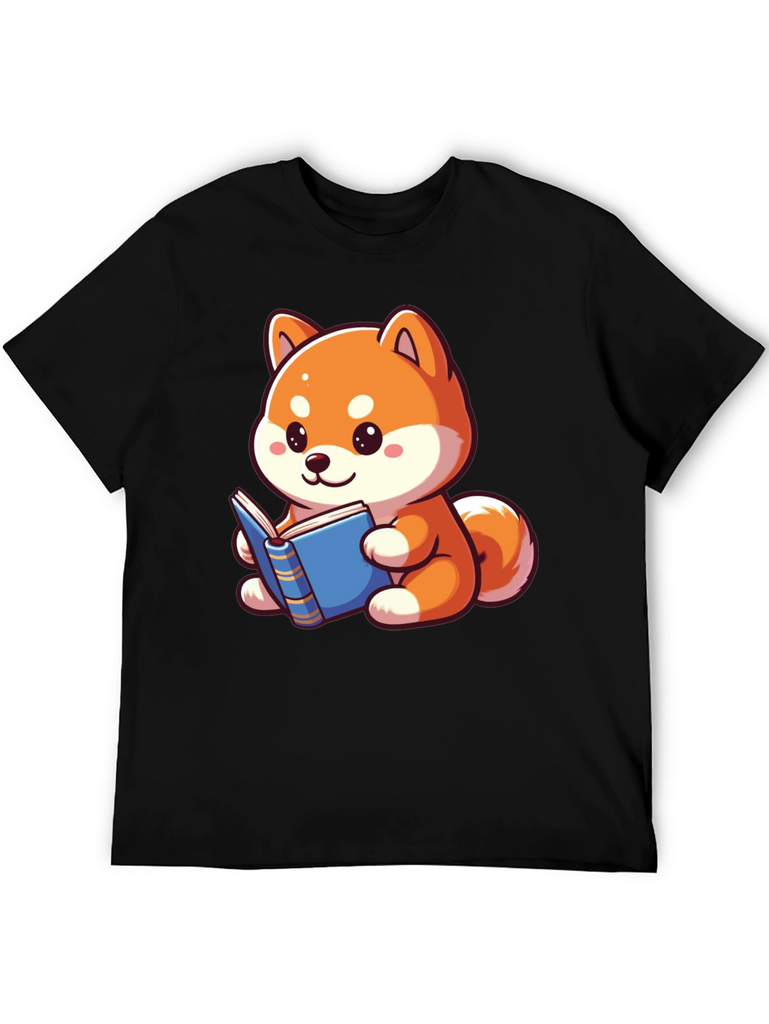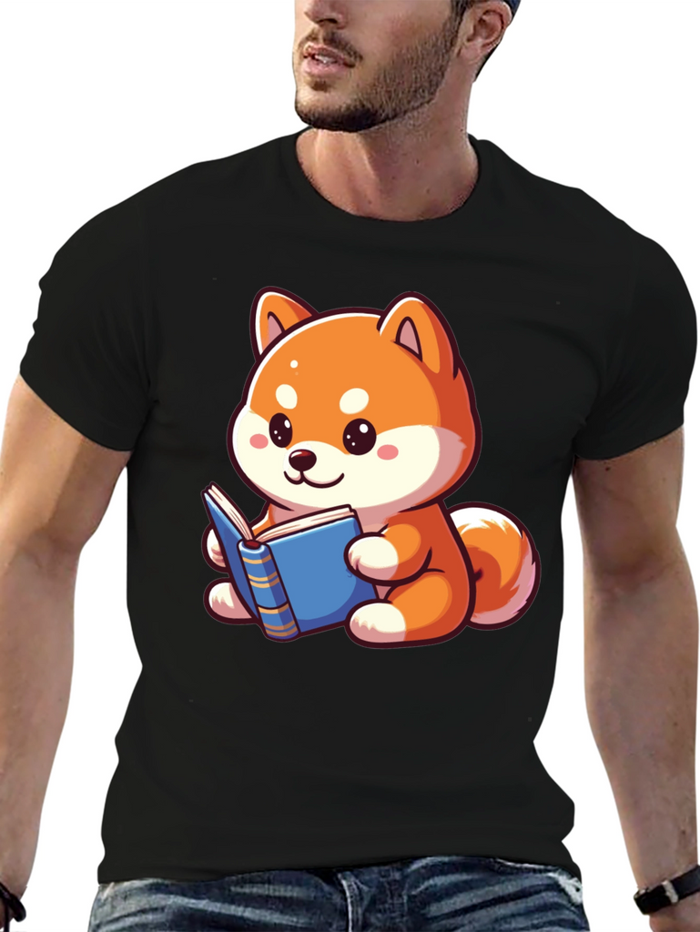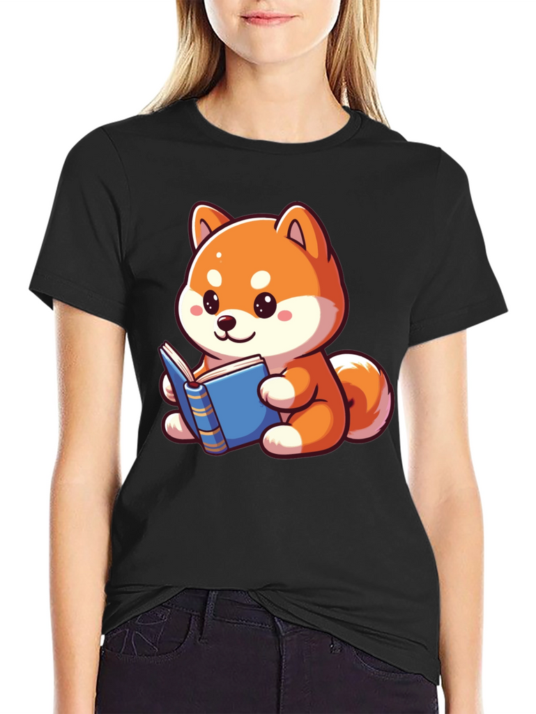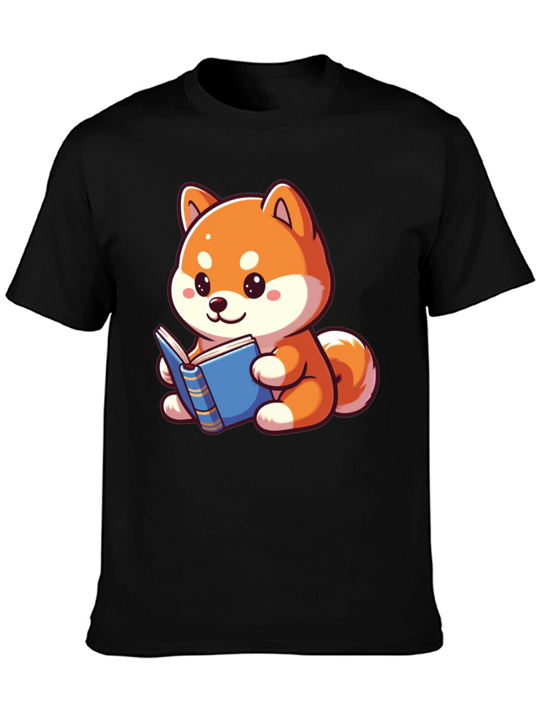 This black t-shirt features a charming cartoon illustration of a Shiba Inu dog engrossed in reading a blue book. The design is vibrant and eye-catching, perfect for dog lovers and bookworms alike. Made from comfortable, breathable fabric, this shirt is ideal for casual wear. The print is high-quality, ensuring it remains vibrant even after multiple washes. Wear it to the library, the park, or simply while relaxing at home. This t-shirt is sure to bring a smile to everyone's face and makes a wonderful gift for friends and family who appreciate cute and quirky designs. A must-have addition to any wardrobe!