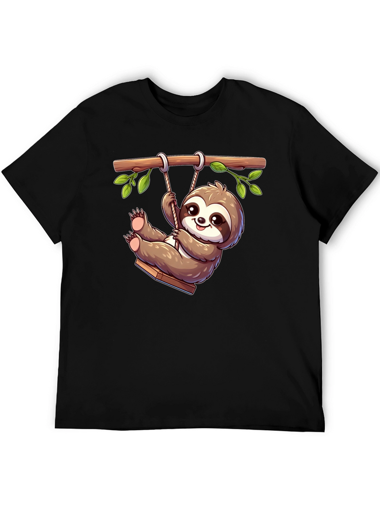 Show off your playful side with this adorable black t-shirt featuring a charming cartoon sloth on a swing! This eye-catching design showcases a happy sloth hanging from a tree branch, adding a touch of whimsy to your wardrobe. Made from a comfortable, breathable fabric, this tee is perfect for casual wear, lounging at home, or making a fun statement wherever you go. The vibrant and detailed graphic print is sure to turn heads and spark conversations. A great gift idea for sloth lovers and anyone who enjoys unique, lighthearted fashion. Get yours today and swing into style!