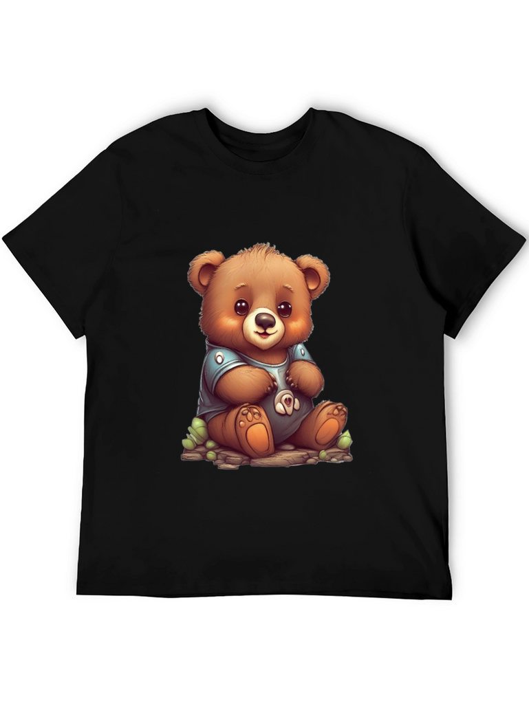 Embrace your playful side with this adorable black tee featuring a charming teddy bear graphic. The design showcases a cuddly brown bear sitting amidst lush greenery and rocky terrain, wearing a light blue shirt with button accents. The soft, high-quality fabric ensures a comfortable fit, making it perfect for everyday wear. This shirt is a great conversation starter and adds a touch of whimsy to any outfit. Ideal for casual outings, relaxed days at home, or as a thoughtful gift for bear lovers.