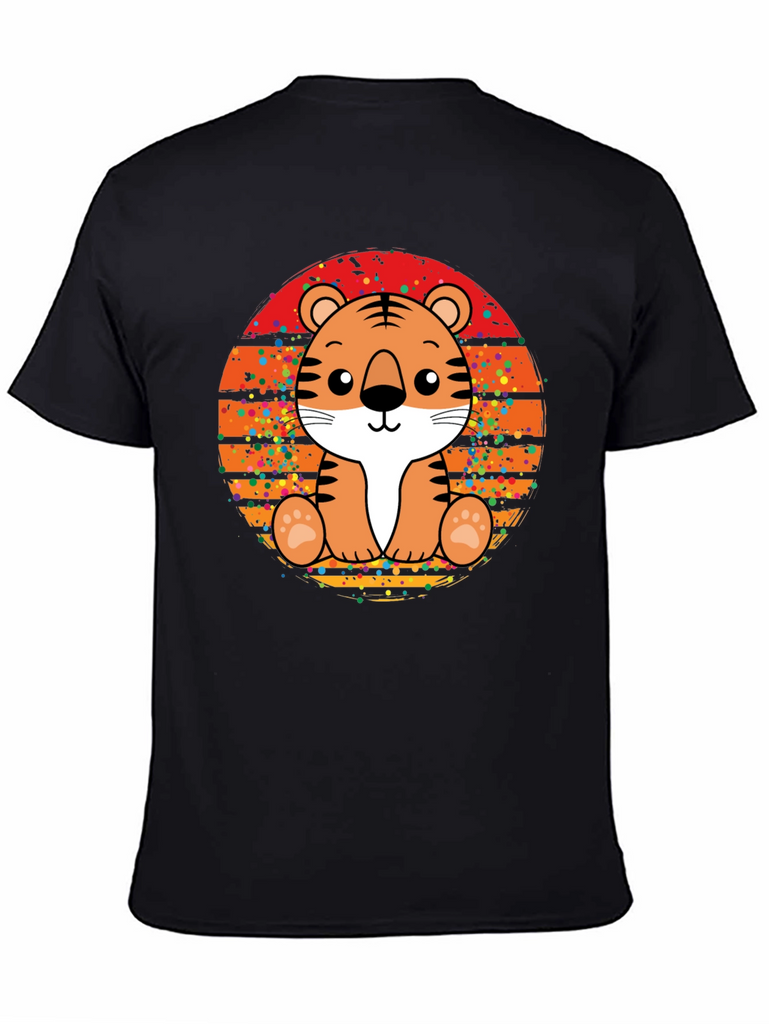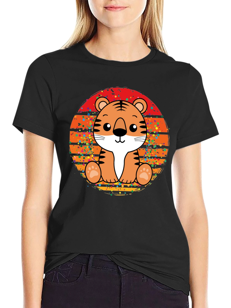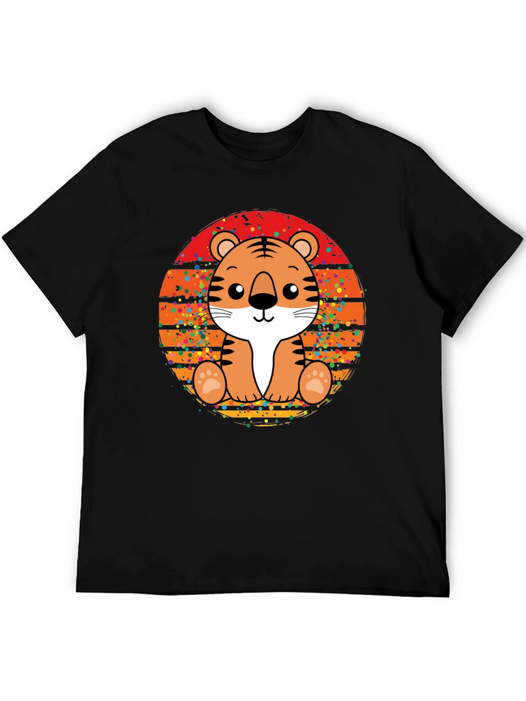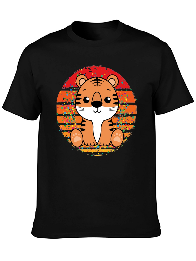 This black t-shirt features a charming cartoon tiger cub graphic against a vibrant sunset backdrop. The tiger is sitting upright with adorable features, creating a playful and endearing design. Speckles of bright confetti add a whimsical touch. Made from a comfortable cotton blend, this tee is perfect for everyday wear. Ideal for casual outings, lounging at home, or as a fun gift for animal lovers. The eye-catching graphic makes it a statement piece that's sure to spark joy. Its relaxed fit ensures all-day comfort, making it a wardrobe staple you'll reach for time and again. This t-shirt offers both style and comfort.