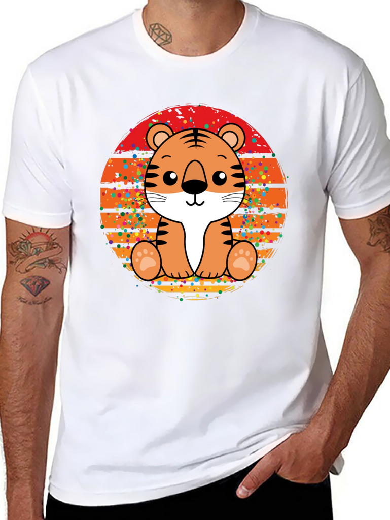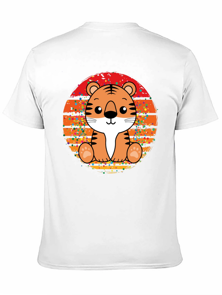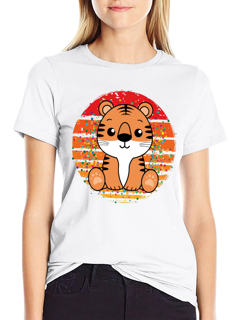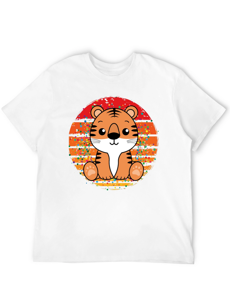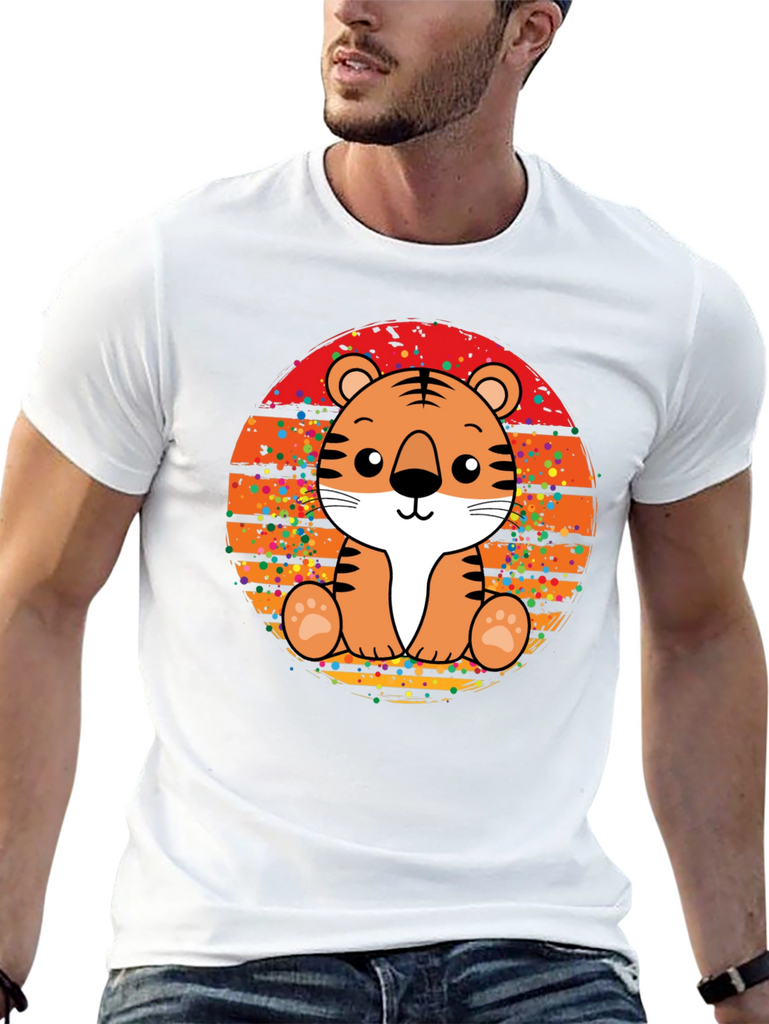 This black t-shirt features a charming cartoon tiger cub graphic against a vibrant sunset backdrop. The tiger is sitting upright with adorable features, creating a playful and endearing design. Speckles of bright confetti add a whimsical touch. Made from a comfortable cotton blend, this tee is perfect for everyday wear. Ideal for casual outings, lounging at home, or as a fun gift for animal lovers. The eye-catching graphic makes it a statement piece that's sure to spark joy. Its relaxed fit ensures all-day comfort, making it a wardrobe staple you'll reach for time and again. This t-shirt offers both style and comfort.