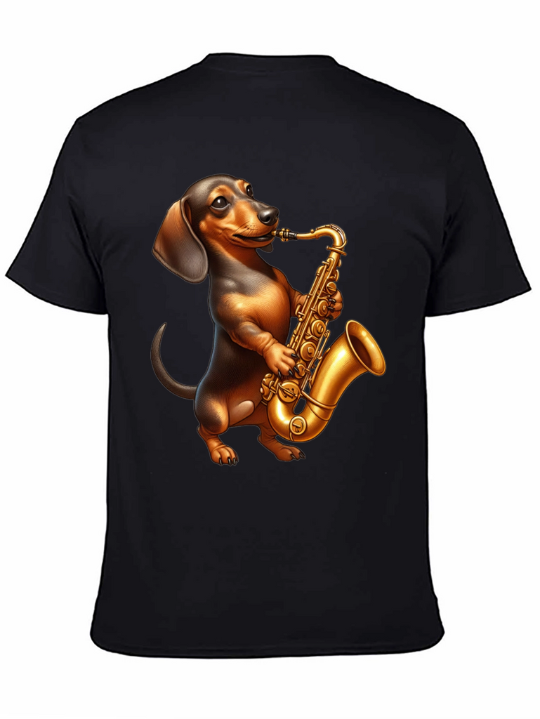 Show off your love for music and Dachshunds with this unique t-shirt! This eye-catching design features an adorable Dachshund dog playing a golden saxophone. The shirt appears to be made of a comfortable, soft cotton blend, perfect for everyday wear. The black background makes the vibrant graphic pop. This tee is a fun conversation starter, ideal for casual outings, music events, or simply relaxing at home. It's a great gift for dog lovers, musicians, and anyone with a sense of humor. Get yours now and let the music play!